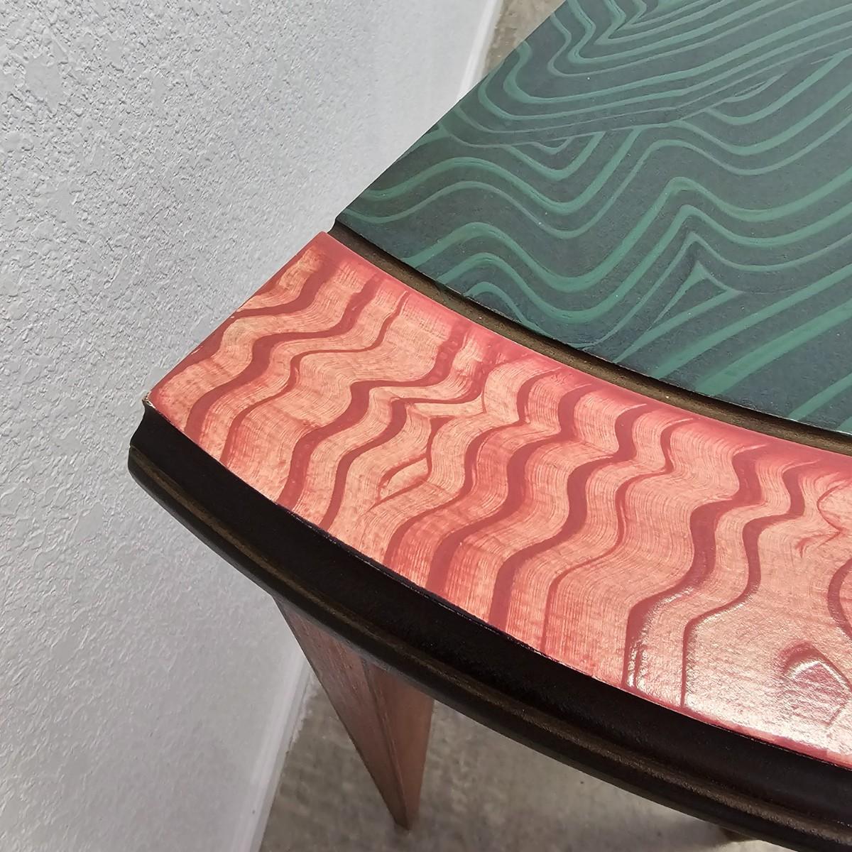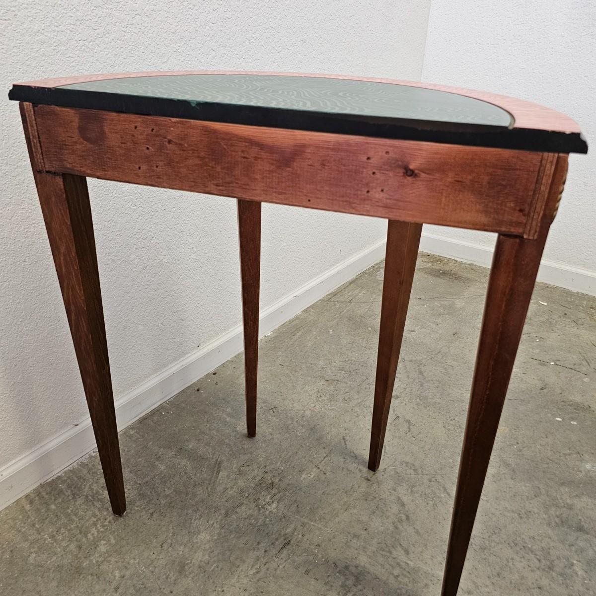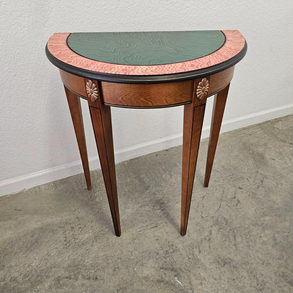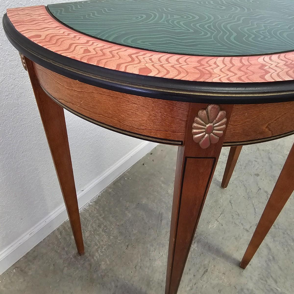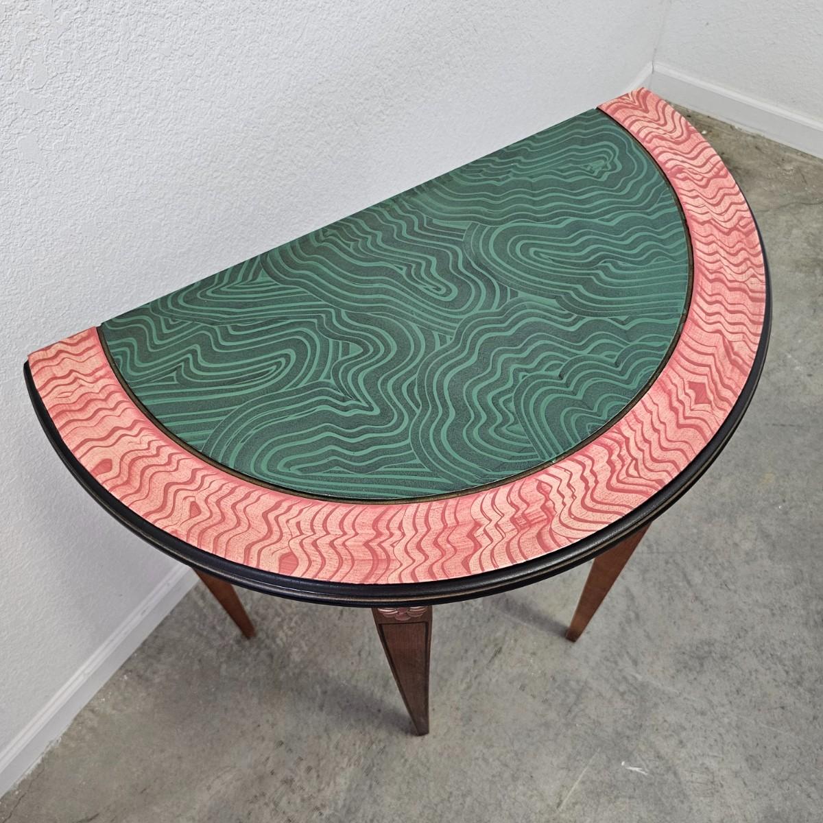 Unique half round demilune style table, decorated in pink and green. Table has wavy line patterning, pencil post tapered legs and medallions. Table measures 25" x 24" x 29"H. See photos for details. Local pickup only.