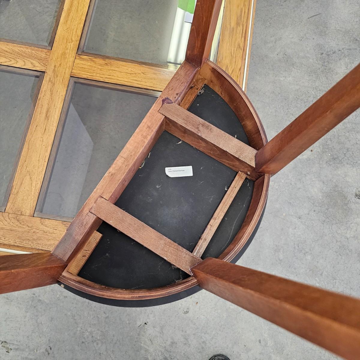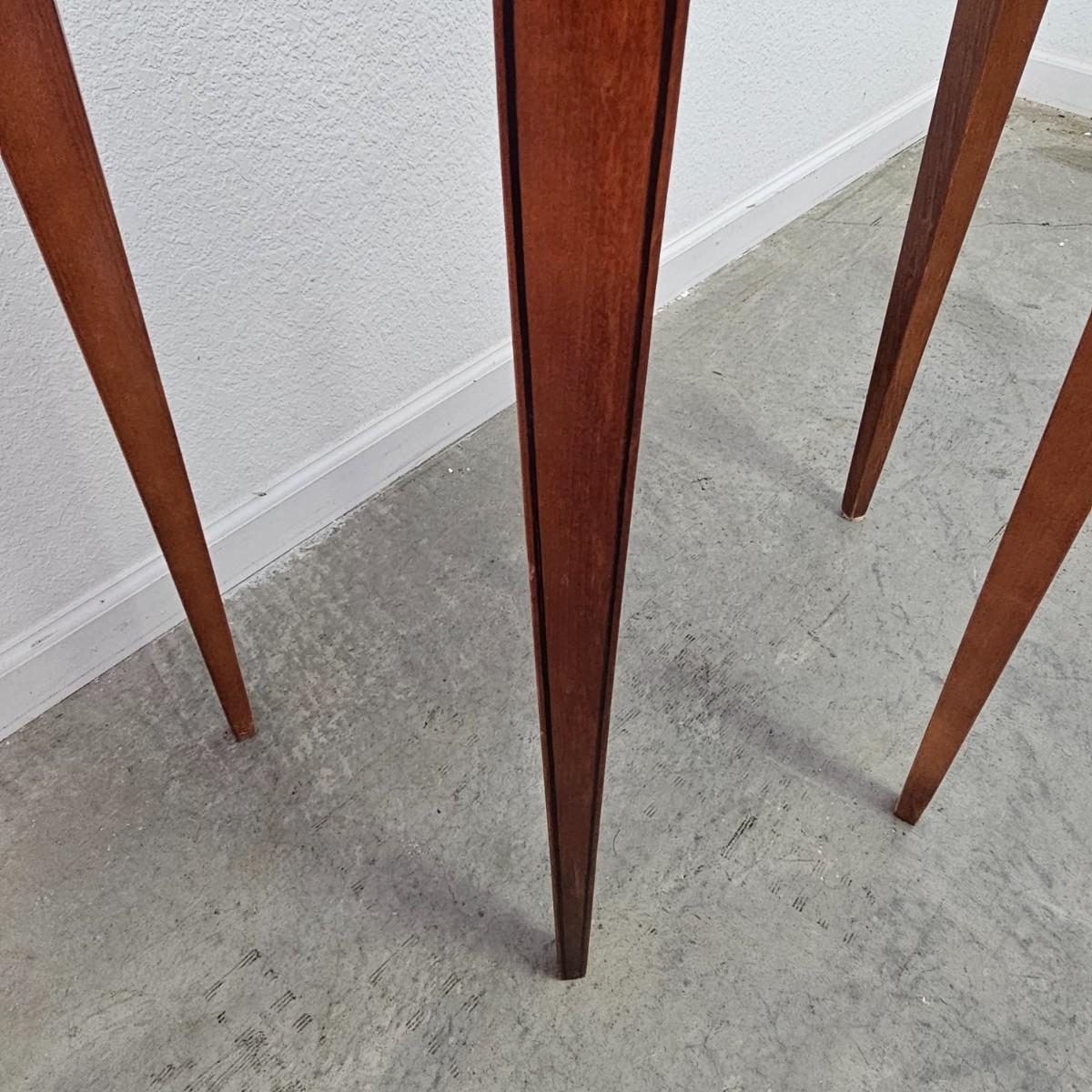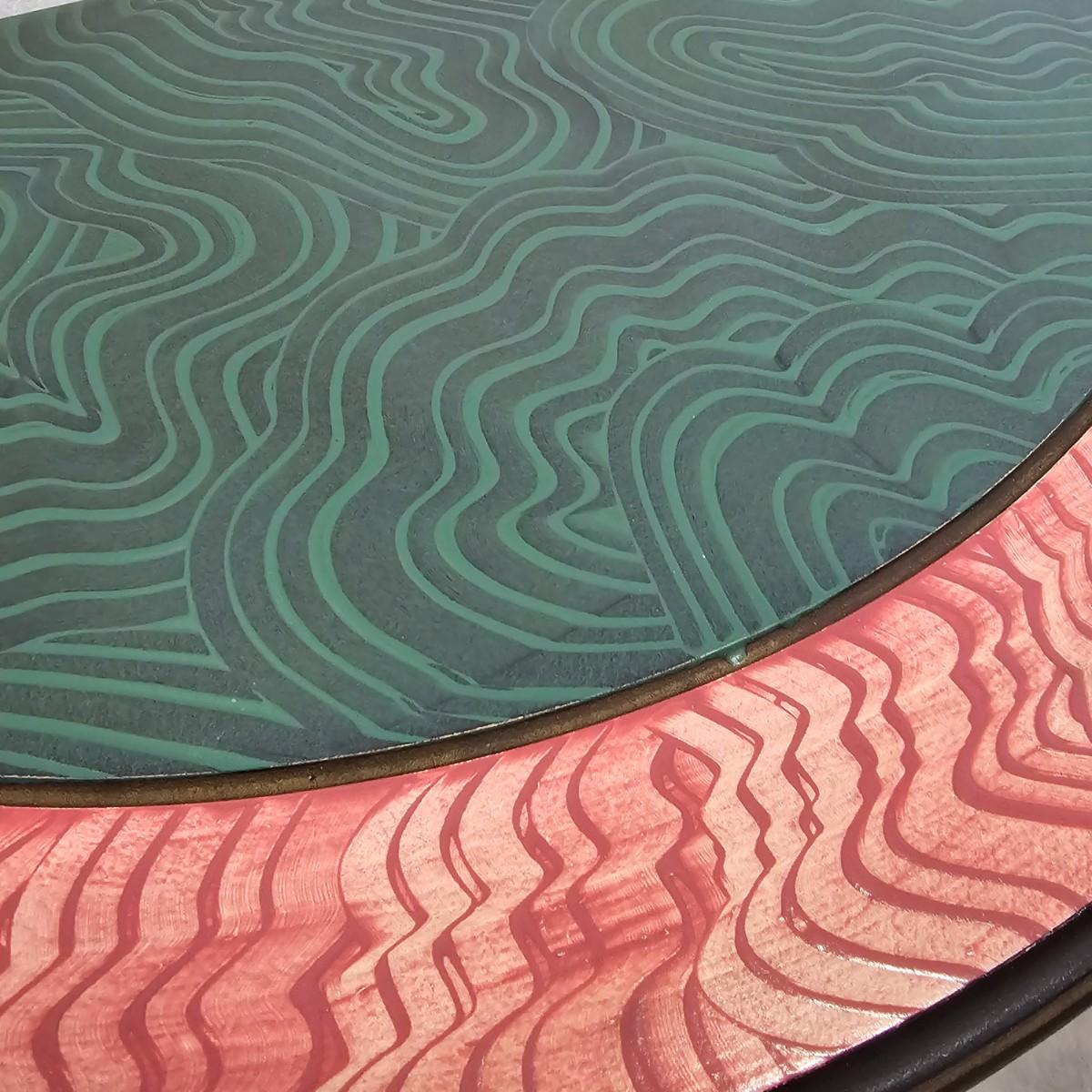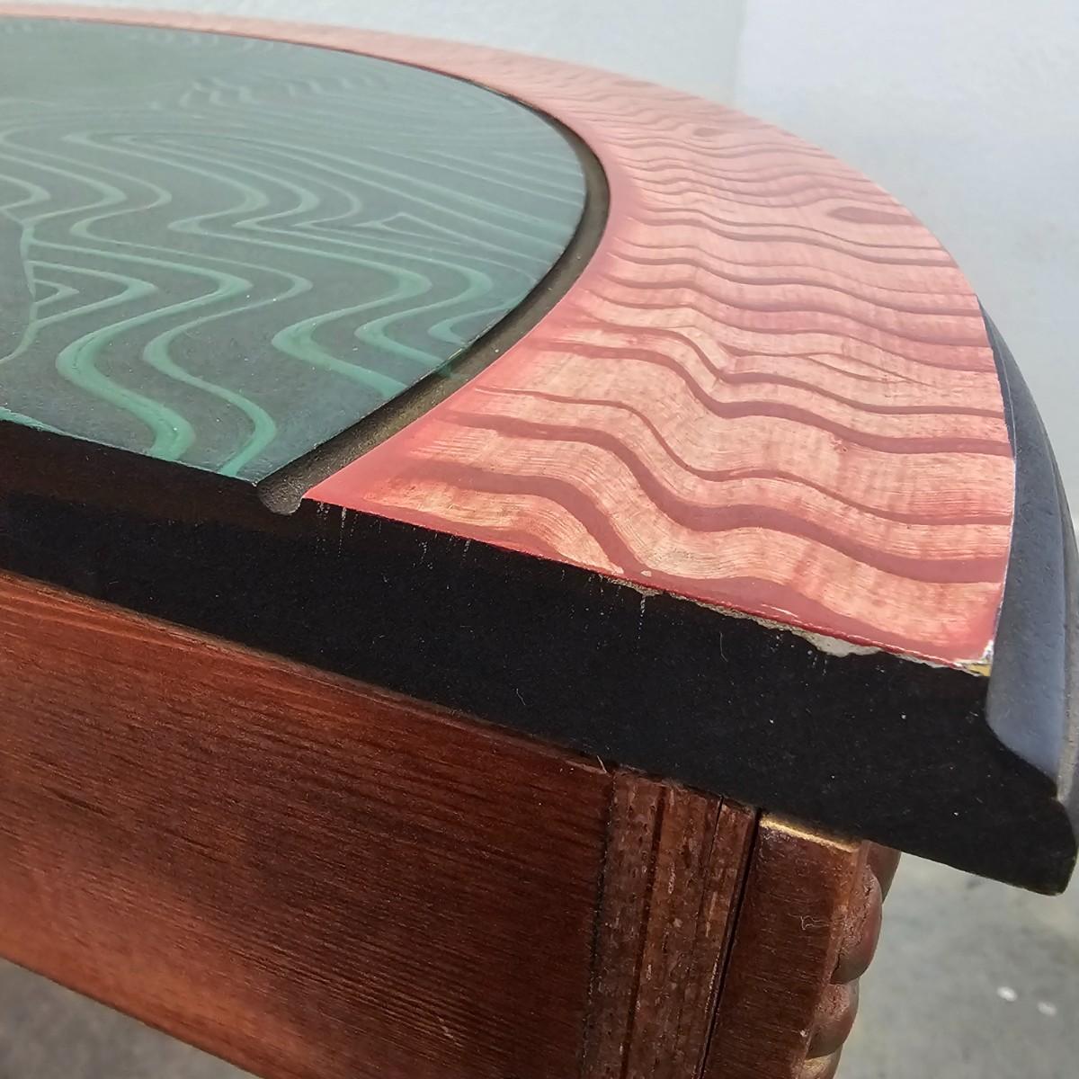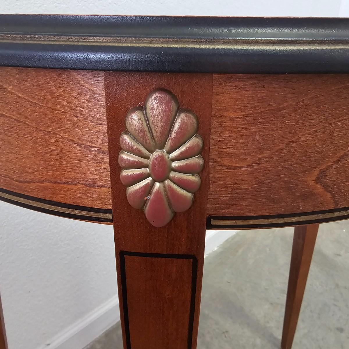 Unique half round demilune style table, decorated in pink and green. Table has wavy line patterning, pencil post tapered legs and medallions. Table measures 25" x 24" x 29"H. See photos for details. Local pickup only.