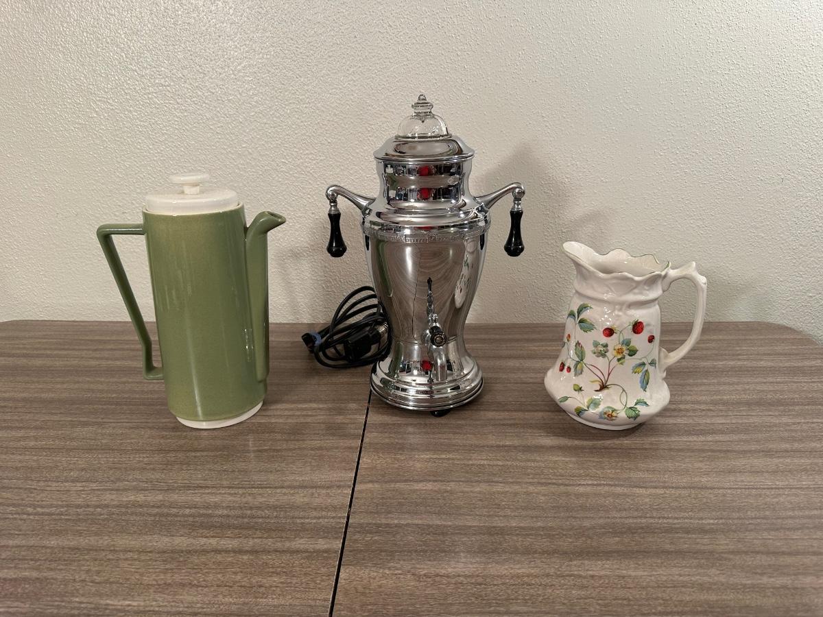 FANCY PERCOLATOR W/SPIGOT, BEVERAGE SERVER W/LID AND A PITCHER MADE IN ENGLAND