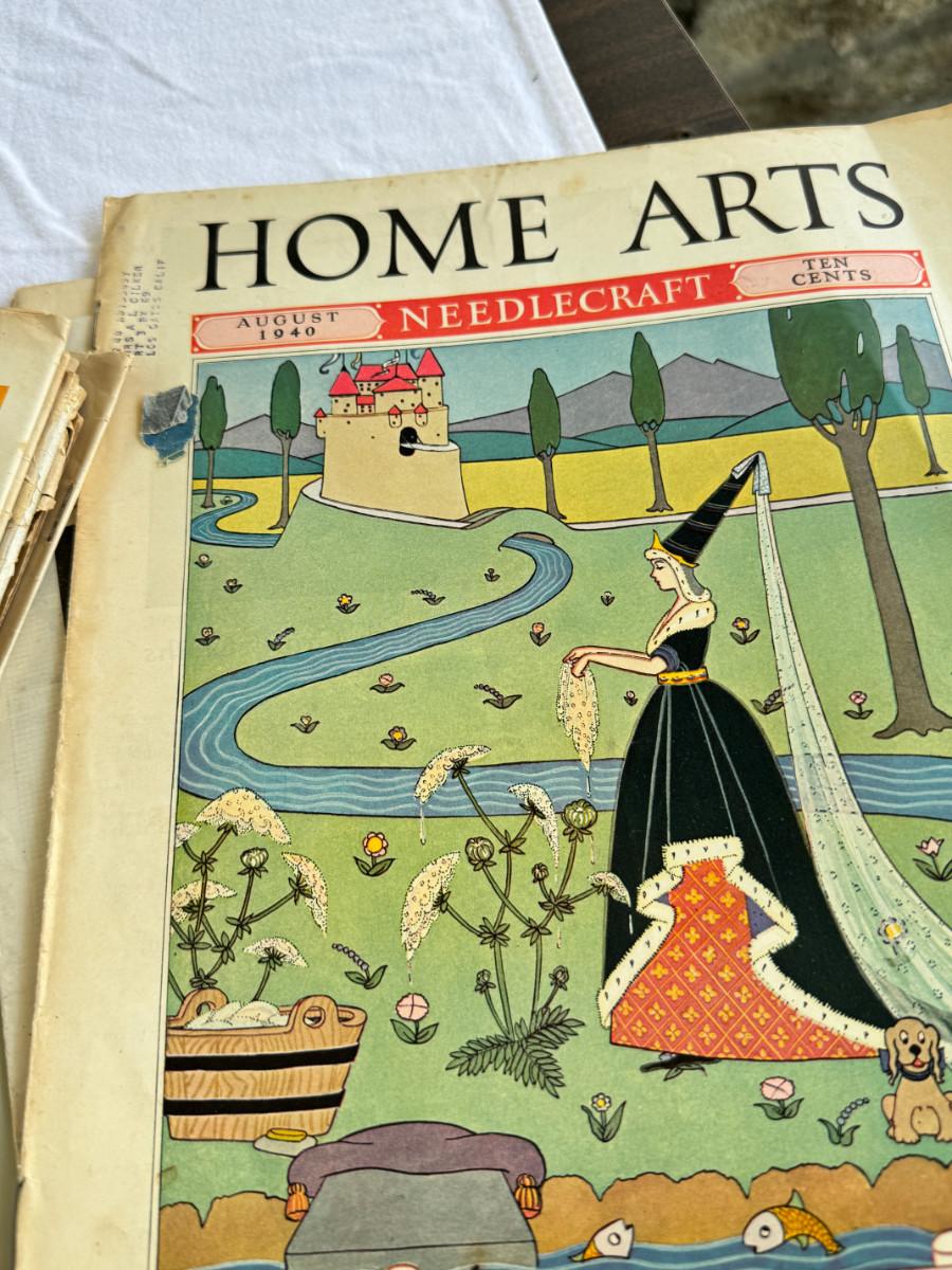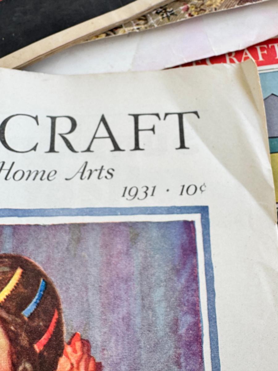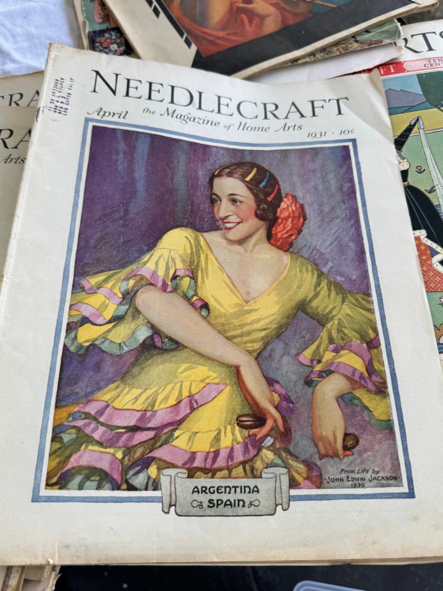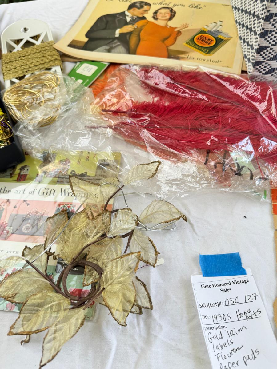 1930s Needlecraft magazines, feathers, wrapping supplies.