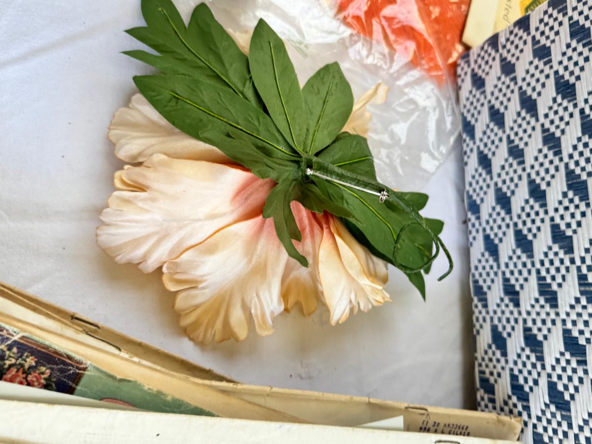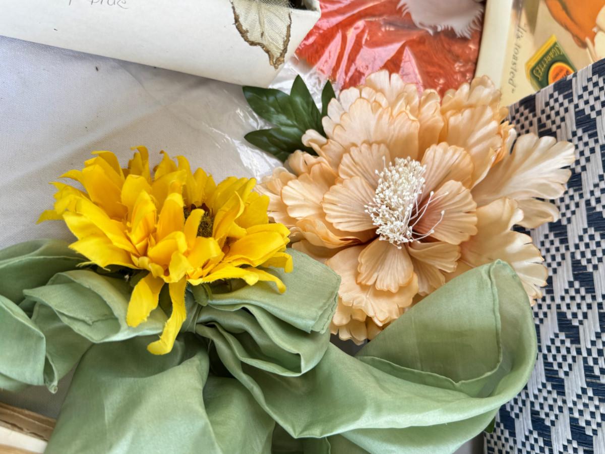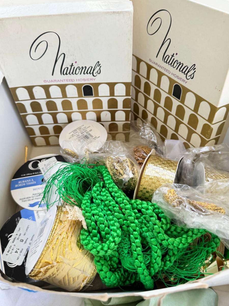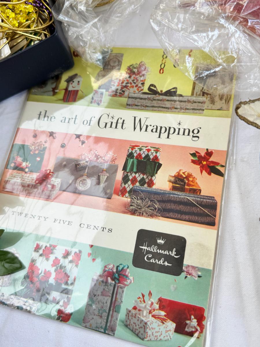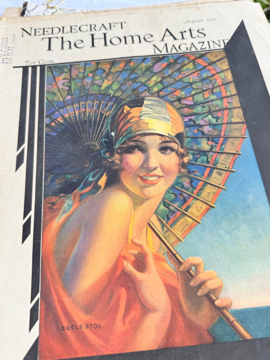 1930s Needlecraft magazines, feathers, wrapping supplies.
