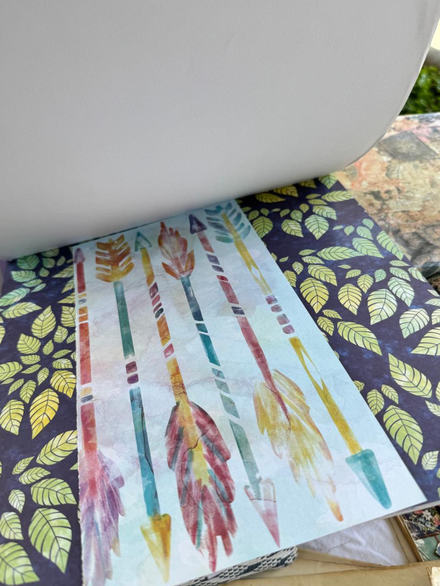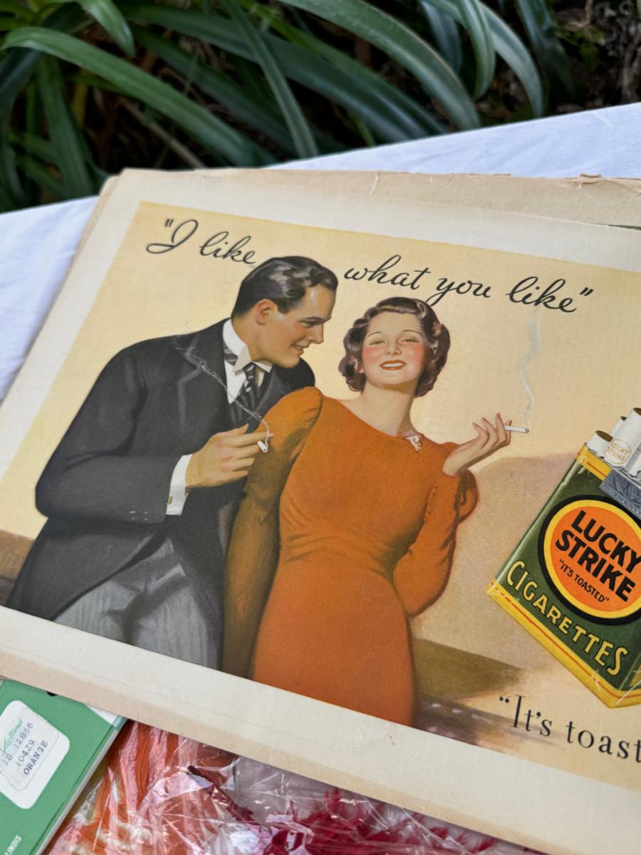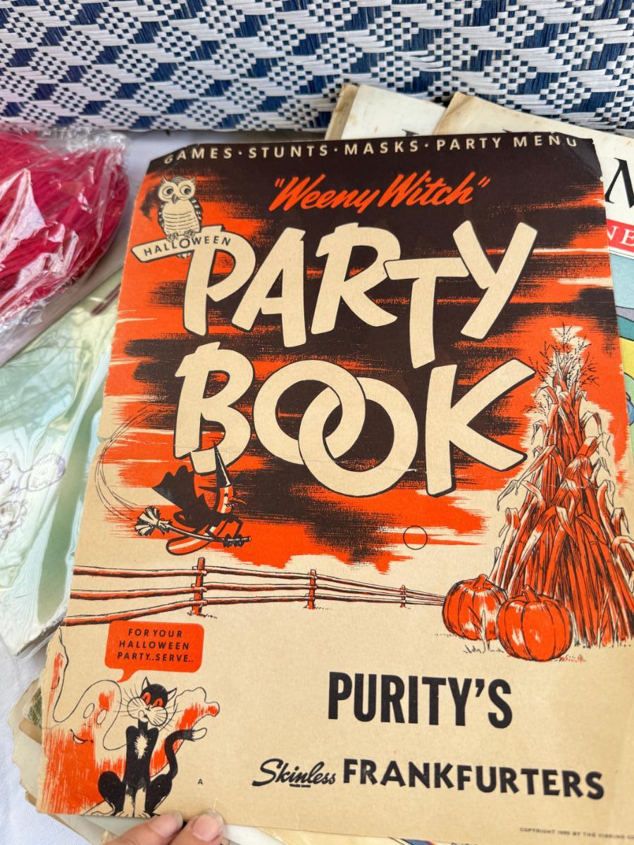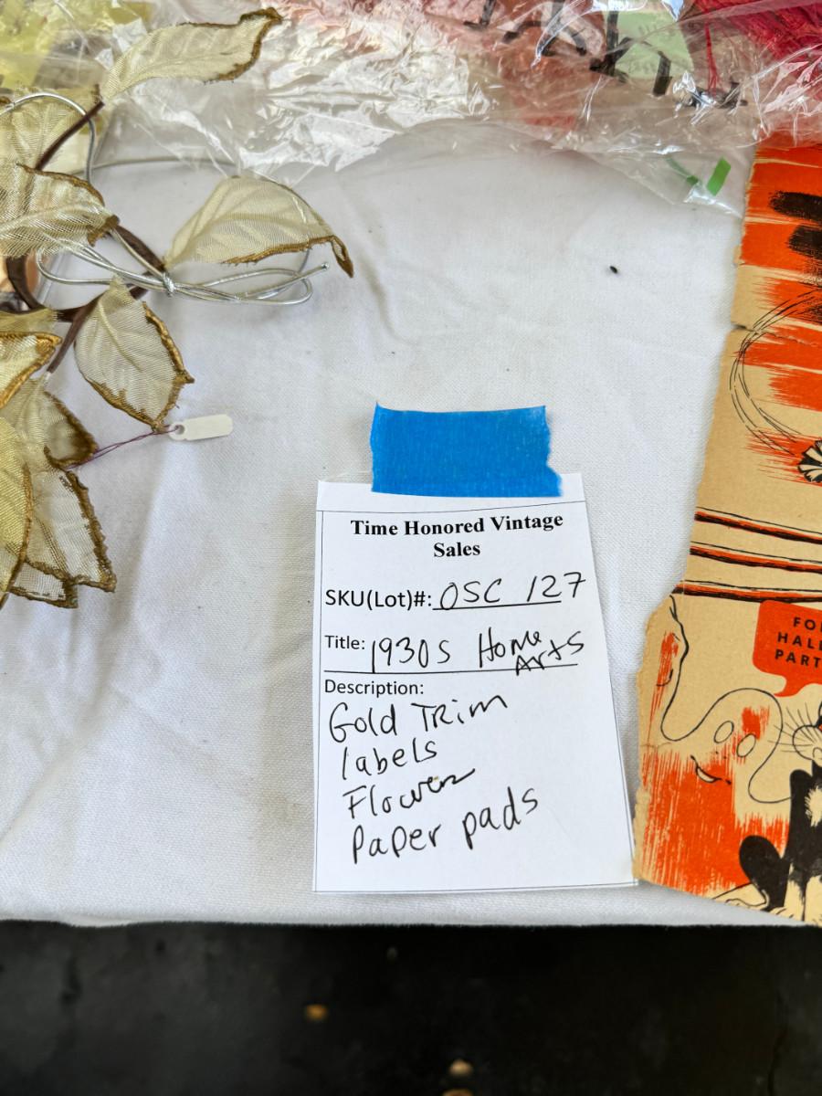 1930s Needlecraft magazines, feathers, wrapping supplies.