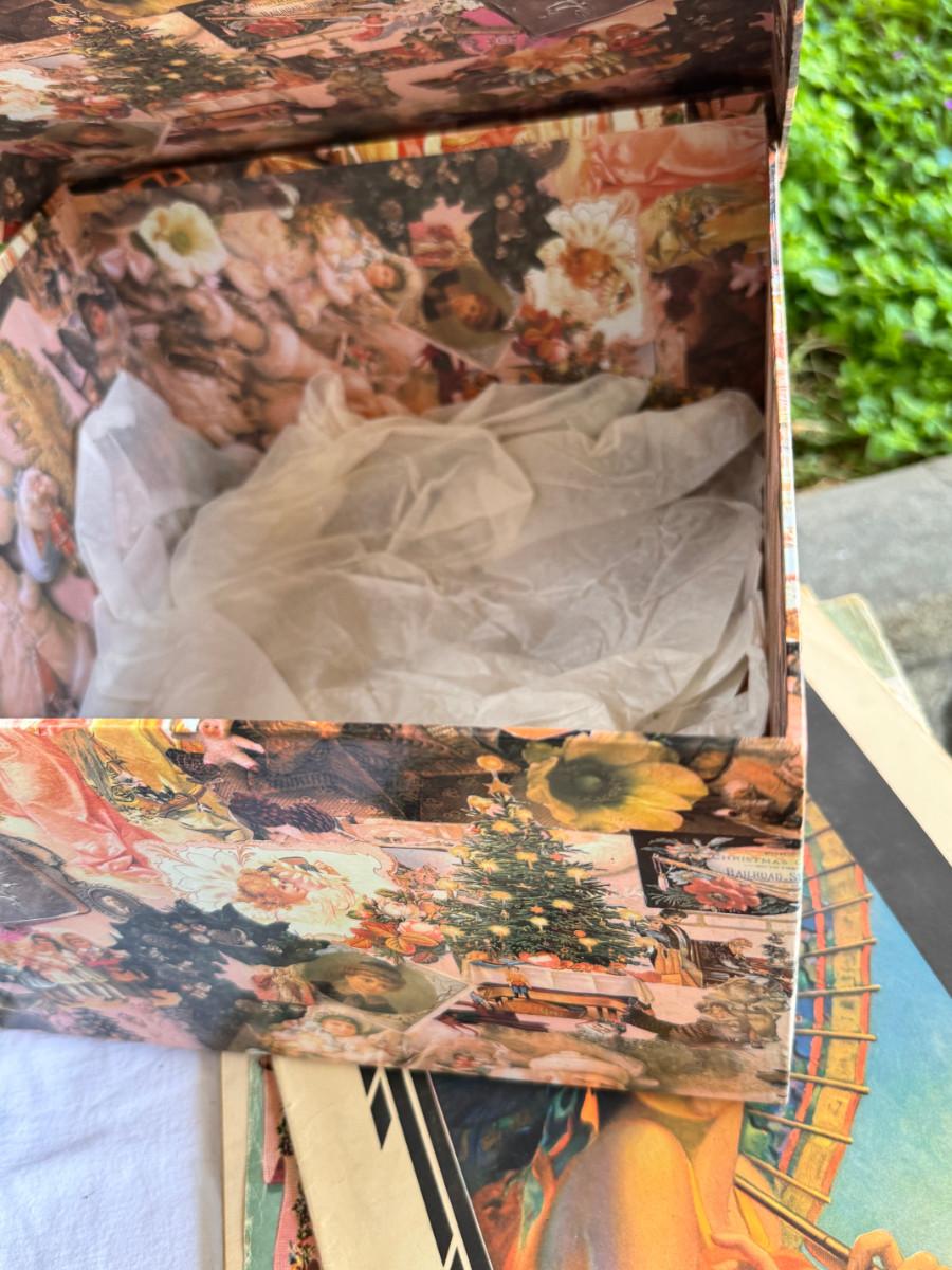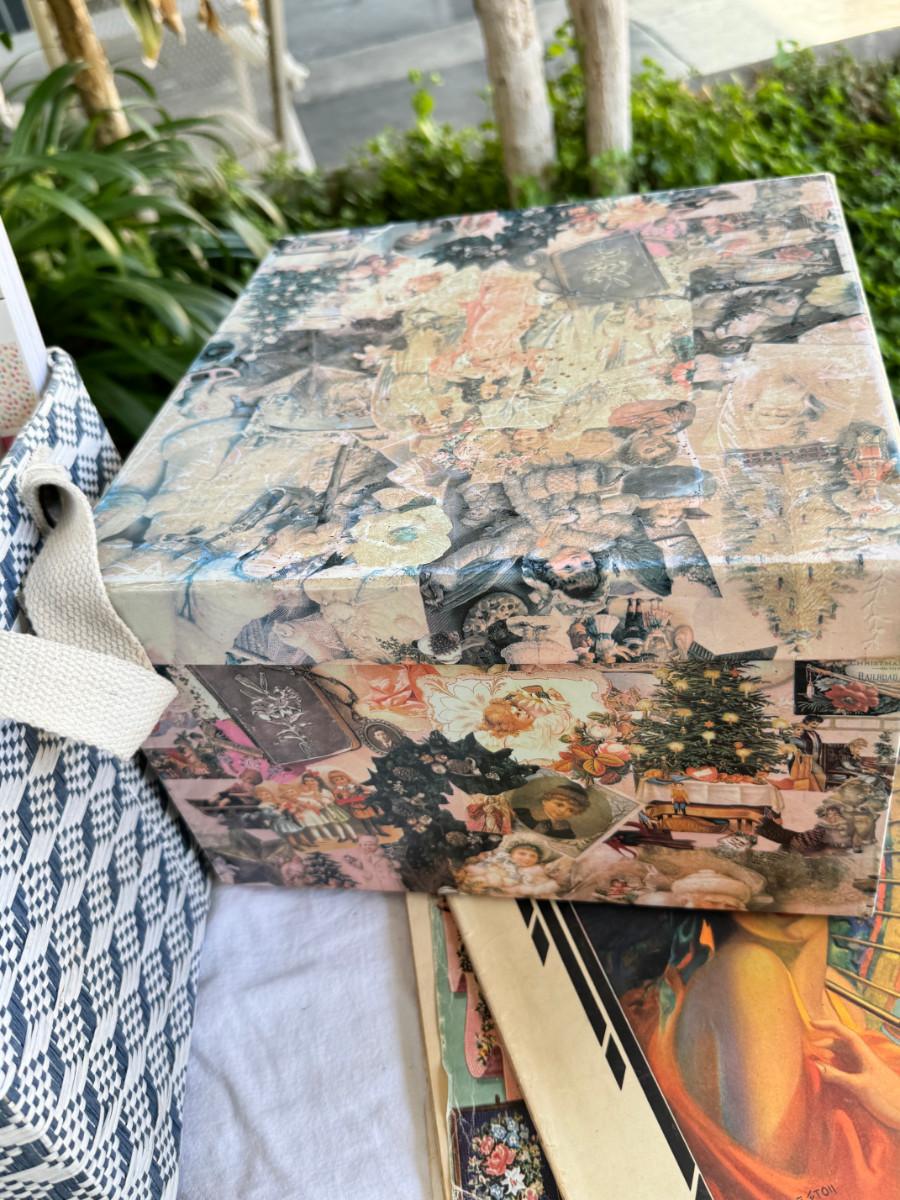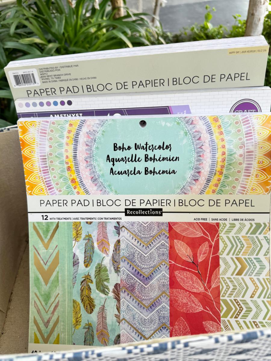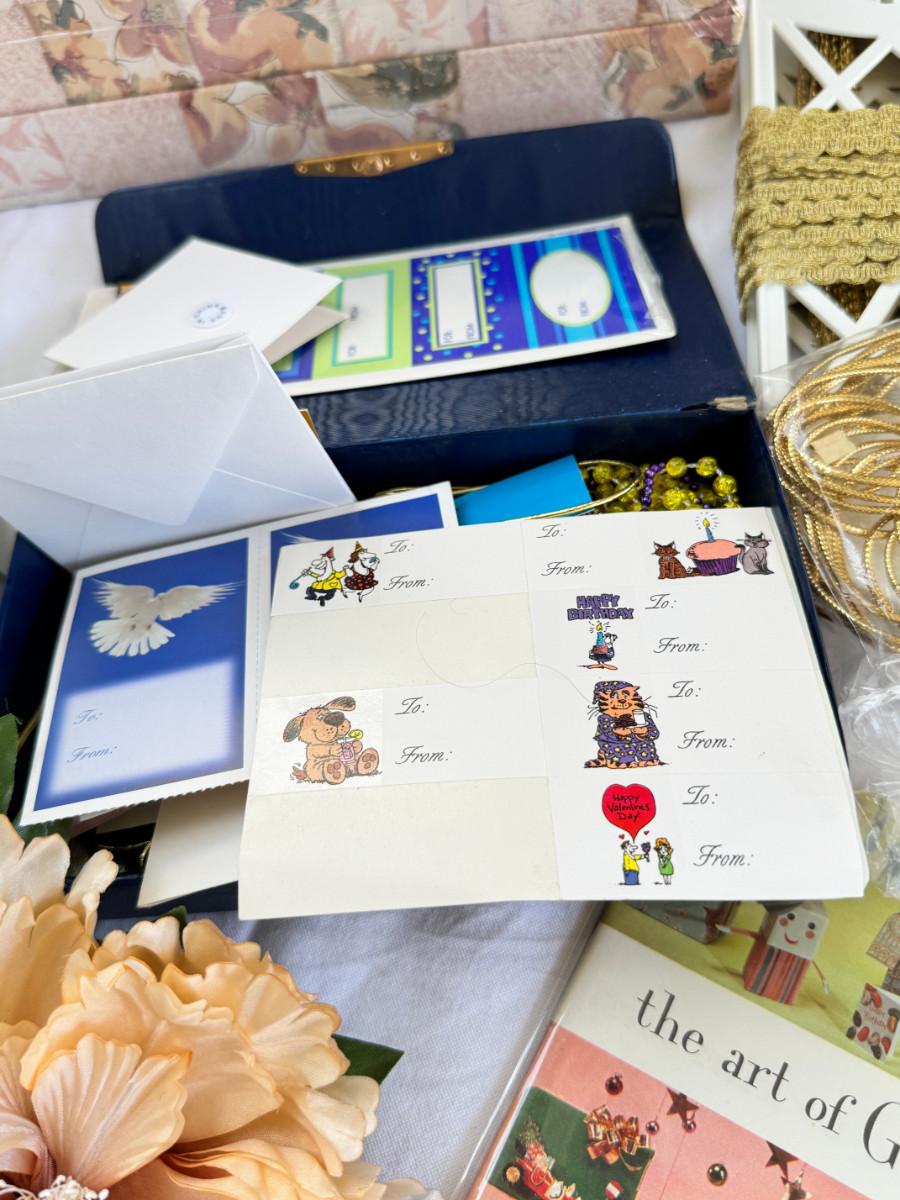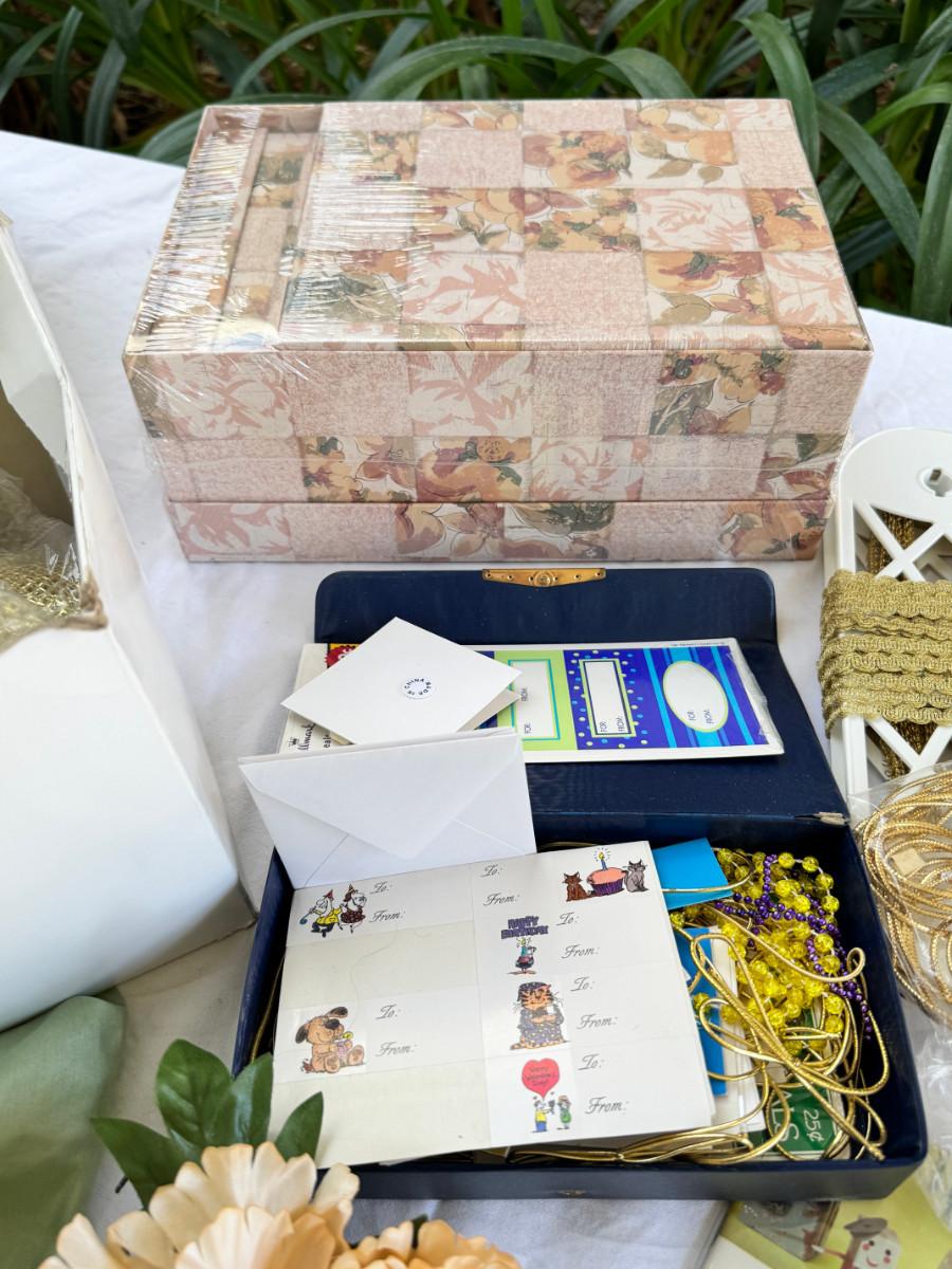 Fancy storage boxes, fancy scapbook paper pads, flowers and gold trims