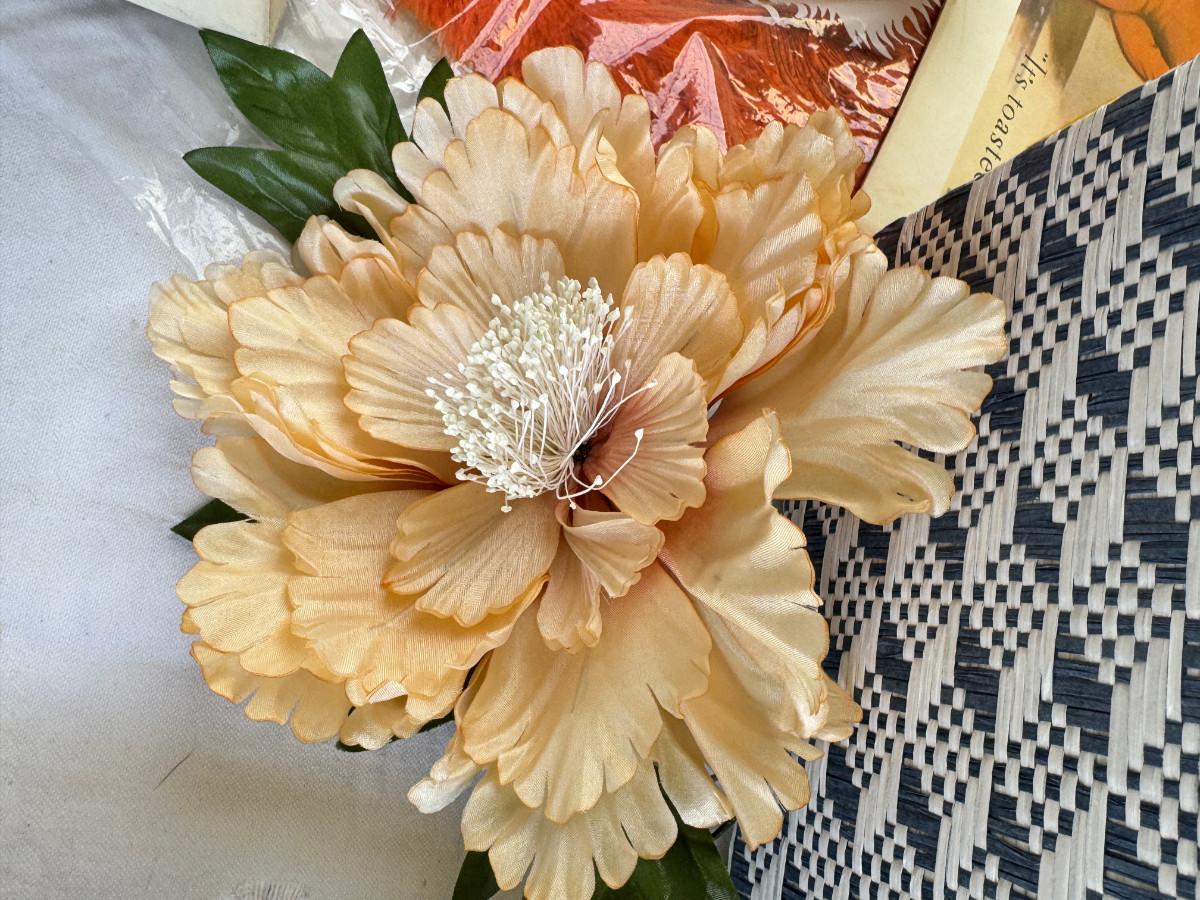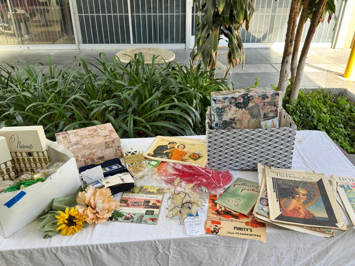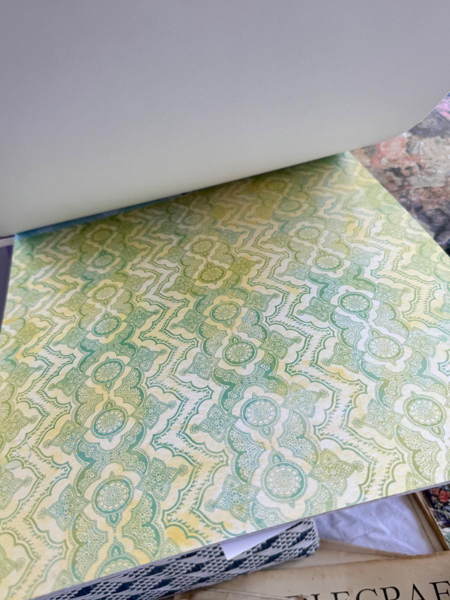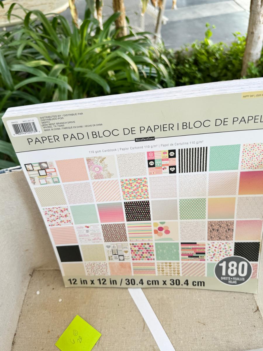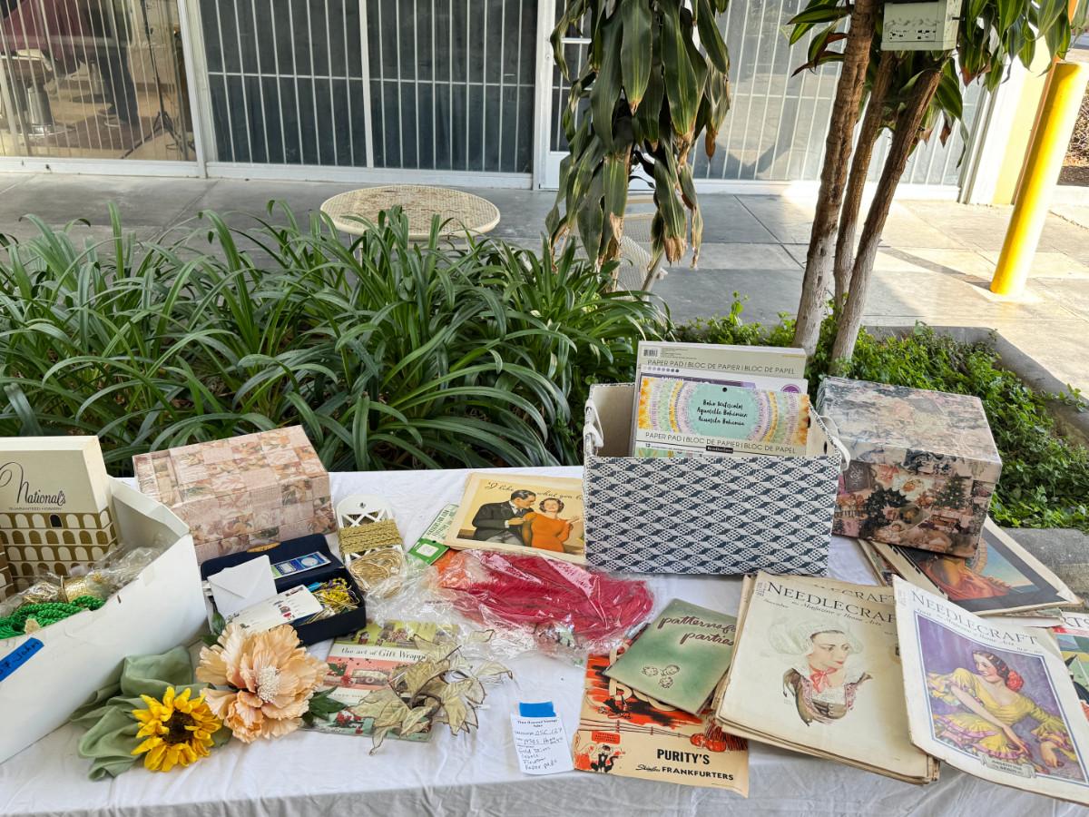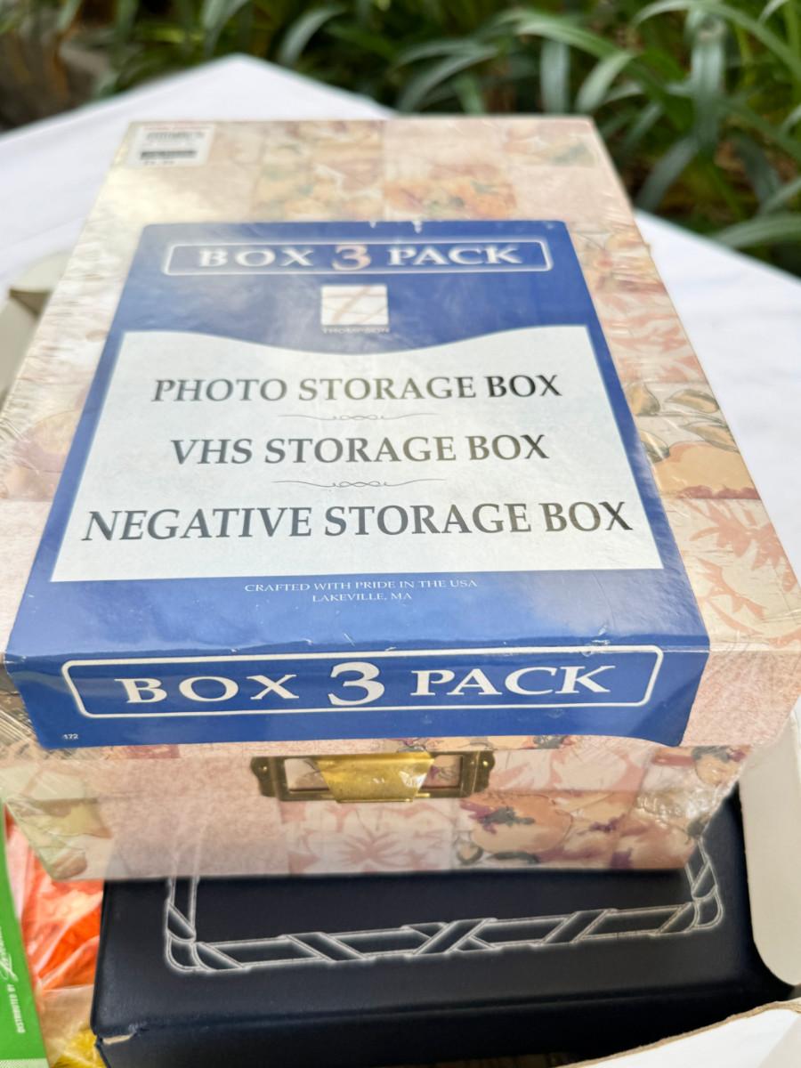 Fancy storage boxes, fancy scapbook paper pads, flowers and gold trims