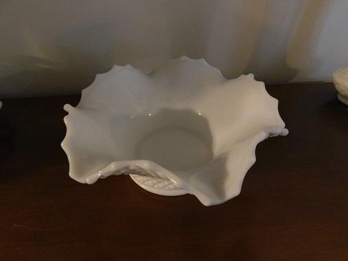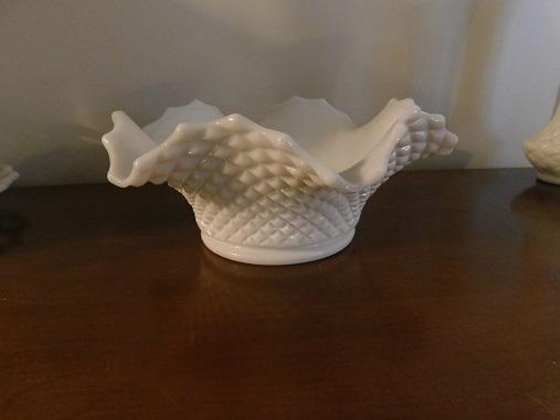 Fancy White Milk Glass Ruffle Edge Diamond Dish 9"