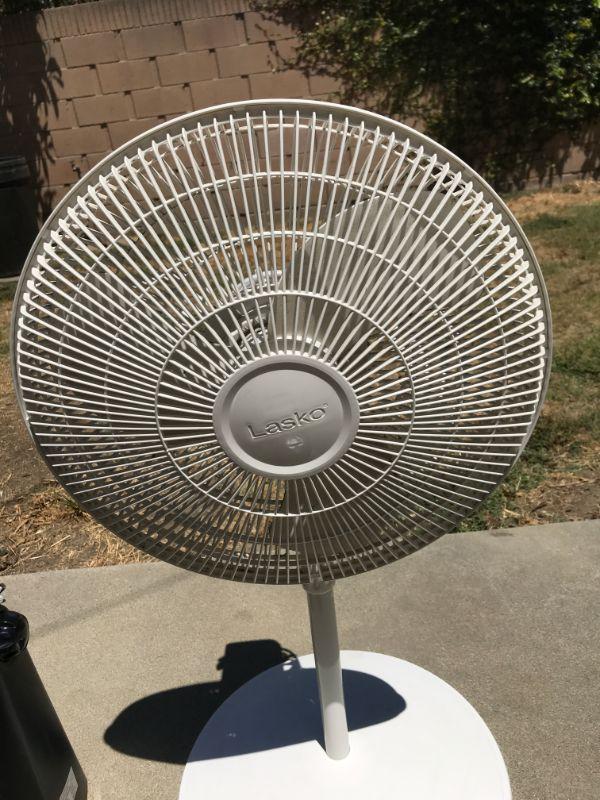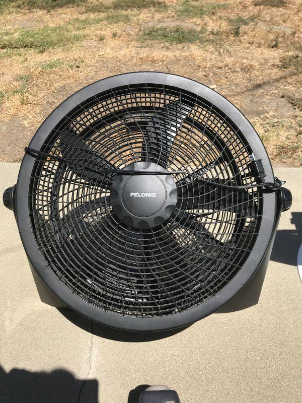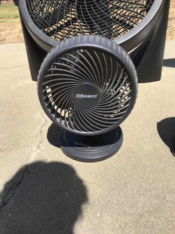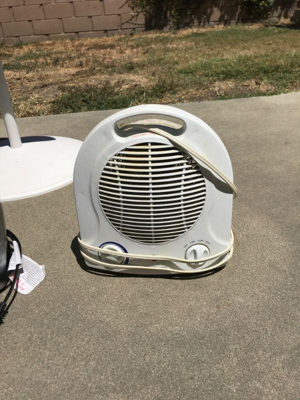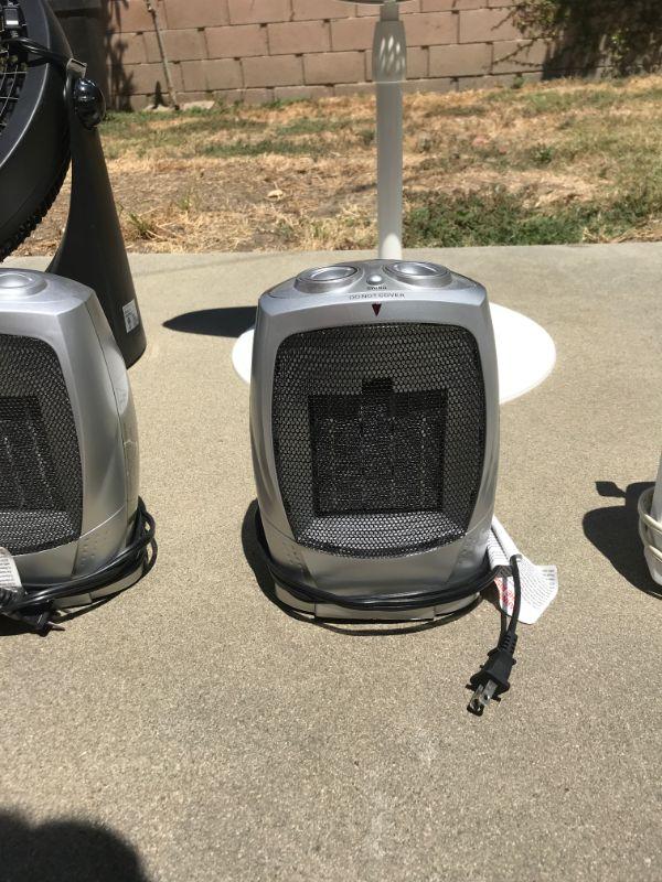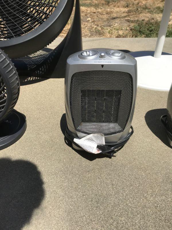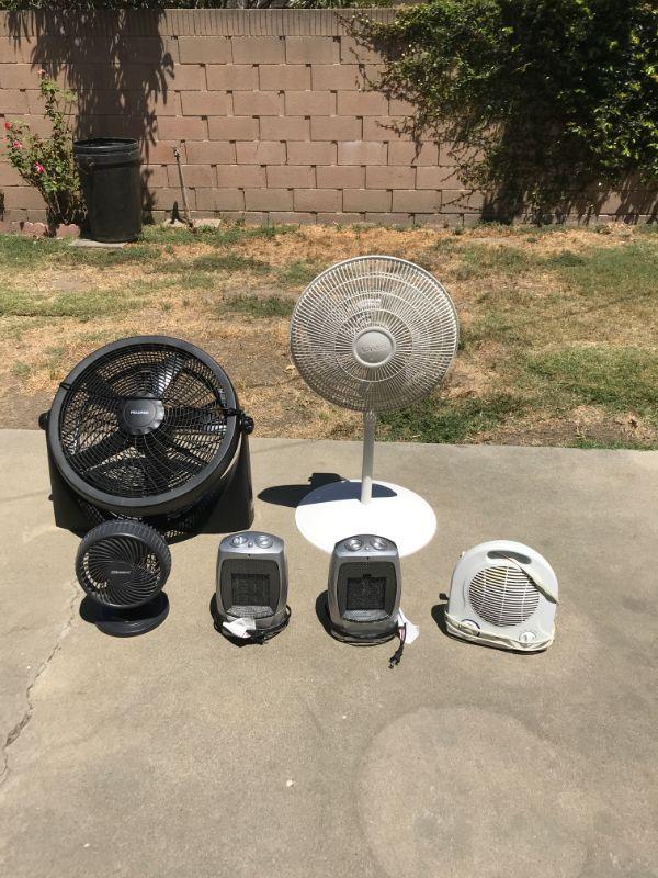 Cool off with this lot of fans. 2 large fans and 4 small. The 2 center fans look like they might be space heaters.