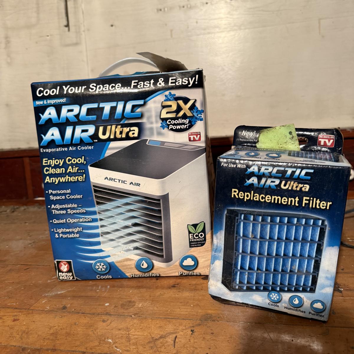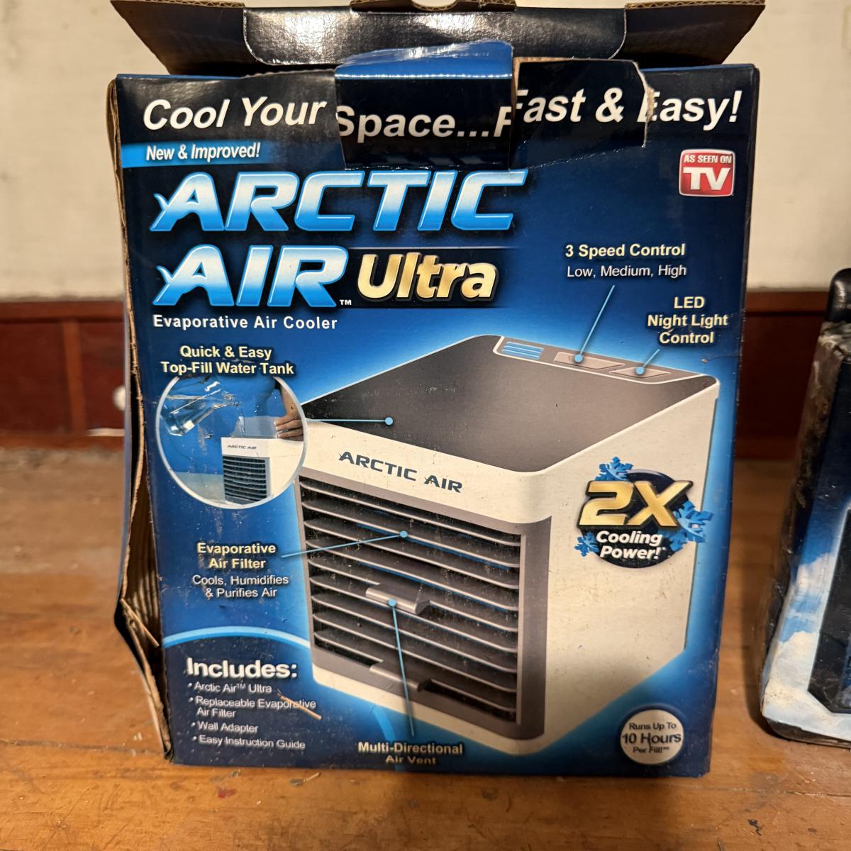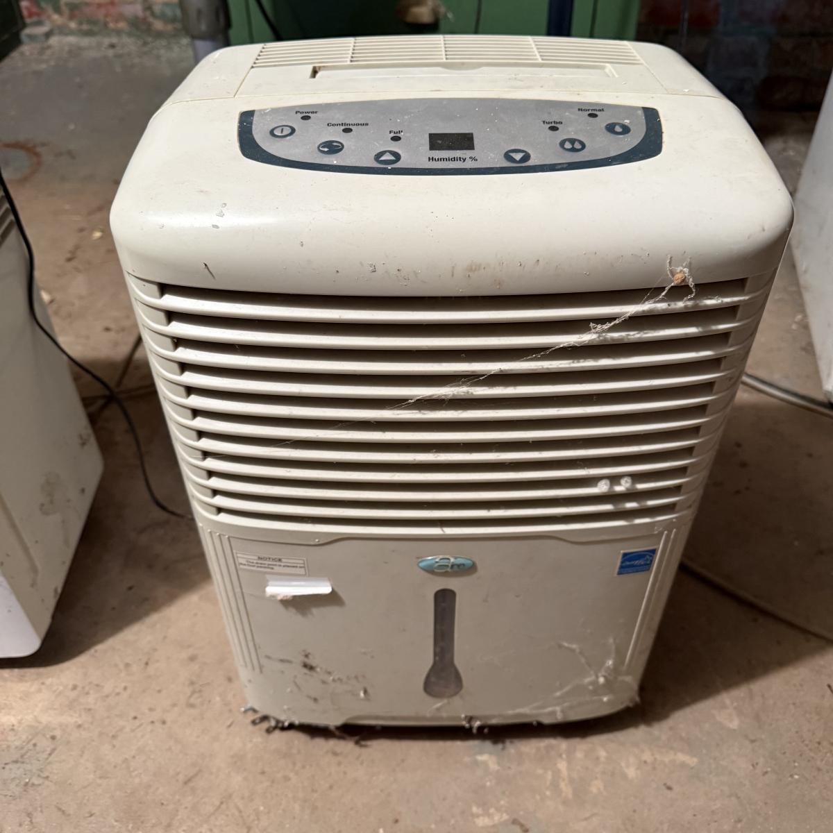 This lot contains eight items. We have two Aire dehumidifiers, a small Eva-dry dehumidifier, a small space heater and a small fan (both of which are NIB) and two floor fans. The black and decker floor fan measures 17”D at the base x 45.5”H. All items powered on when tested.