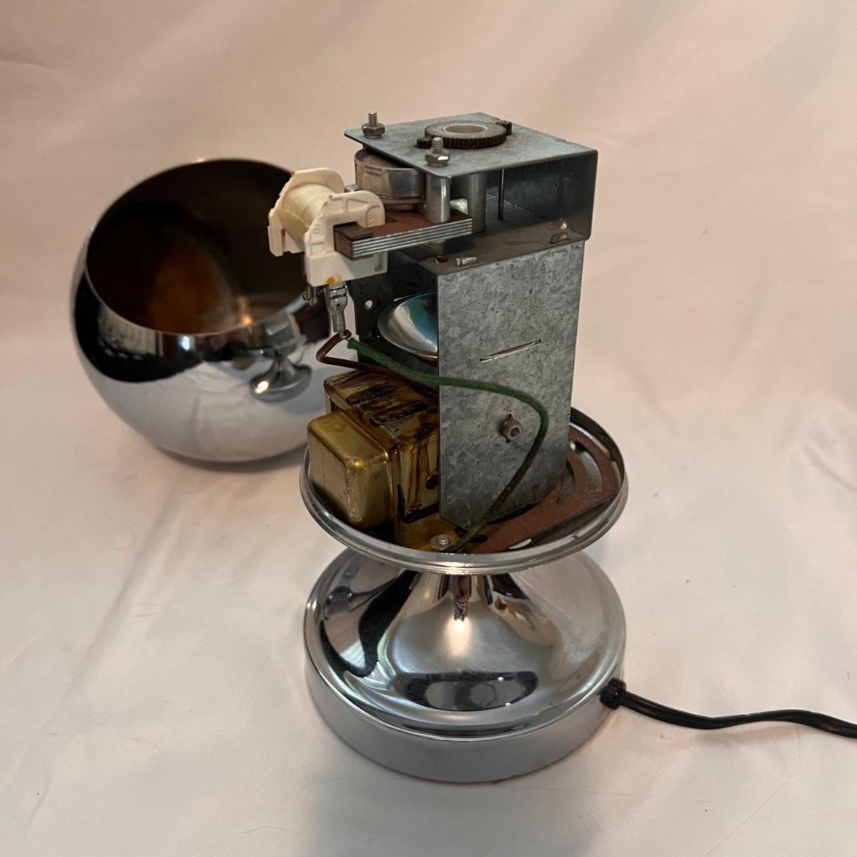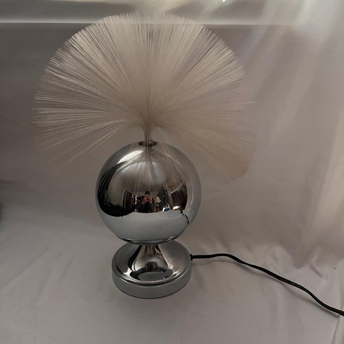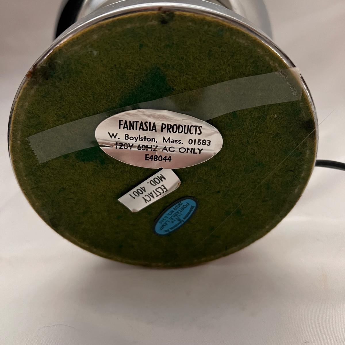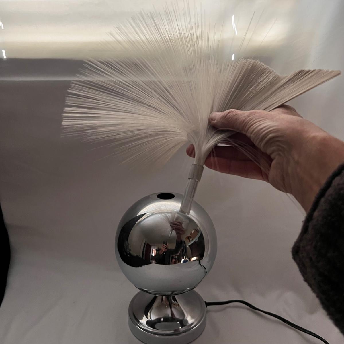This wonderful vintage fiber optic light has a metal body with an in-line switch. The lamp changes colors as the top rotates; colors include purple, pink, yellow and green.