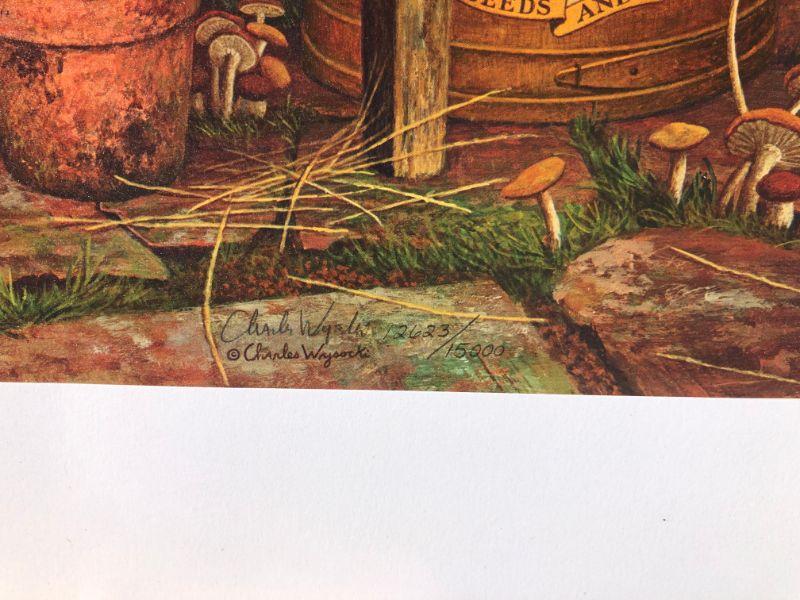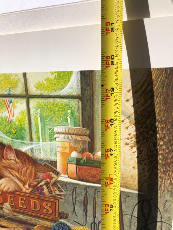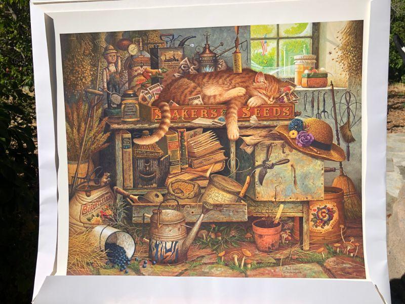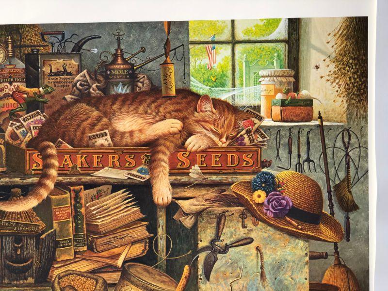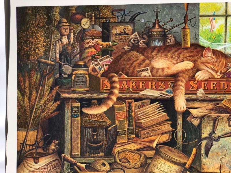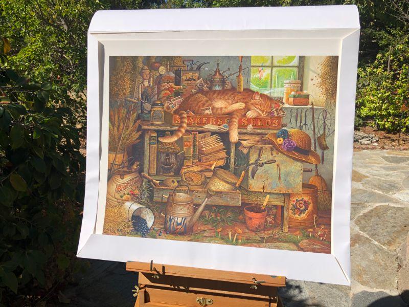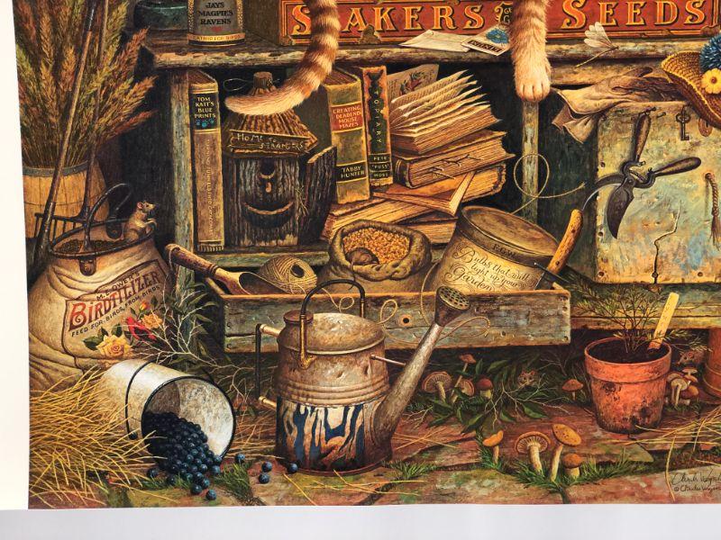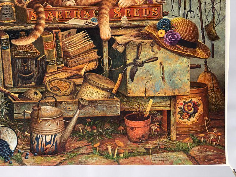 Fantastic scene of a very content cat in the garden shed, By Charles Wysocki, titled "Remington the Horticulturalist". Signed and numbered.