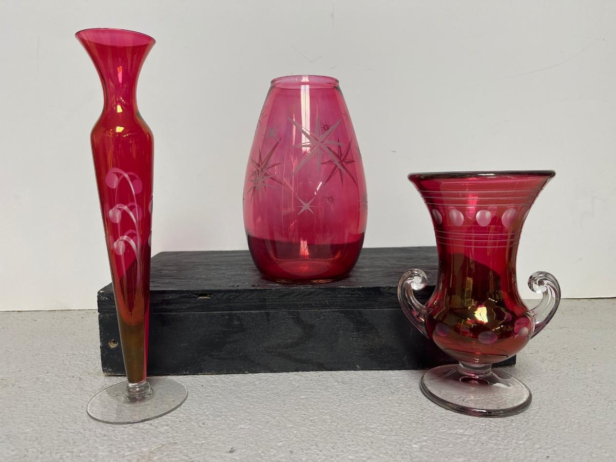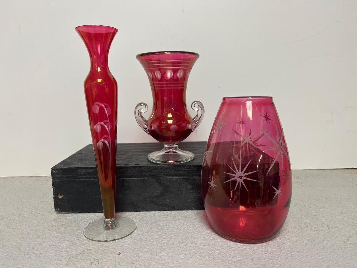Cut bud vase, flash double handled vase, and stunning atomic vase