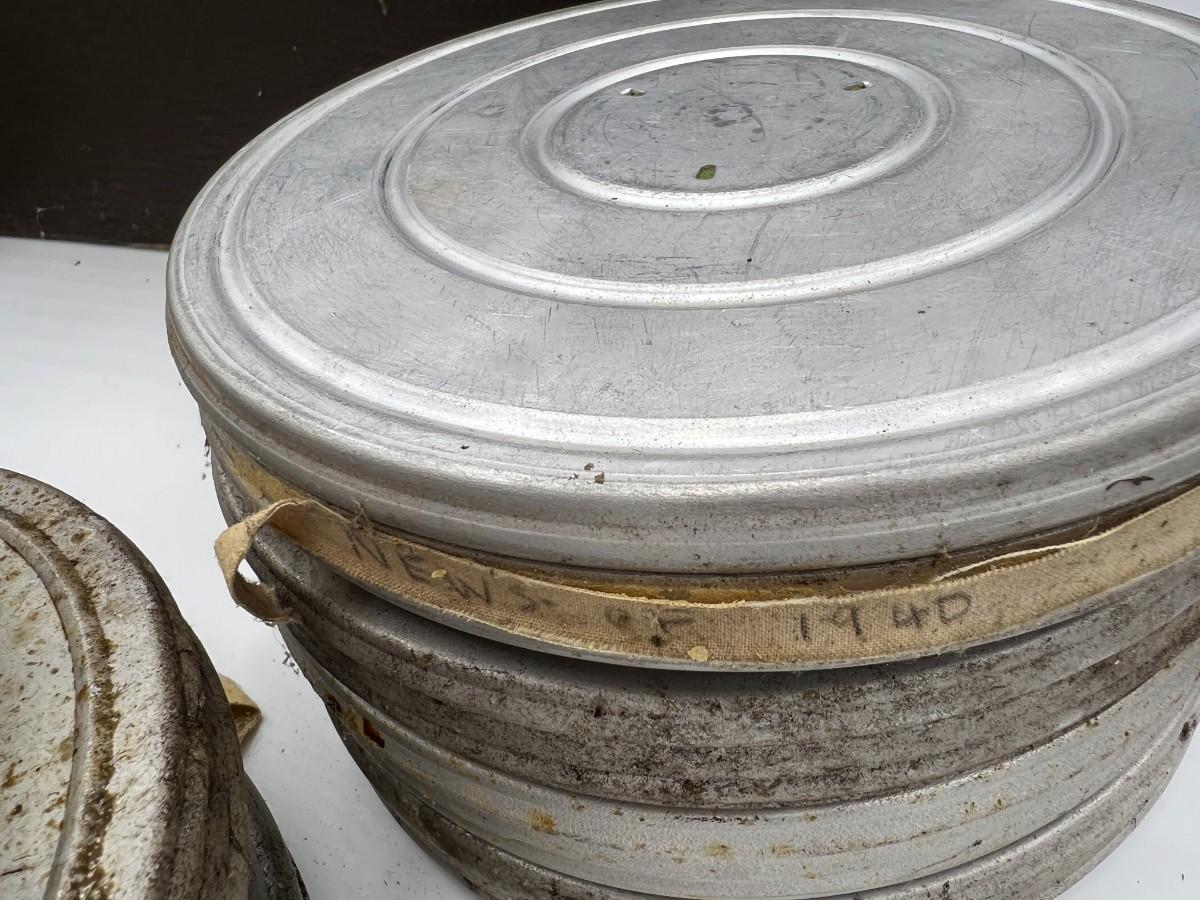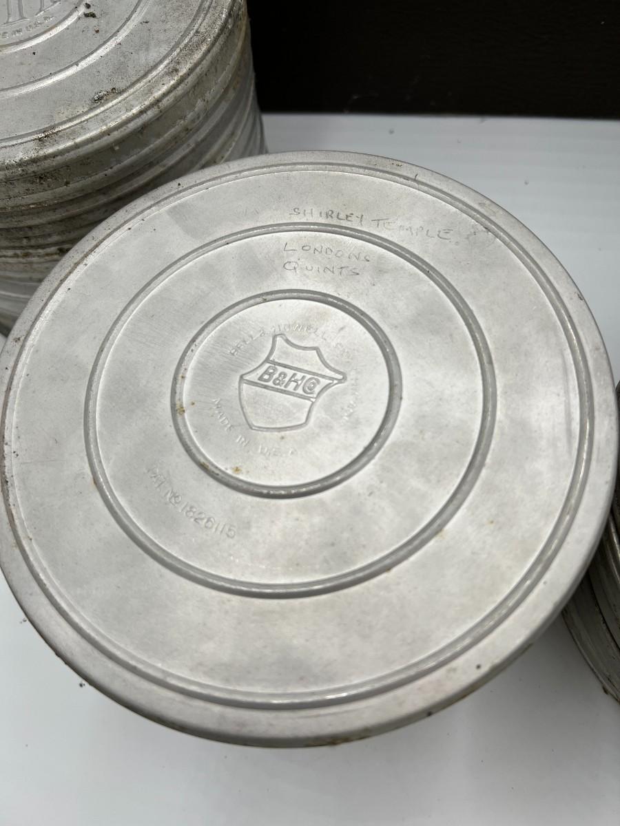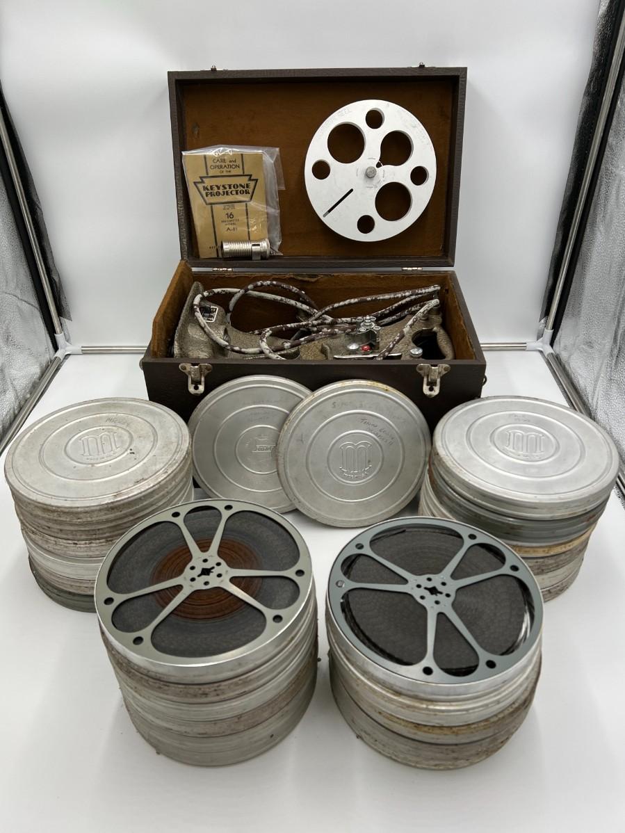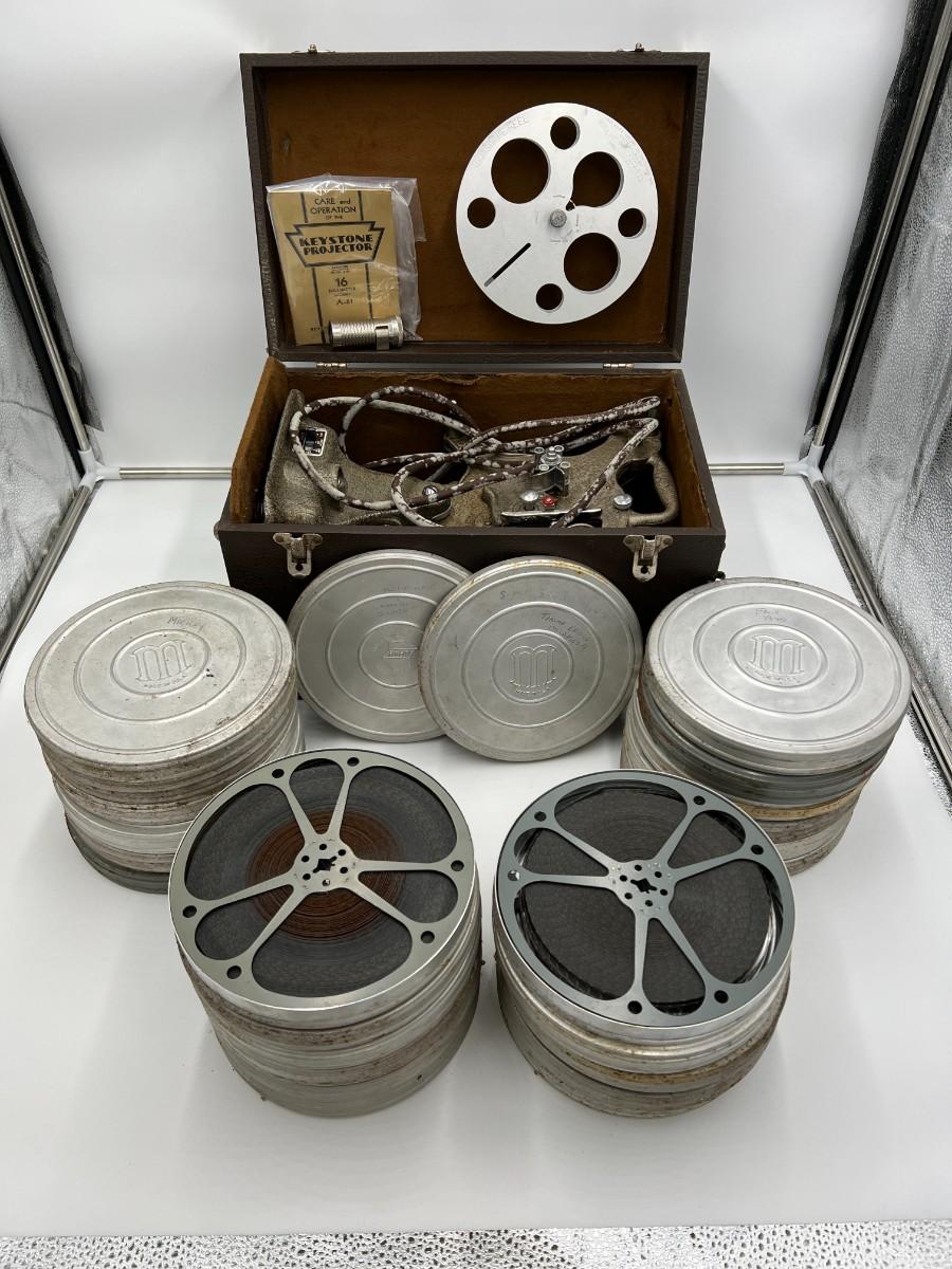 Amazing and rare lot of vintage 16 millimeter films and projector (none were tested, but condition looks good, as shown). Films are labeled on the tins, which we assume are accurate, but cannot be certain. Film cannister labels include; Tacoma Bridge Collapses on Super Thrills News, Shirley Temple and London's Quints (Quintuplets), Mickey, Naval Cadet Leap in the Air, the Great Mistake, Legion N.Y. 1937, and News of 1940.