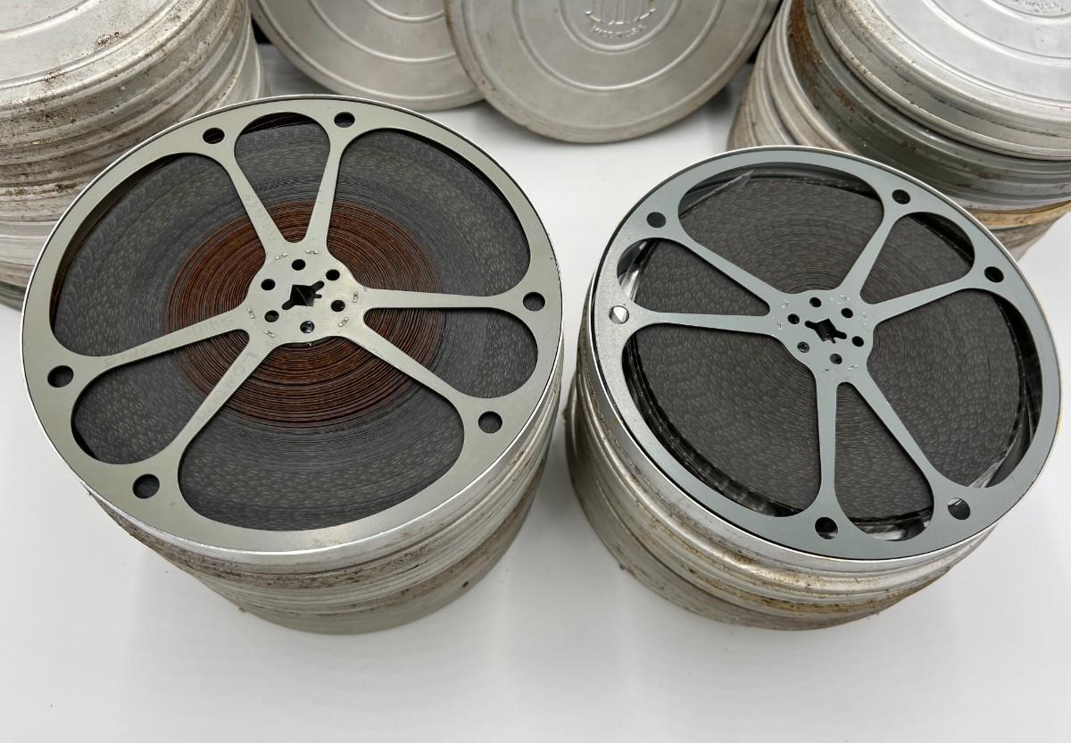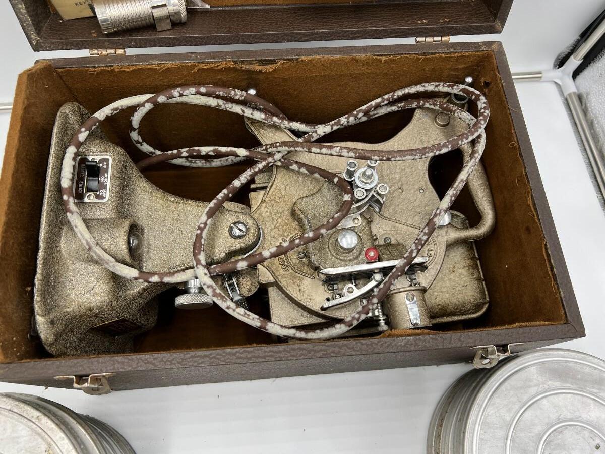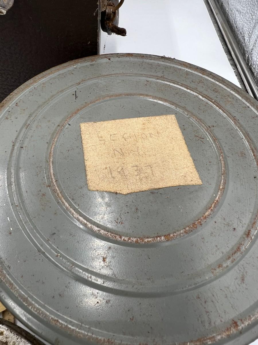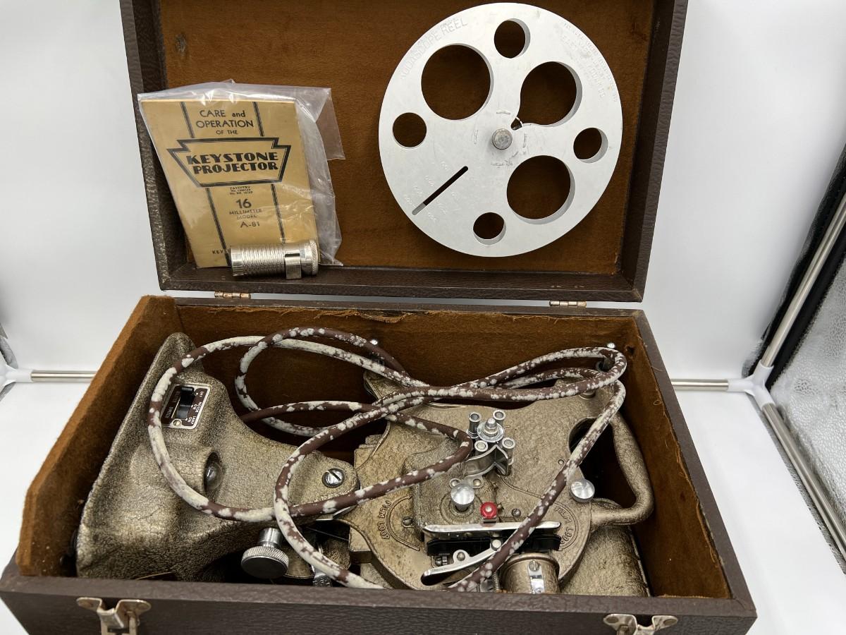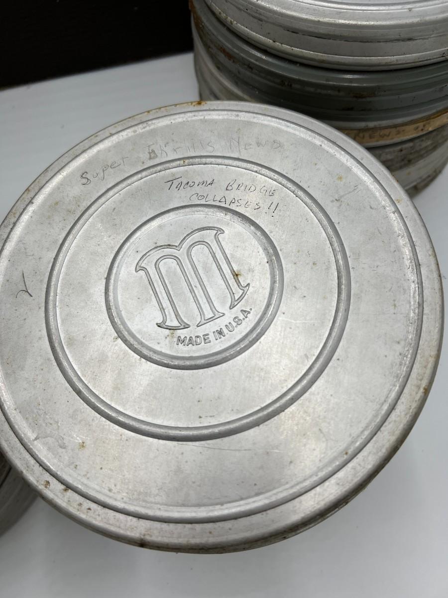 Amazing and rare lot of vintage 16 millimeter films and projector (none were tested, but condition looks good, as shown). Films are labeled on the tins, which we assume are accurate, but cannot be certain. Film cannister labels include; Tacoma Bridge Collapses on Super Thrills News, Shirley Temple and London's Quints (Quintuplets), Mickey, Naval Cadet Leap in the Air, the Great Mistake, Legion N.Y. 1937, and News of 1940.