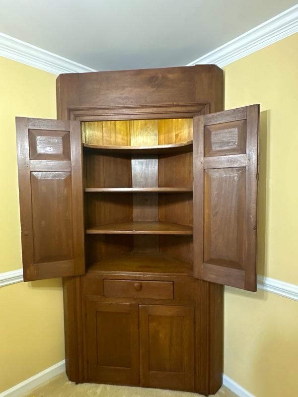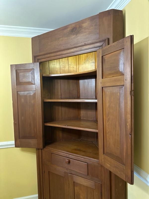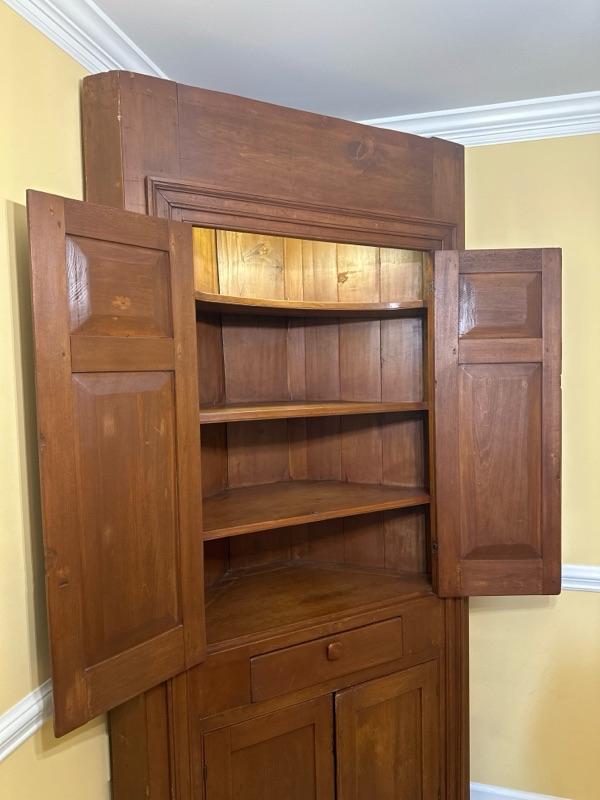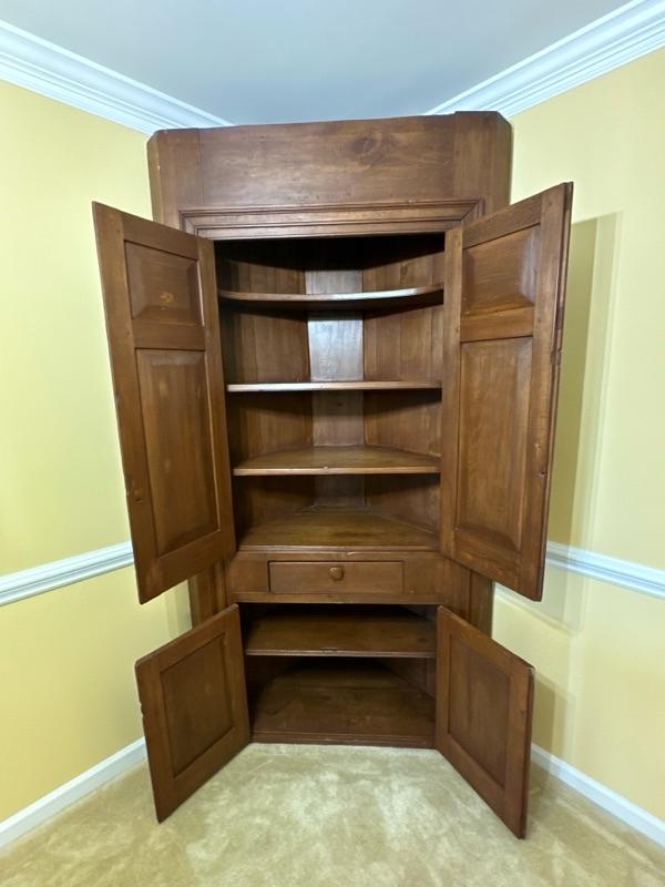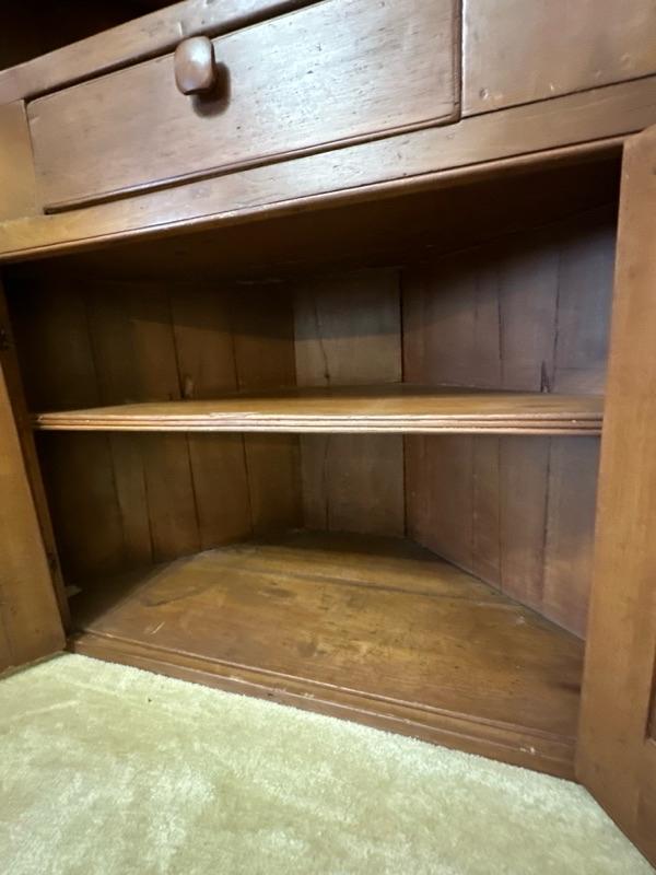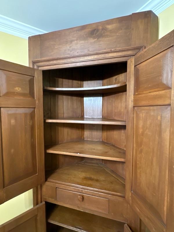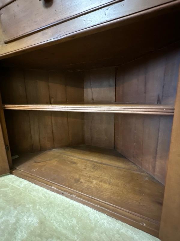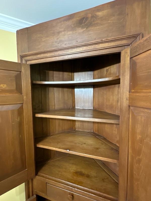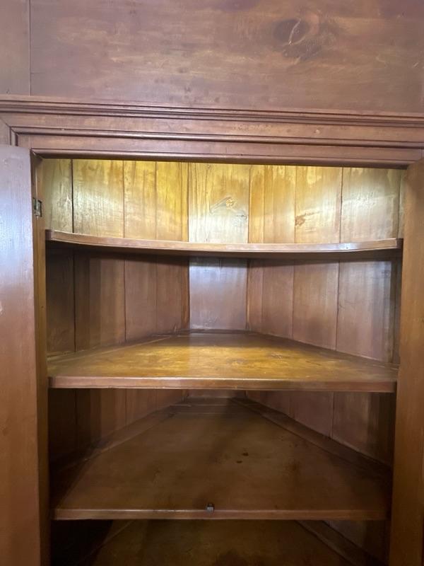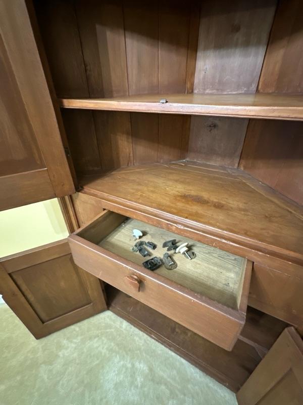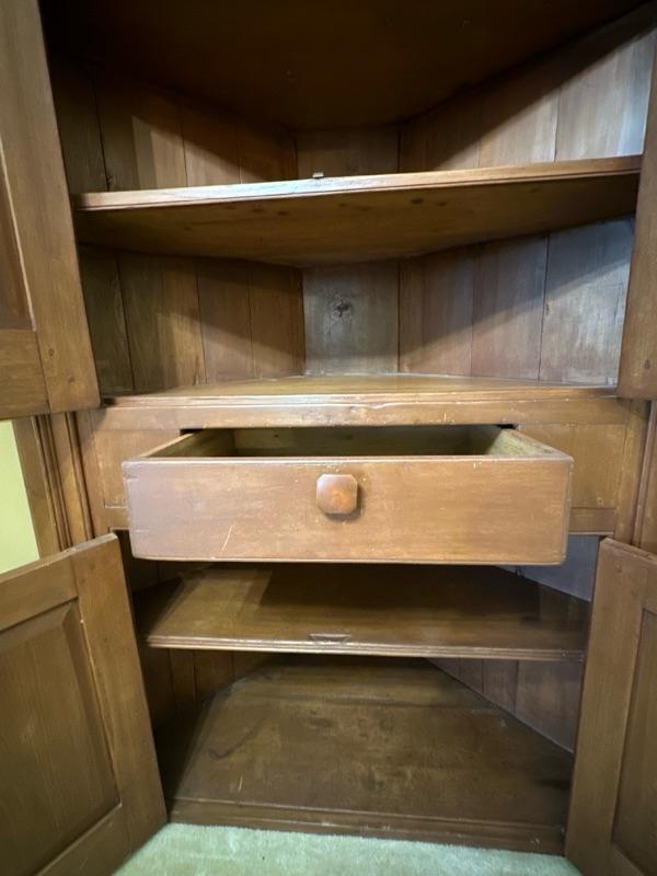 Fantastic Wooden Cabinet/Cupboard that has a triangular shape fitting perfectly into any corner. Doors do not completely latch, but they do close. This piece of furniture is very sturdy and heavy.