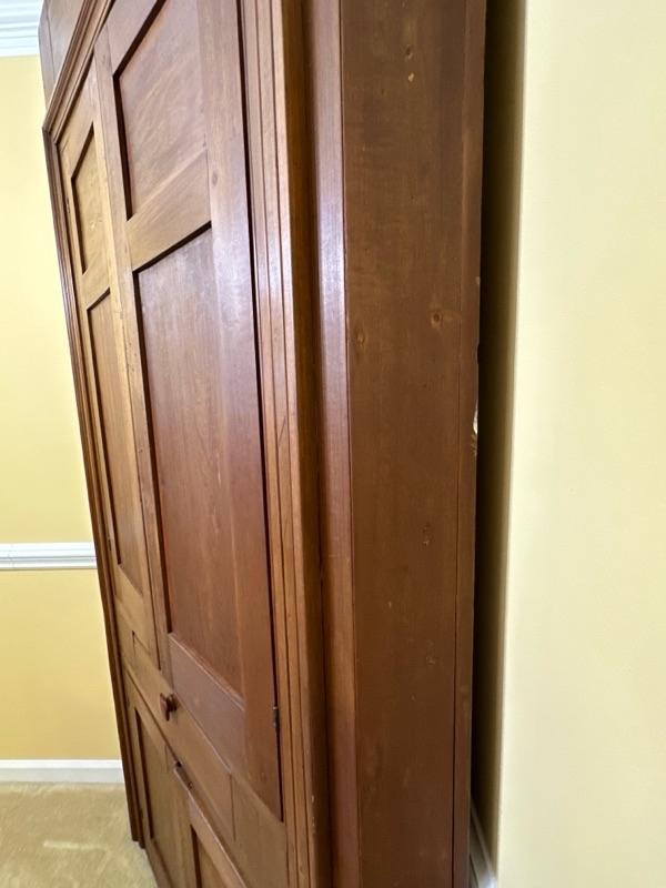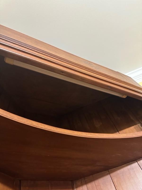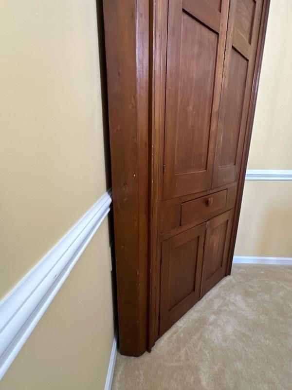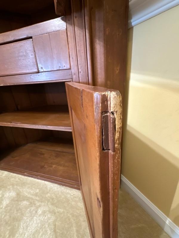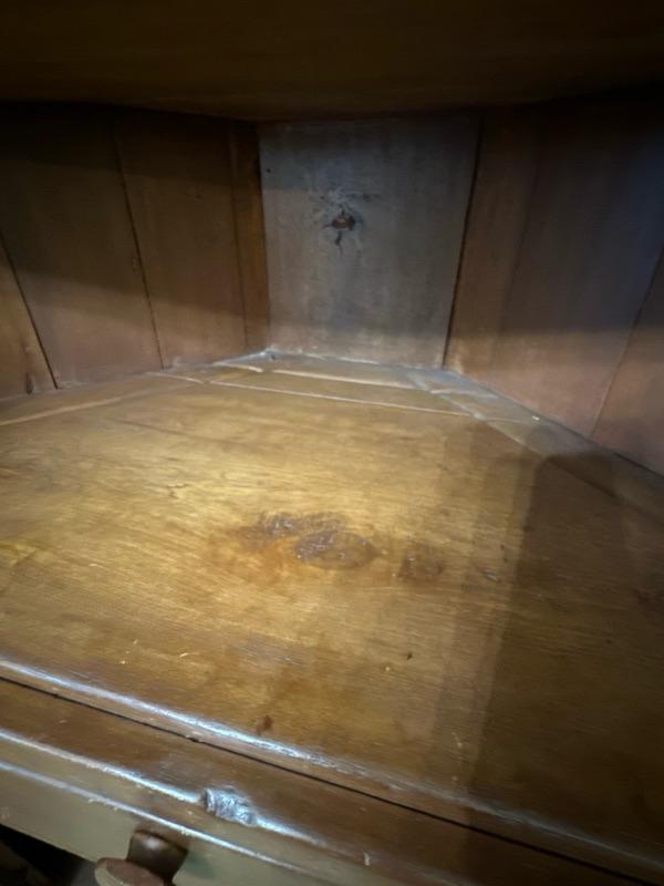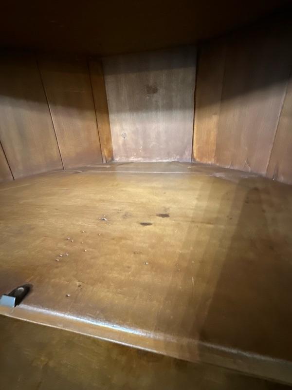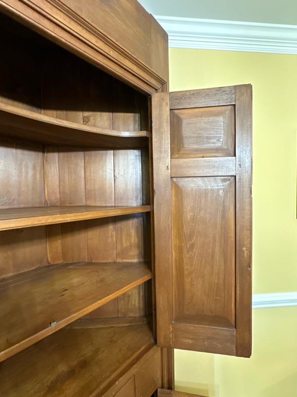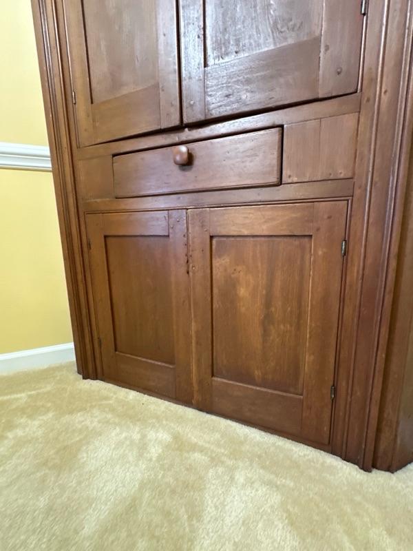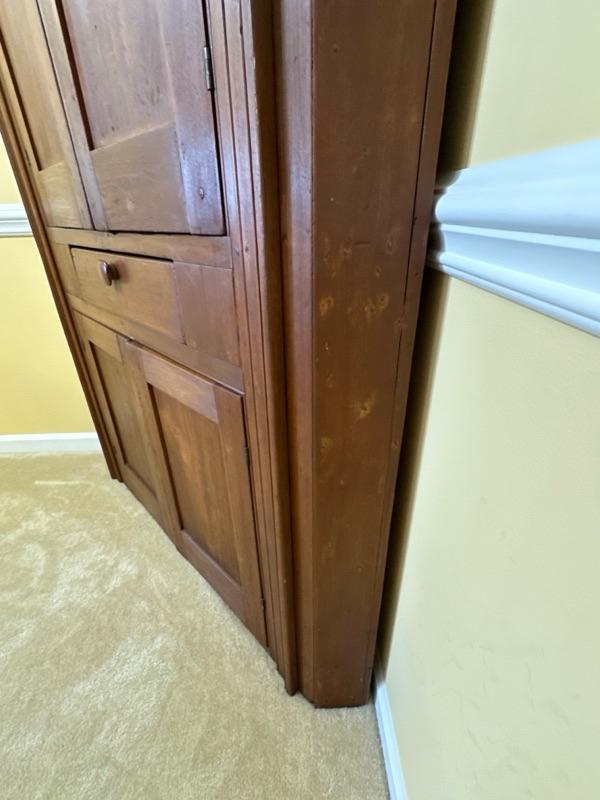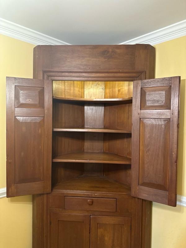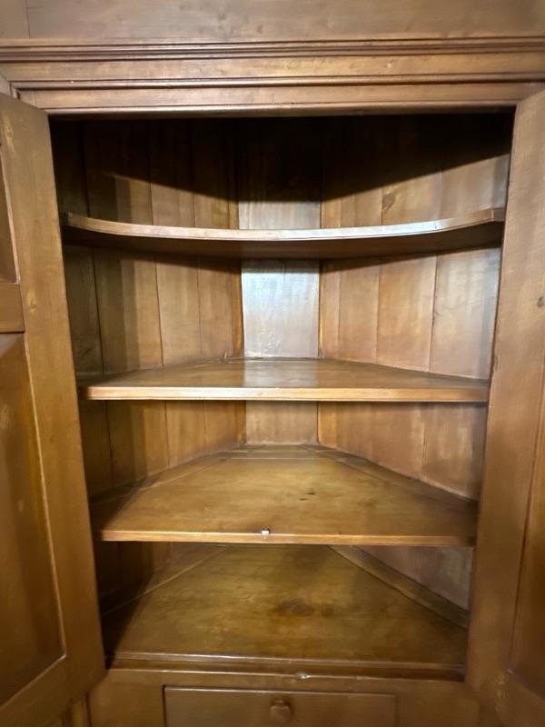 Fantastic Wooden Cabinet/Cupboard that has a triangular shape fitting perfectly into any corner. Doors do not completely latch, but they do close. This piece of furniture is very sturdy and heavy.