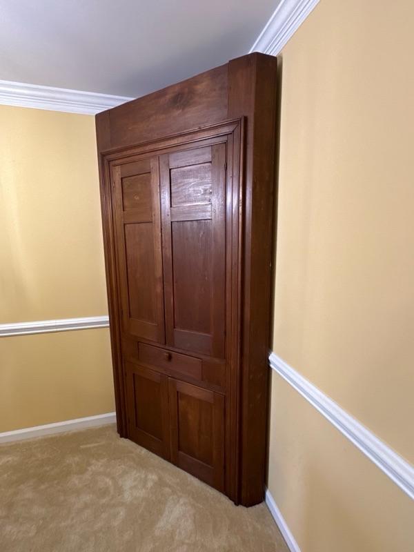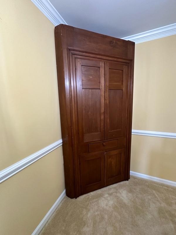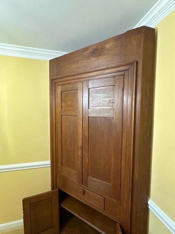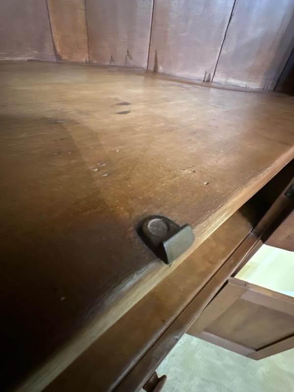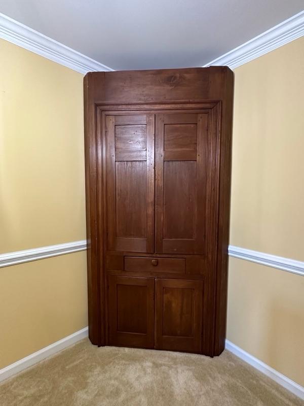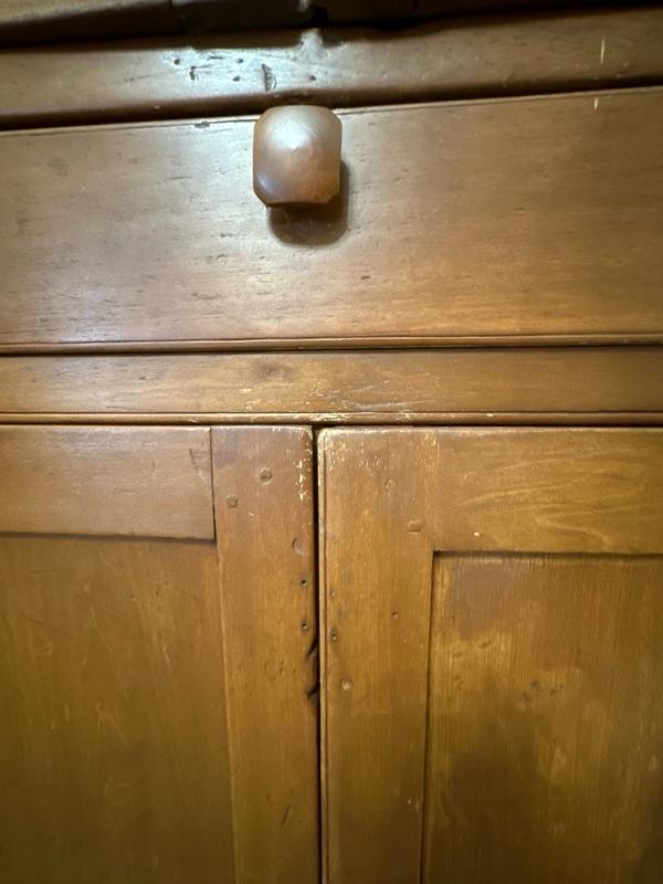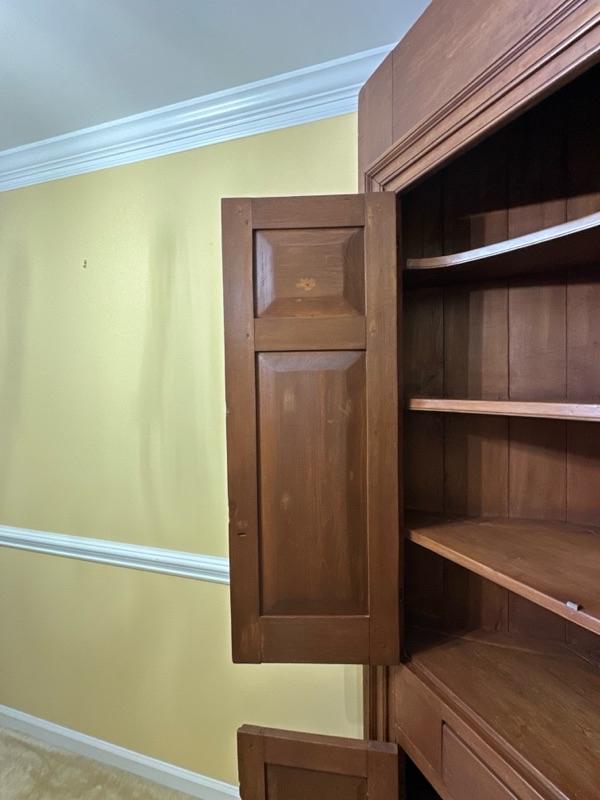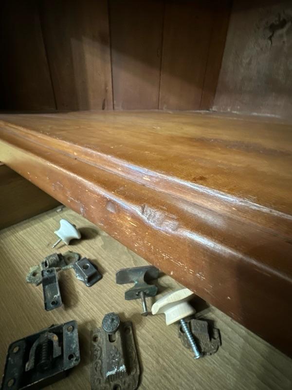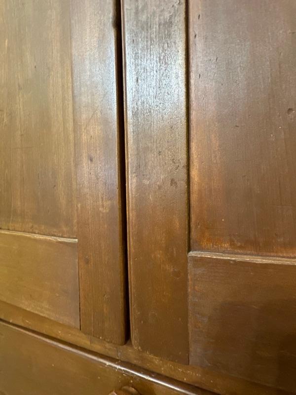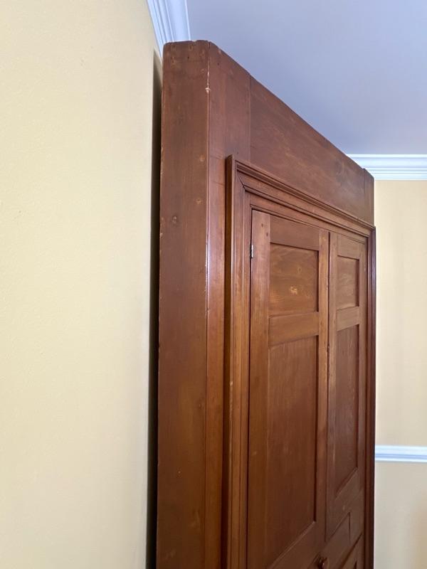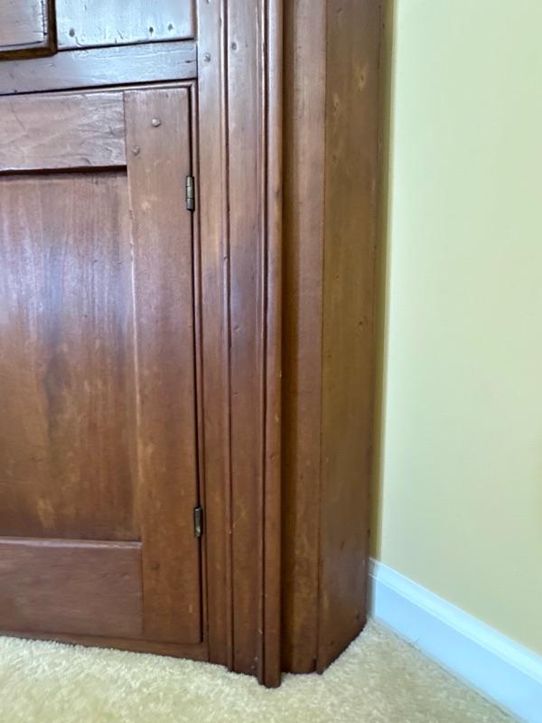 Fantastic Wooden Cabinet/Cupboard that has a triangular shape fitting perfectly into any corner. Doors do not completely latch, but they do close. This piece of furniture is very sturdy and heavy.