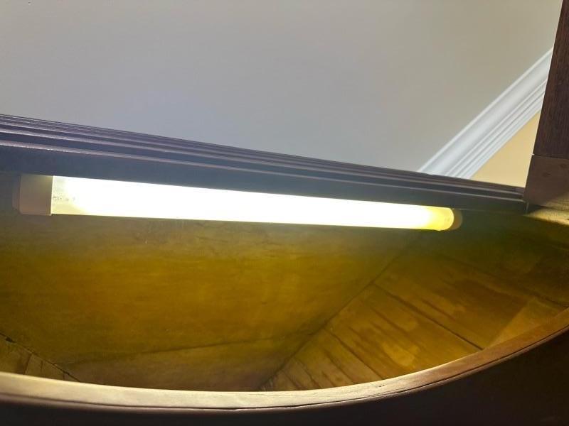 There is also a light inside at the top. There are photos included of the lamp plug. The back has not been examined due to the weight, but is seemingly in good shape.