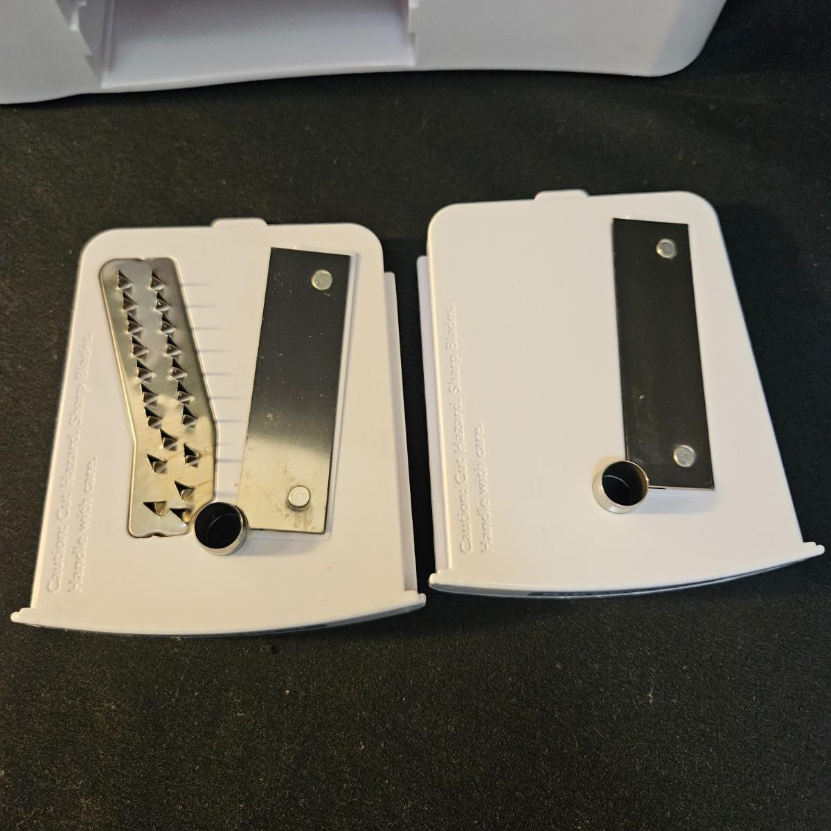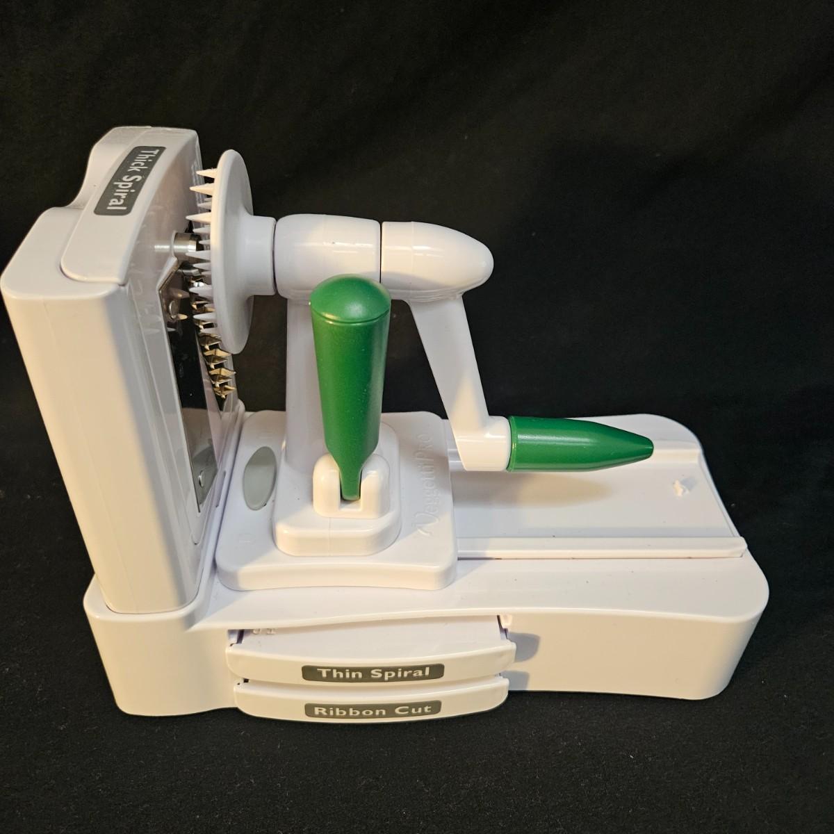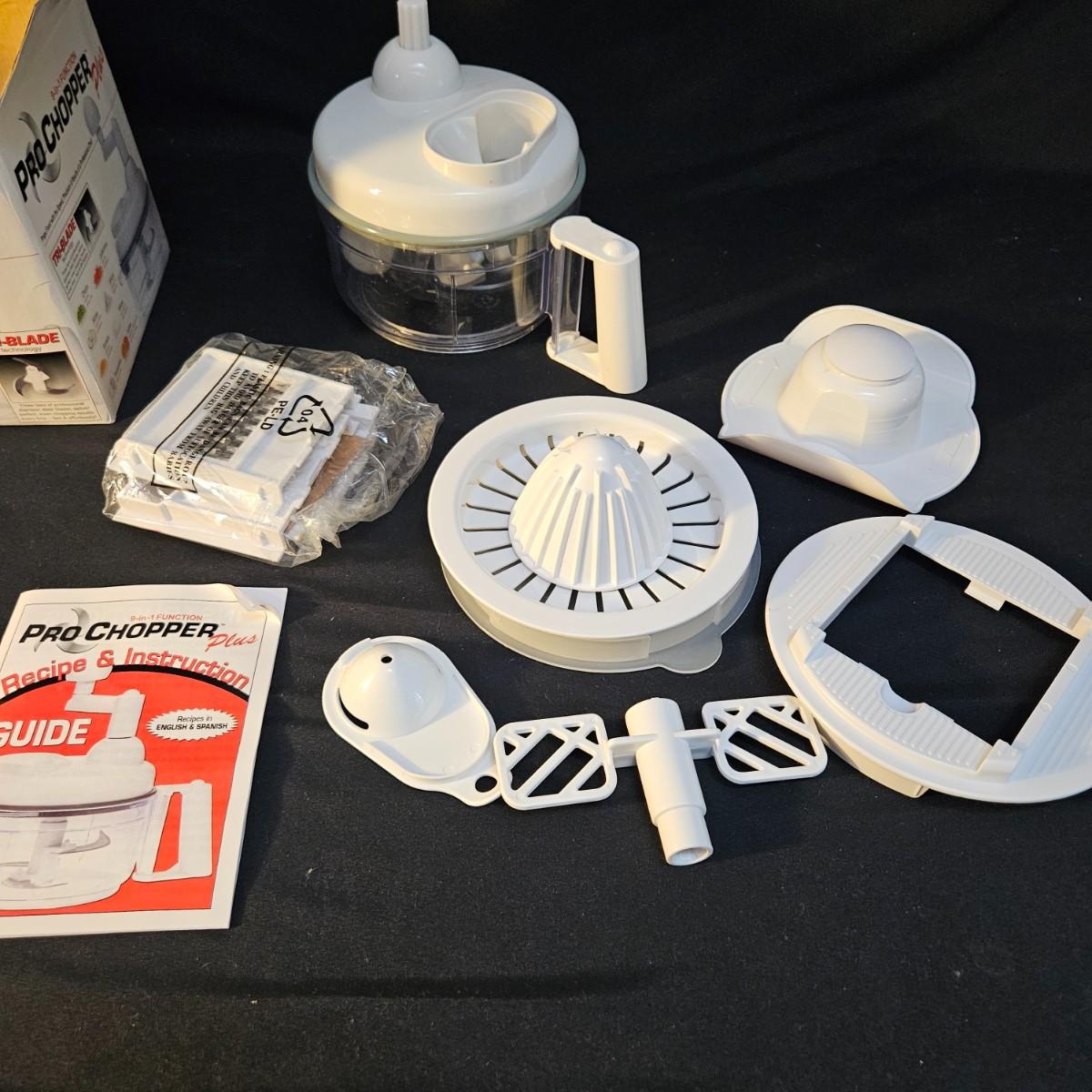 An assortment of small kitchen appliances and accessories. All electric items were plugged in and powered on. Includes a 2 quart crock pot, a Farberware air fryer, a Sunbeam bread maker, a Chop Magic, a Pro Chopper plus and a Veggetti Pro. The bread maker measures approximately 10" x 12" x 12"H. Local pickup only