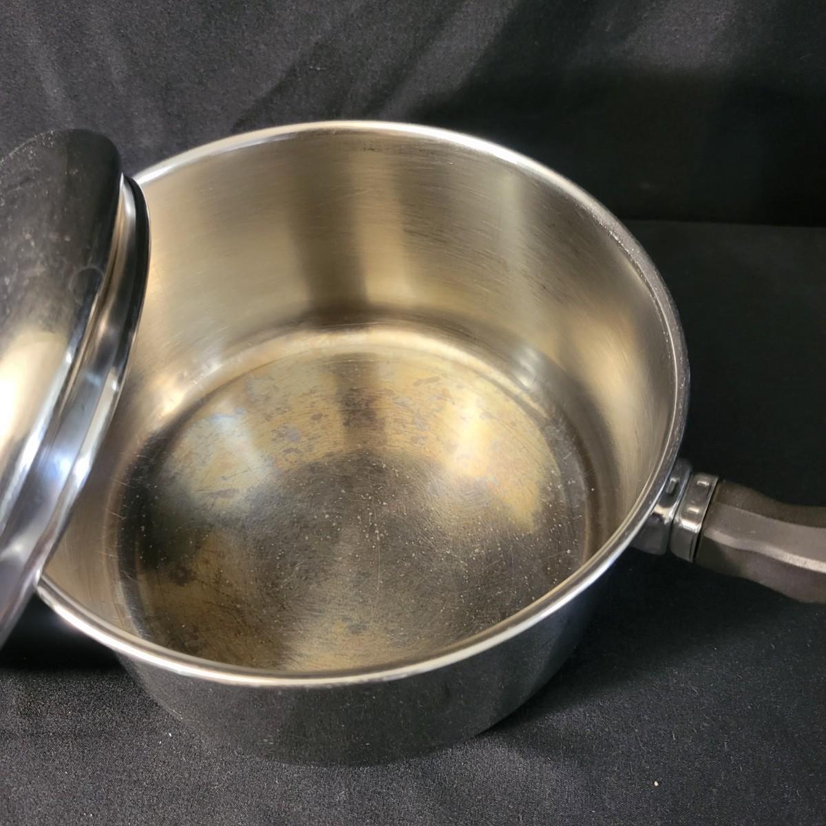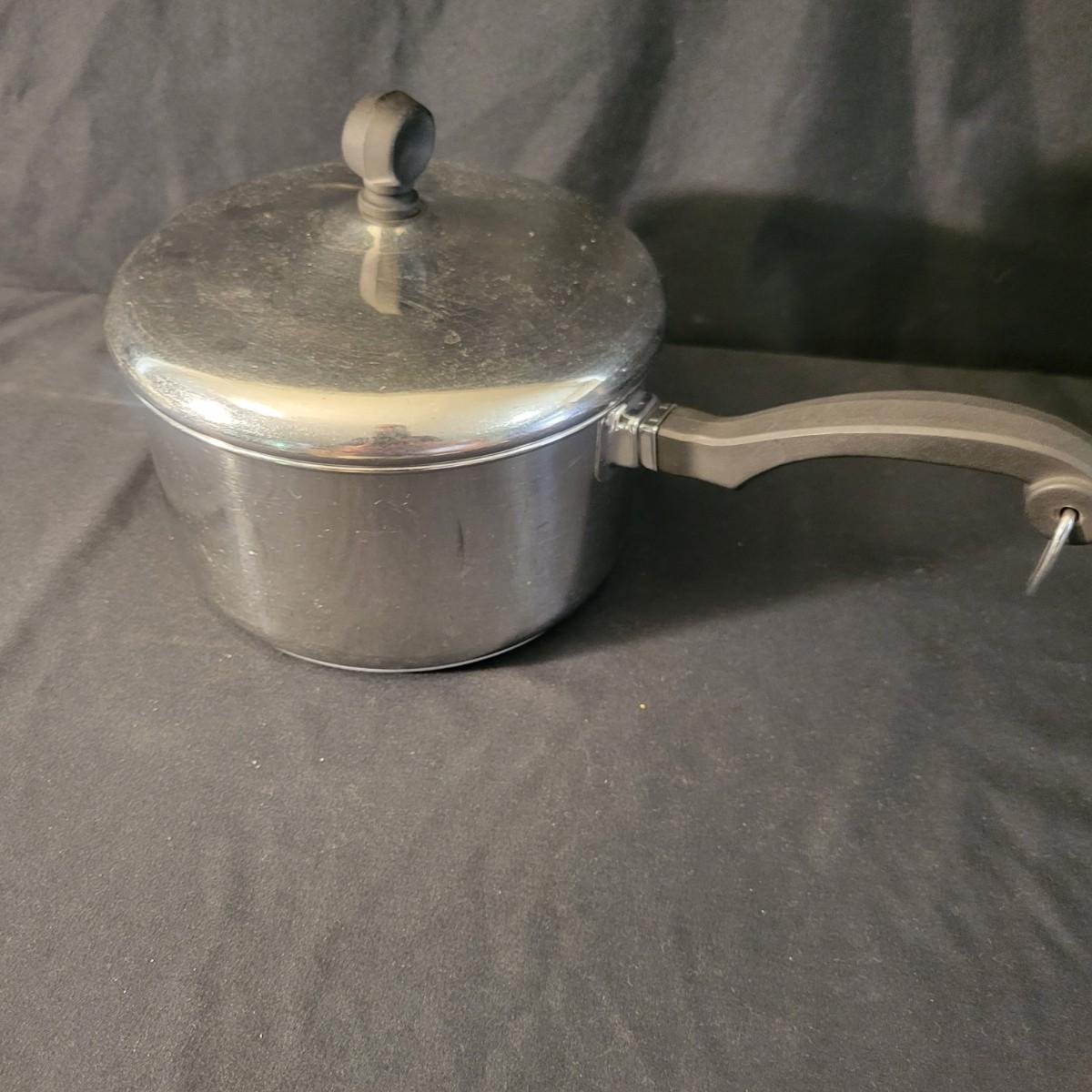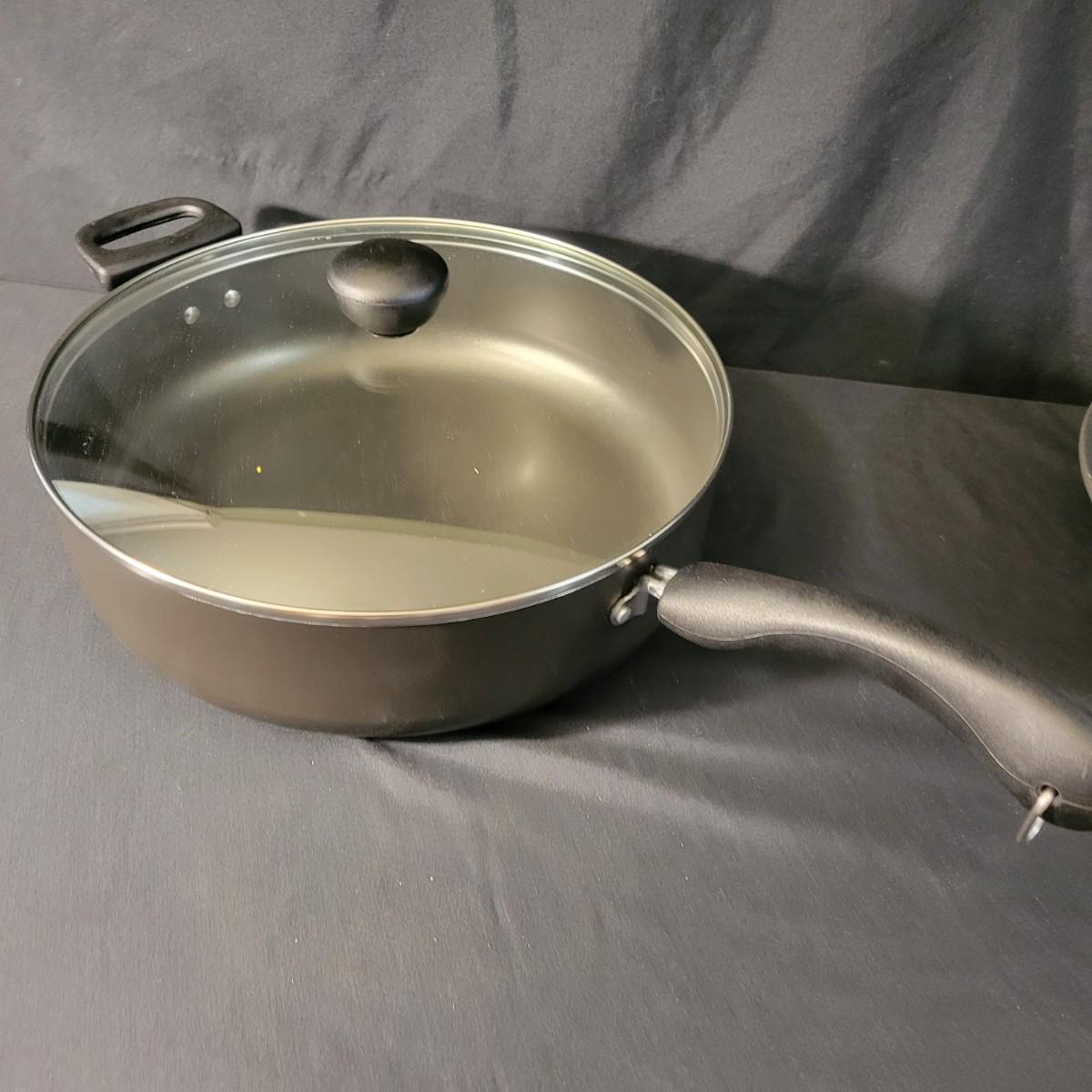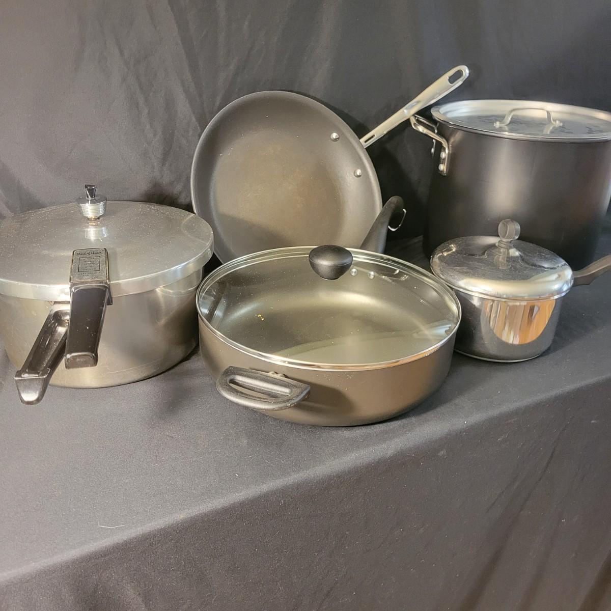 An assortment of five pots and pans in good condition, but with some minor scratches. Included is a 6qt pressure cooker by Maid of Honor, a large stock pot by Great Cooks, a 2qt sauce pan by Farberware, a 12.5" pan by Emeril and a lidded 12" non stick pan by Farberware. Local pickup only