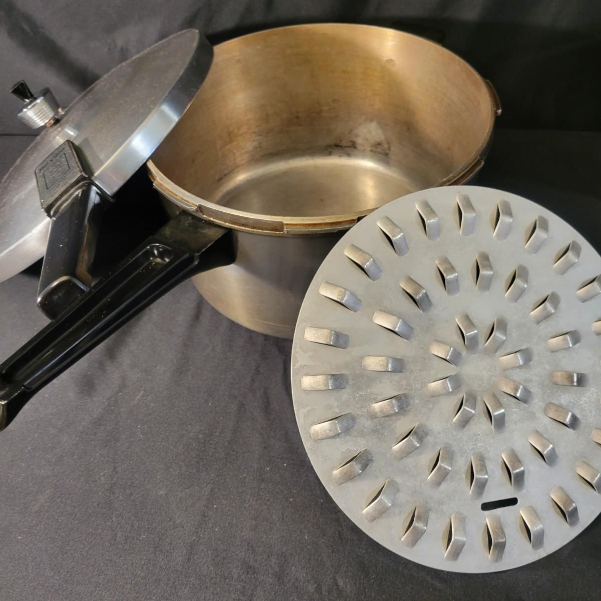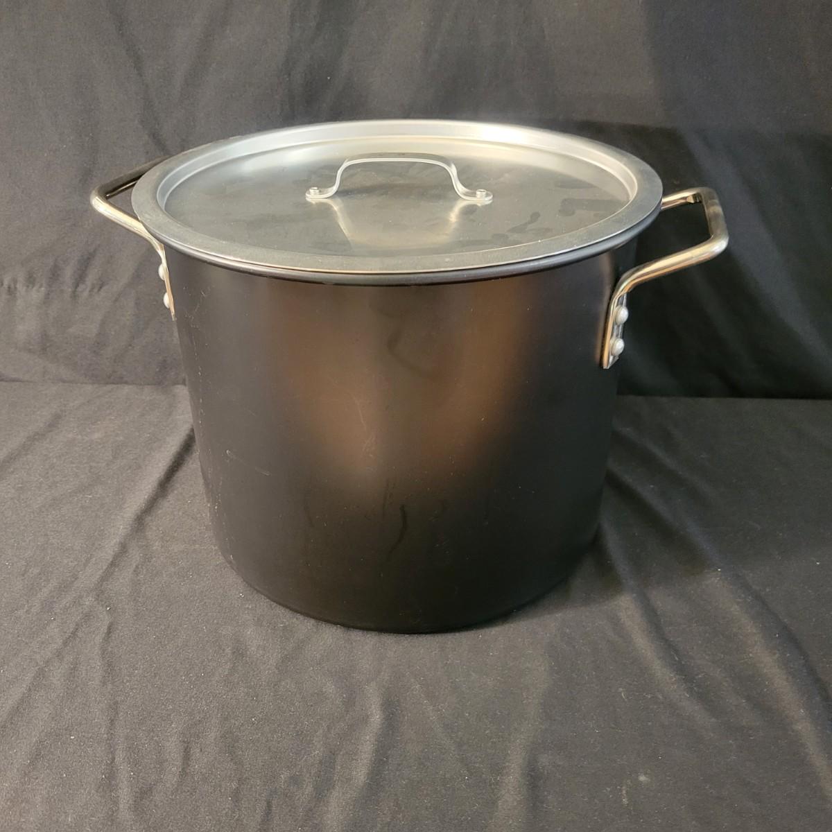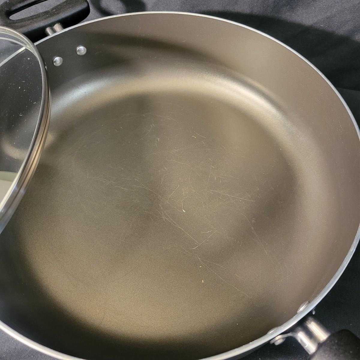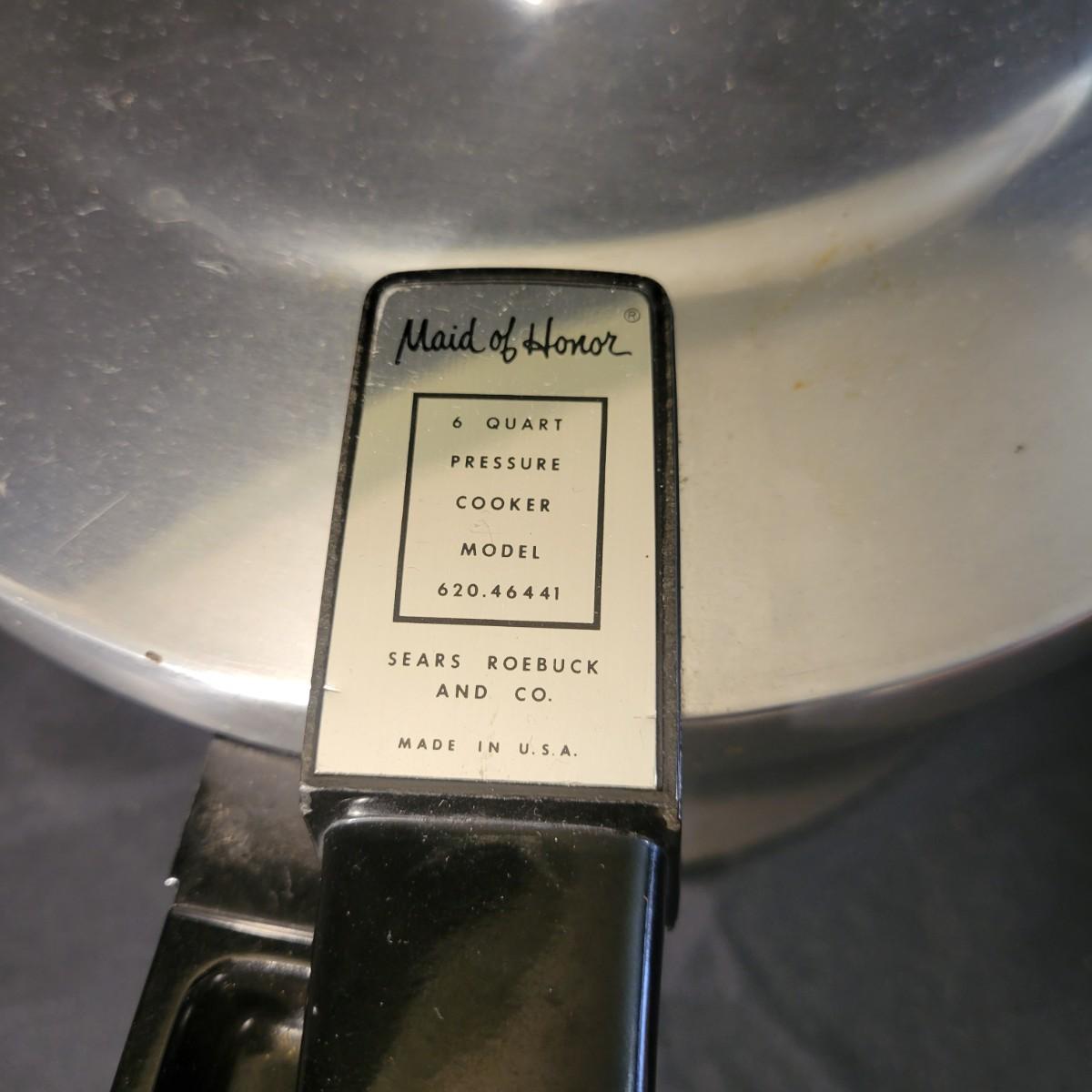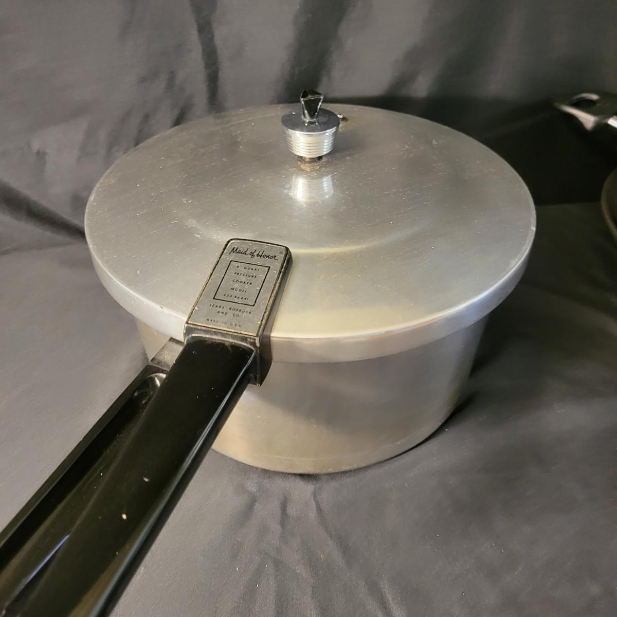 An assortment of five pots and pans in good condition, but with some minor scratches. Included is a 6qt pressure cooker by Maid of Honor, a large stock pot by Great Cooks, a 2qt sauce pan by Farberware, a 12.5" pan by Emeril and a lidded 12" non stick pan by Farberware. Local pickup only