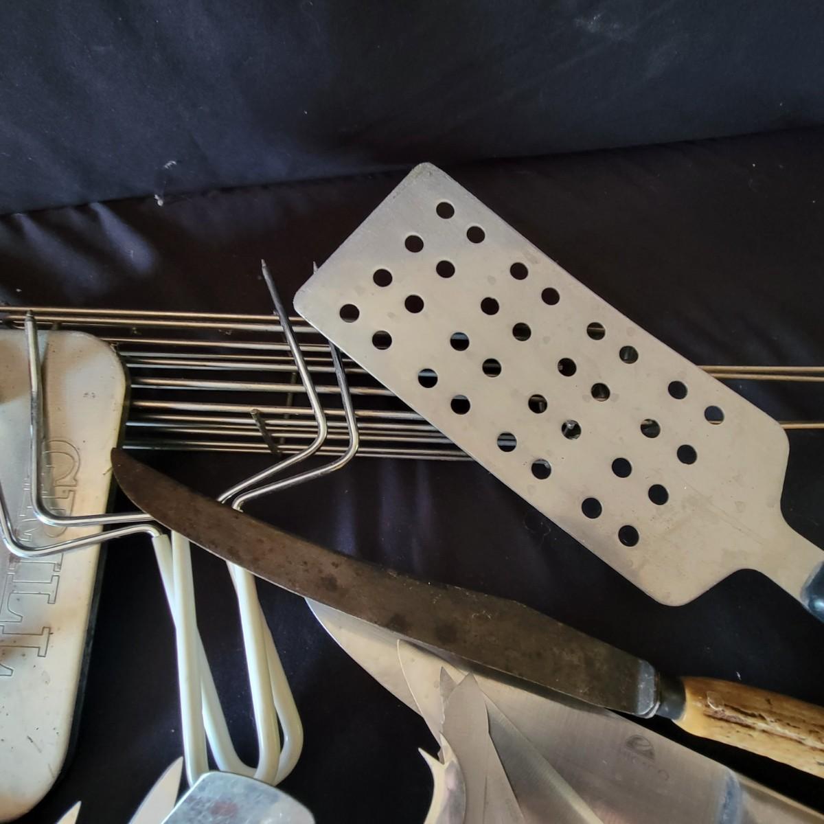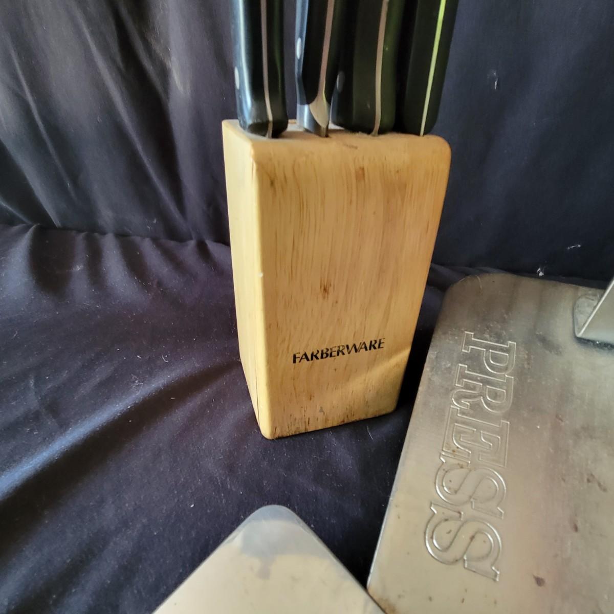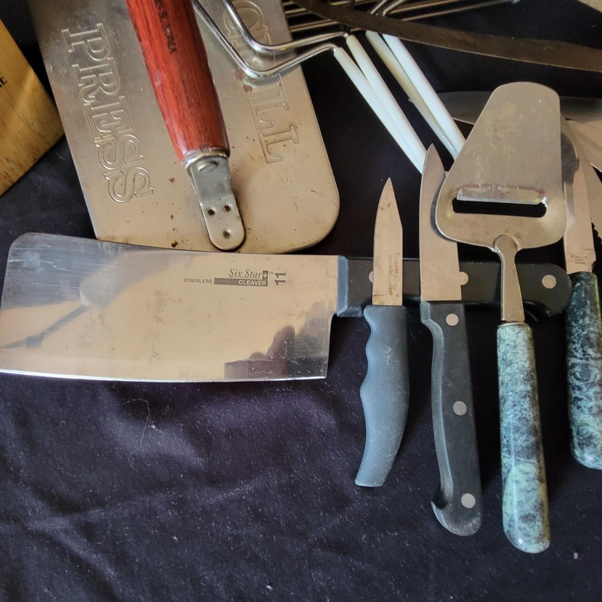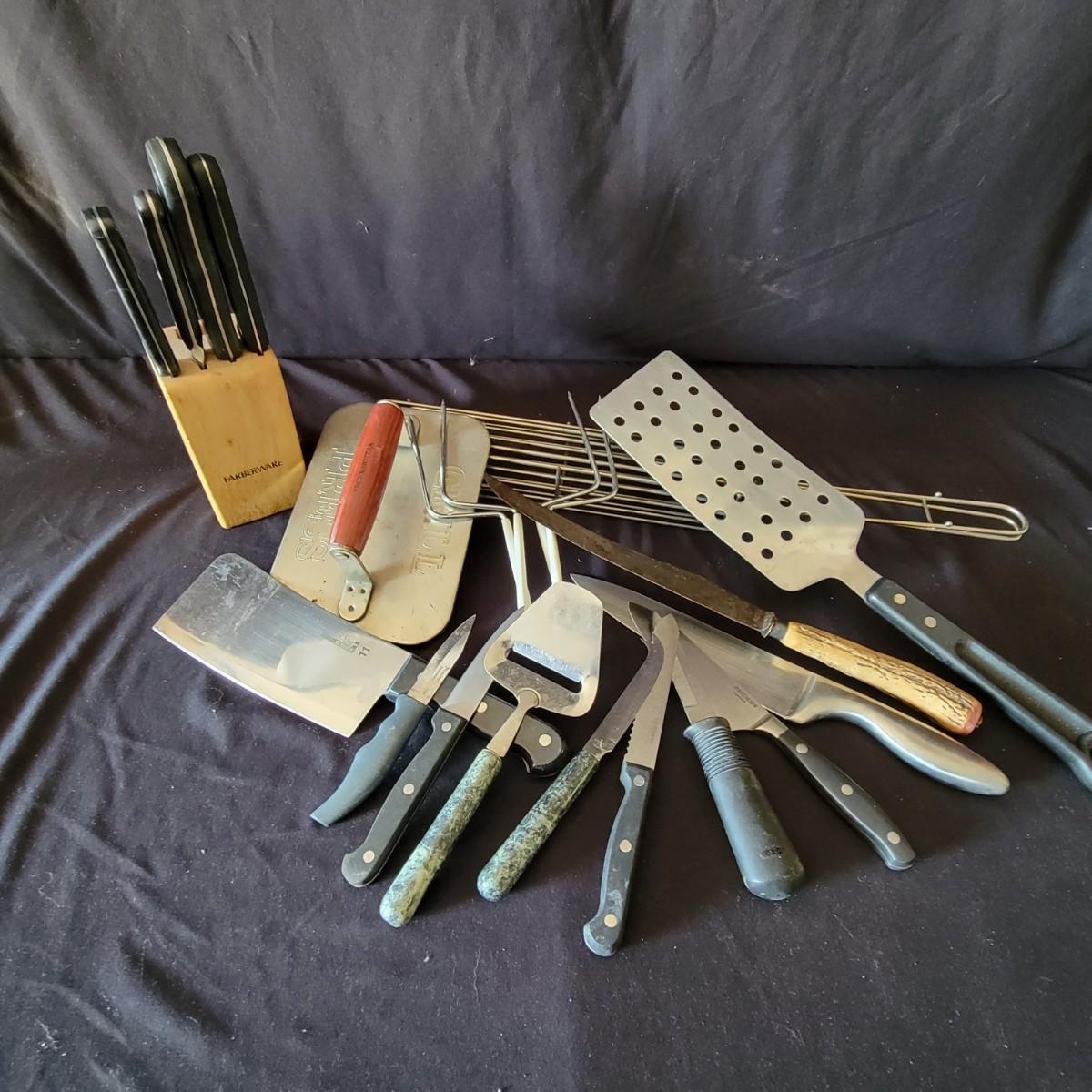 Farberware knife and block, grill press, grilling spits, grilling spatula, marble handled cheese set, wire vegetable cage for grilling and 8 assorted knives.