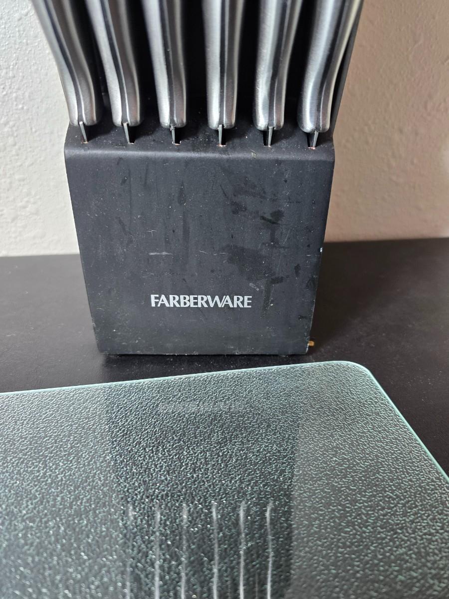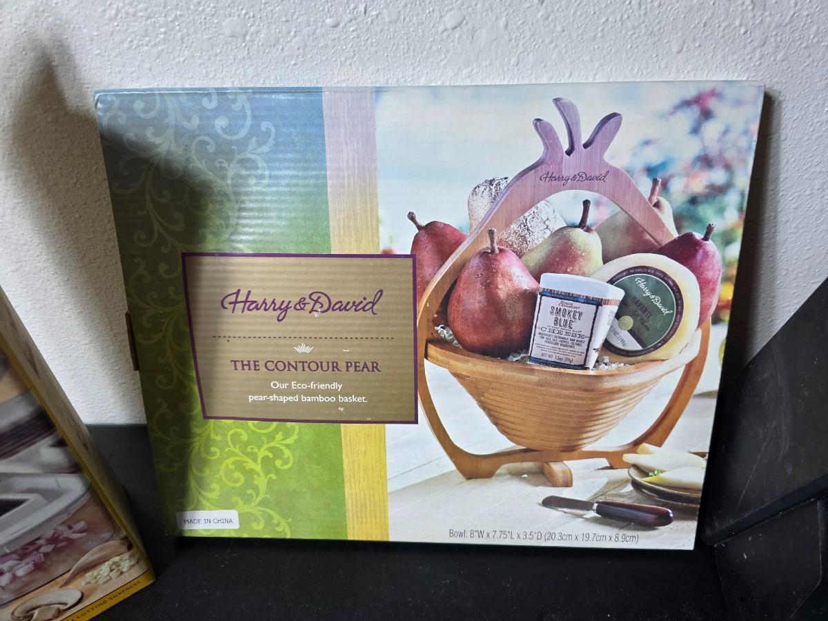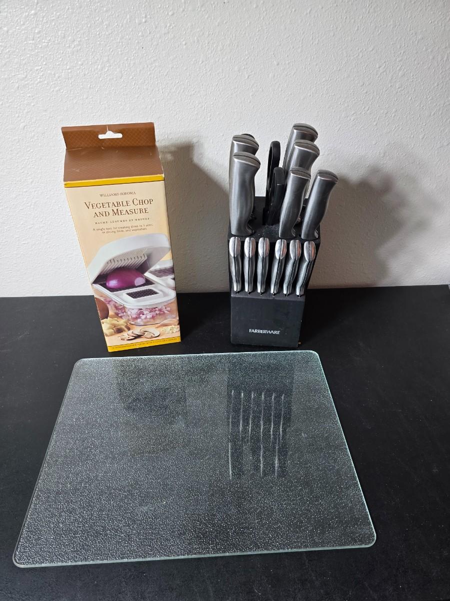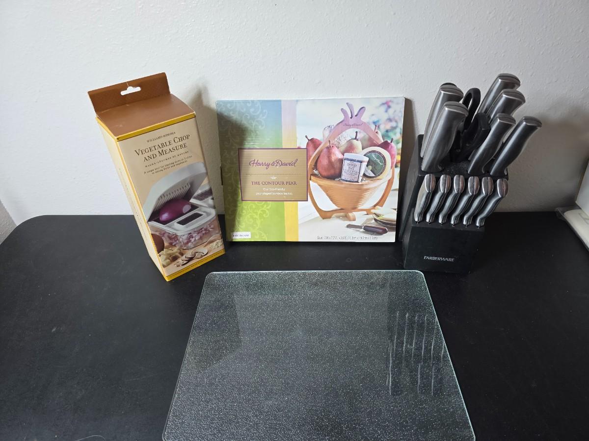Farberware knife set in Knife block, glass cutting board, Williams Sonoma Vegetable chopper and a Harry & David Contour Pear bamboo wooden basket