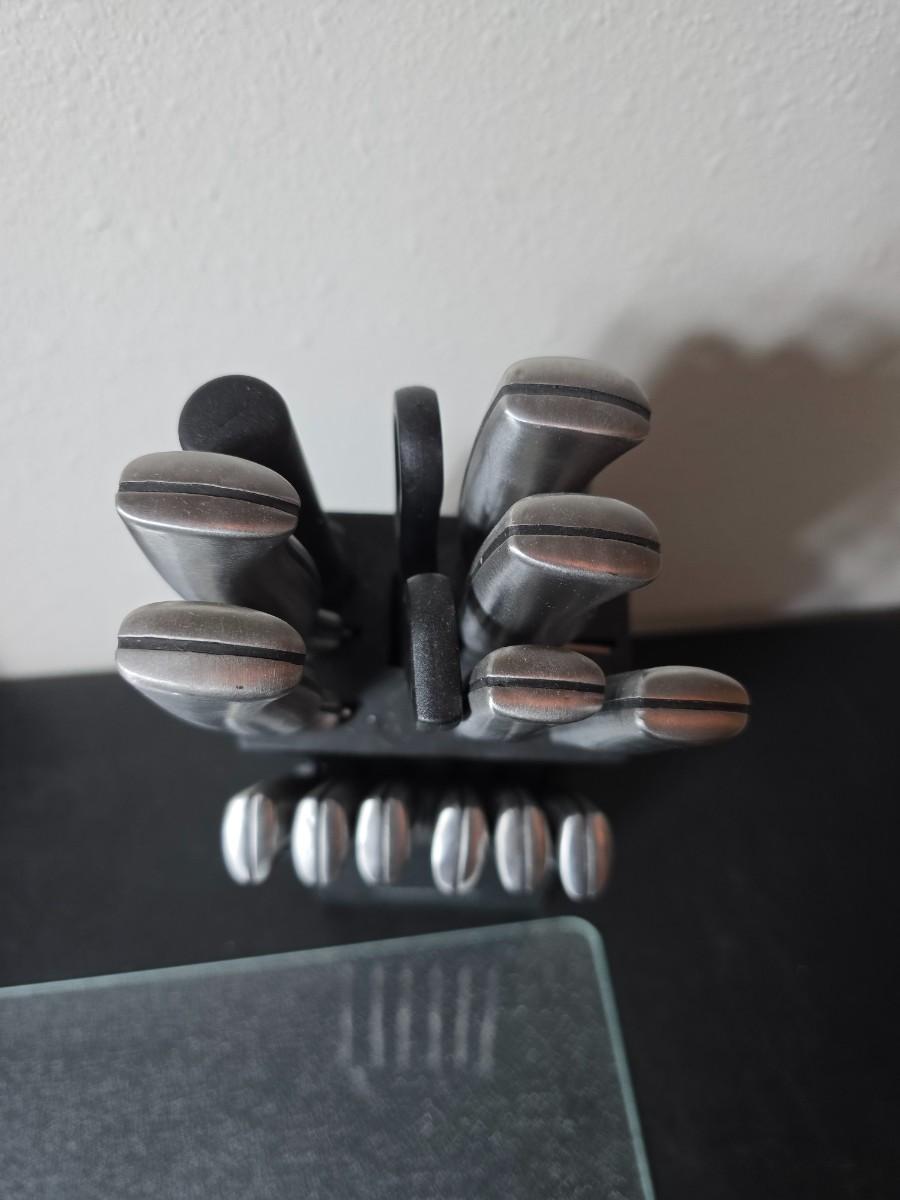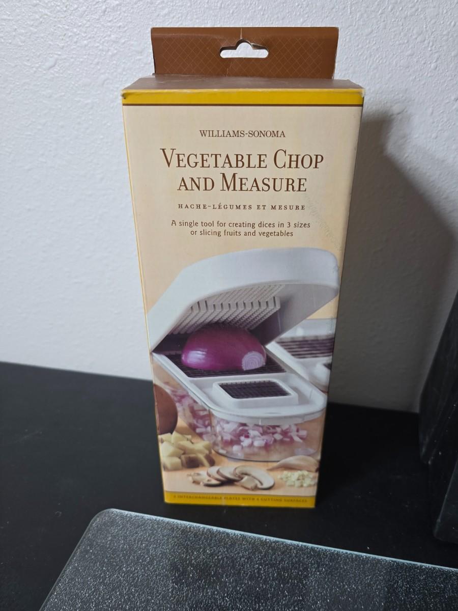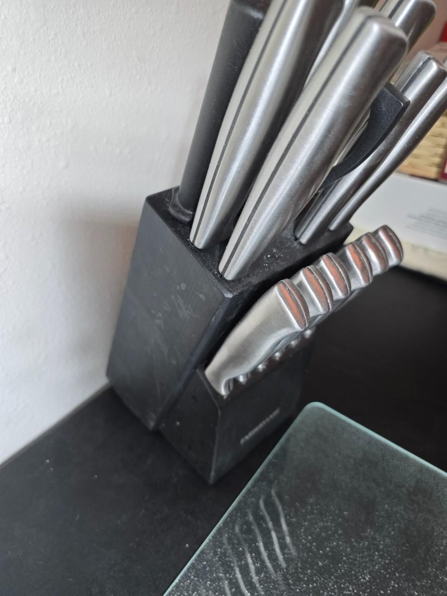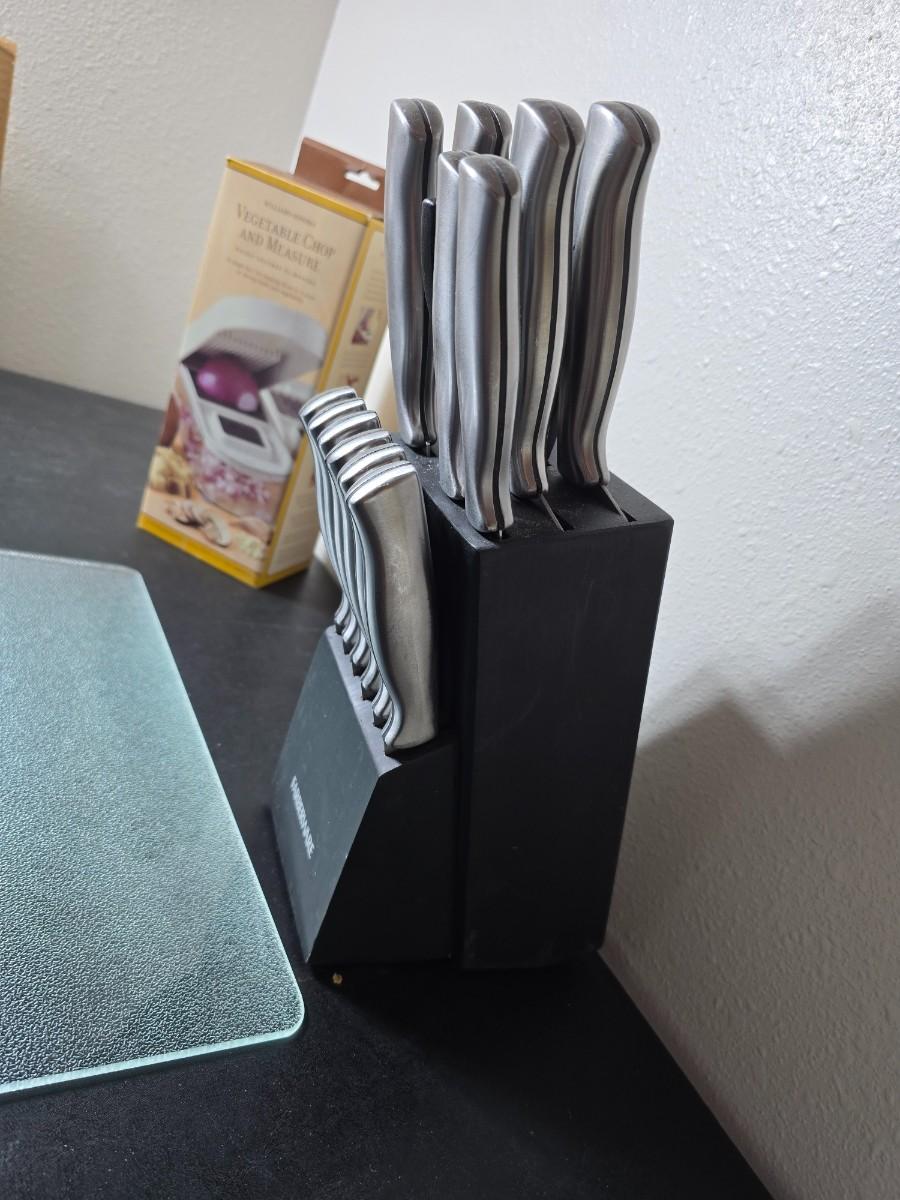 Farberware knife set in Knife block, glass cutting board, Williams Sonoma Vegetable chopper and a Harry & David Contour Pear bamboo wooden basket