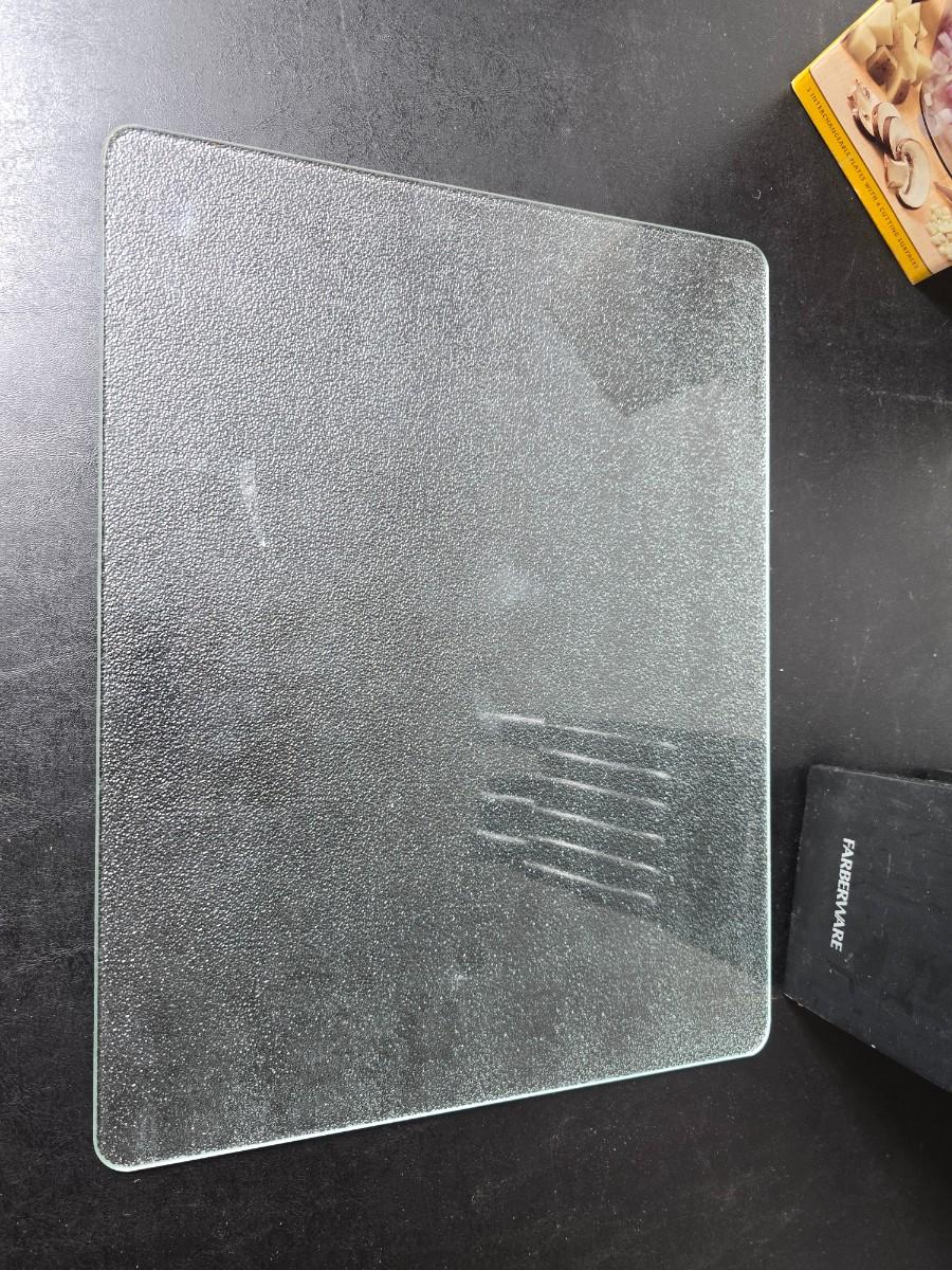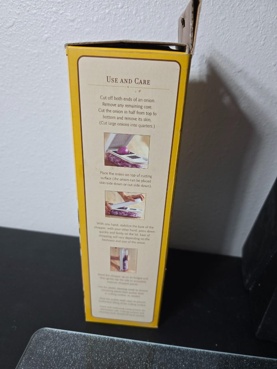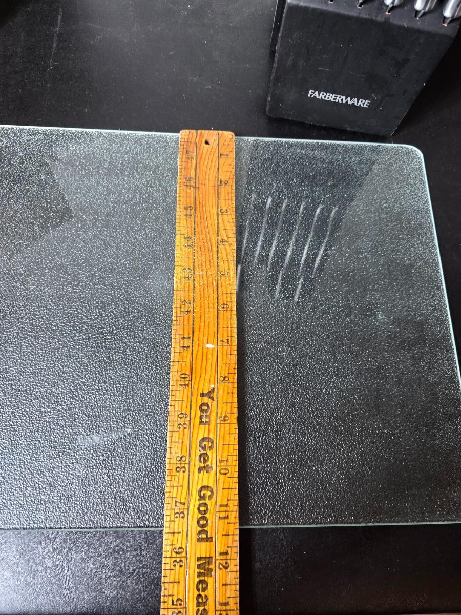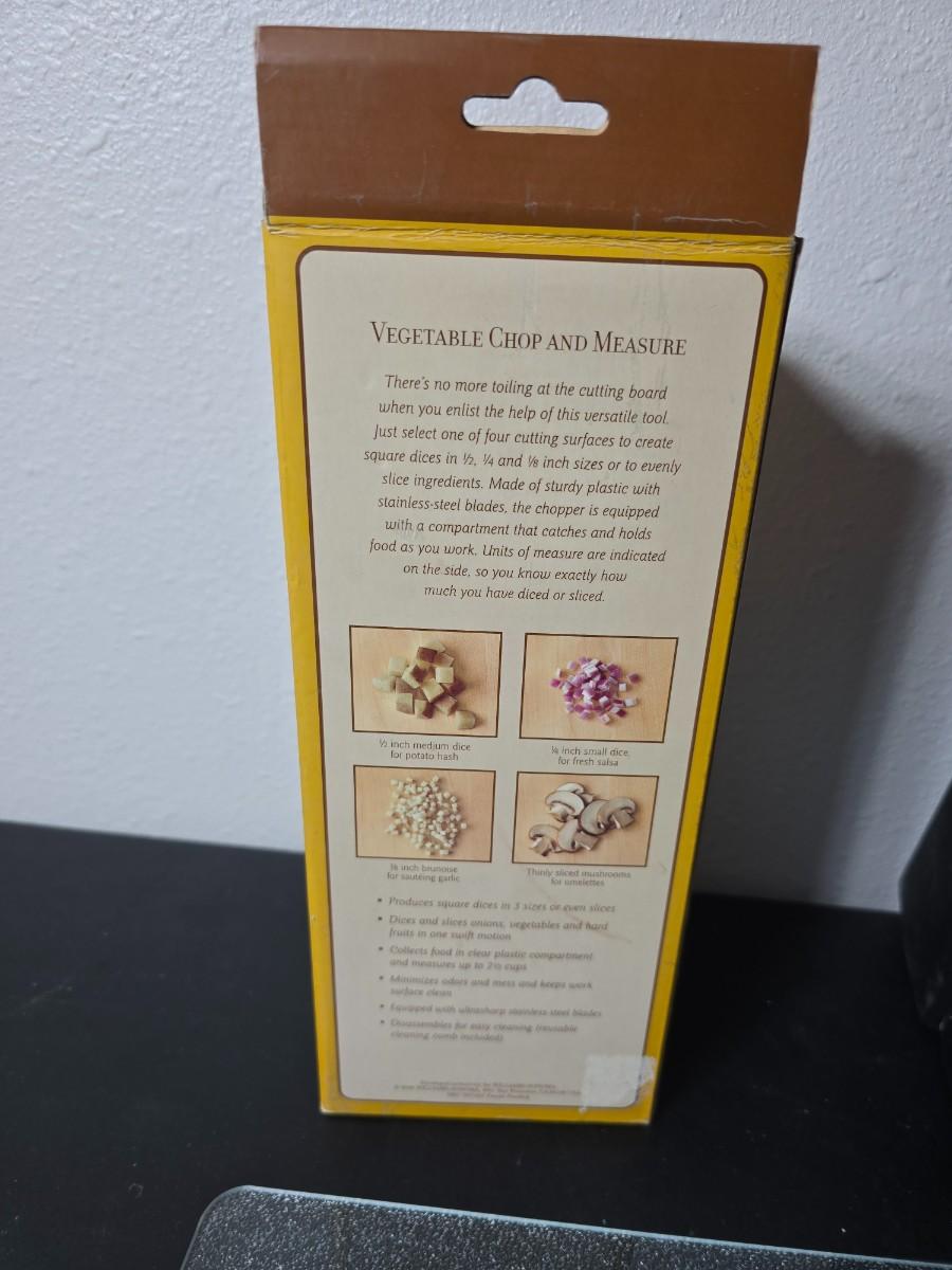 Farberware knife set in Knife block, glass cutting board, Williams Sonoma Vegetable chopper and a Harry & David Contour Pear bamboo wooden basket