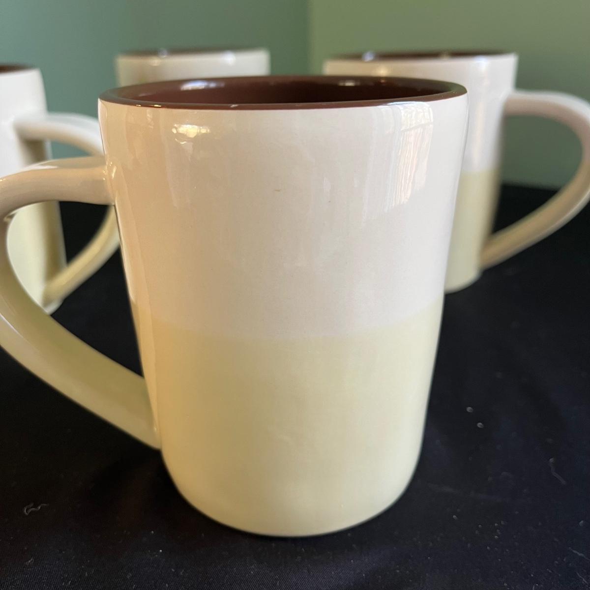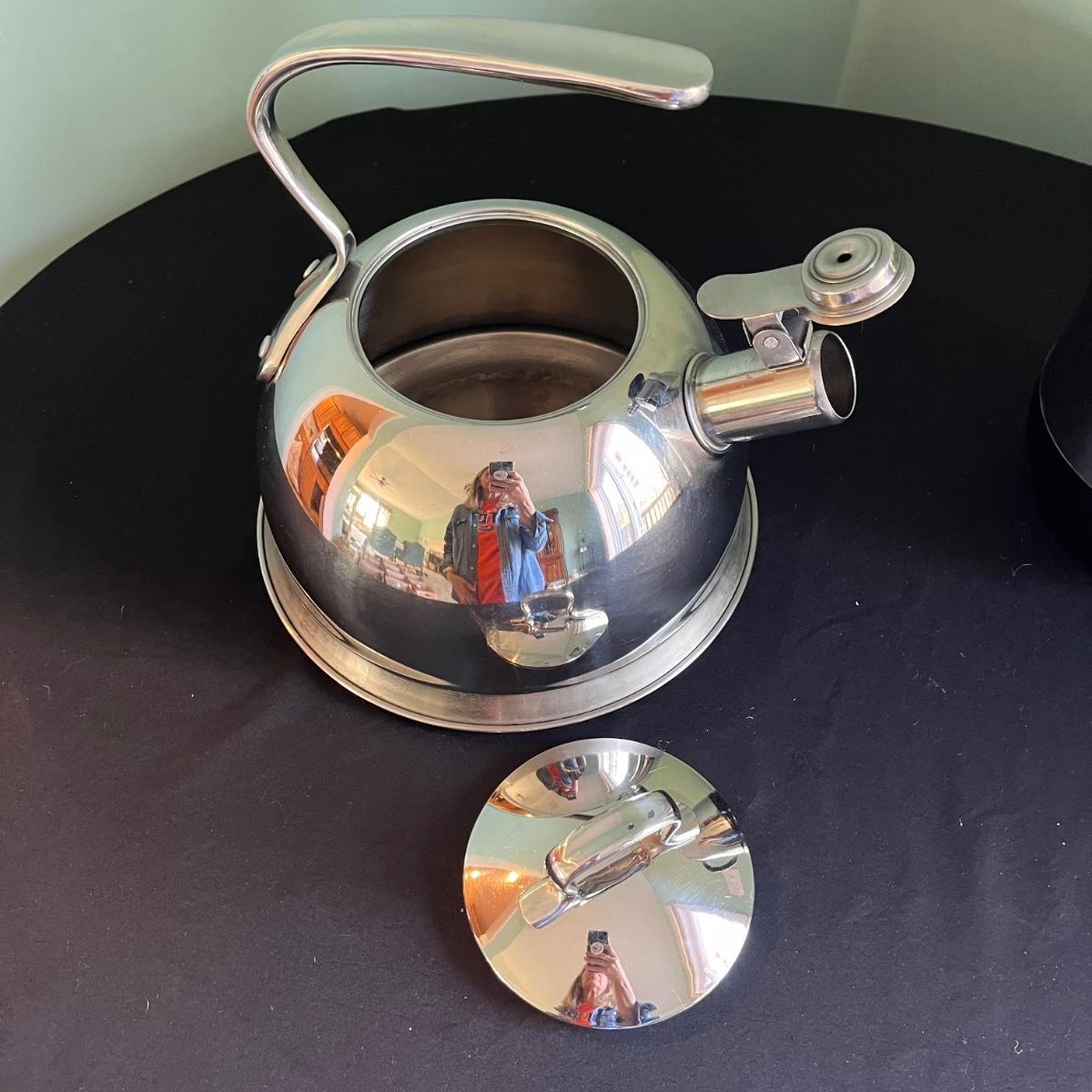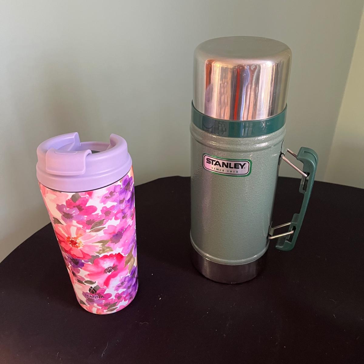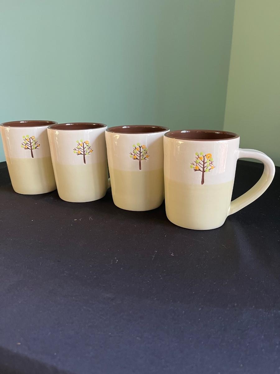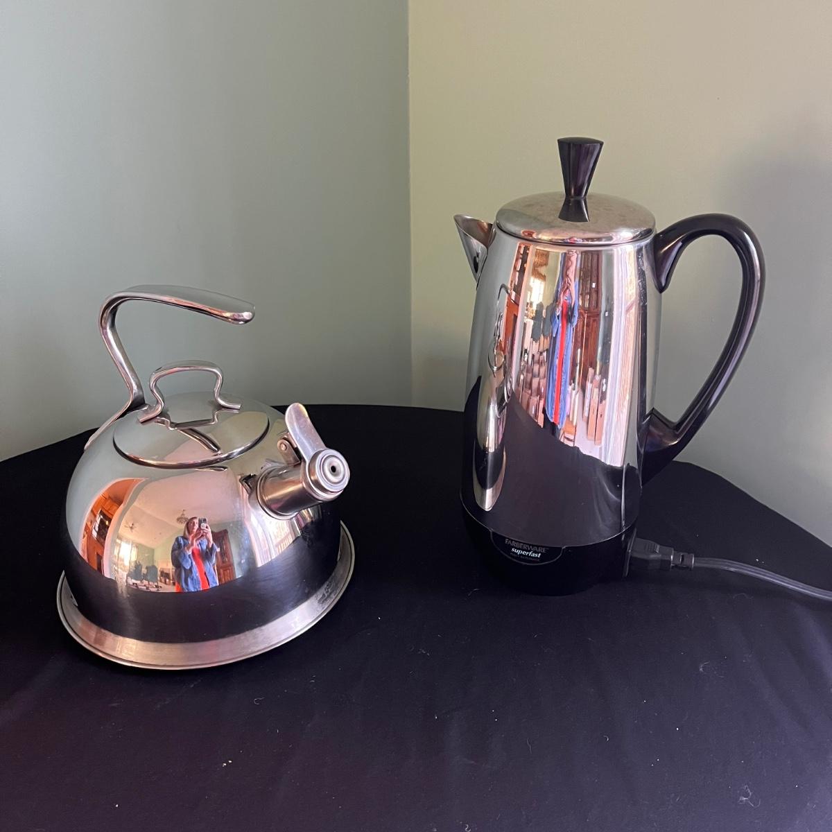 This grouping includes a Farberware percolator, a Phillipe Richard silver teakettle, a Stanley insulated thermos, a floral insulated tumbler and four ceramic Starbucks mugs. The mugs are 14 oz size. Percolator heated when plugged in. The Stanley thermos has a few dents in the stainless lid.