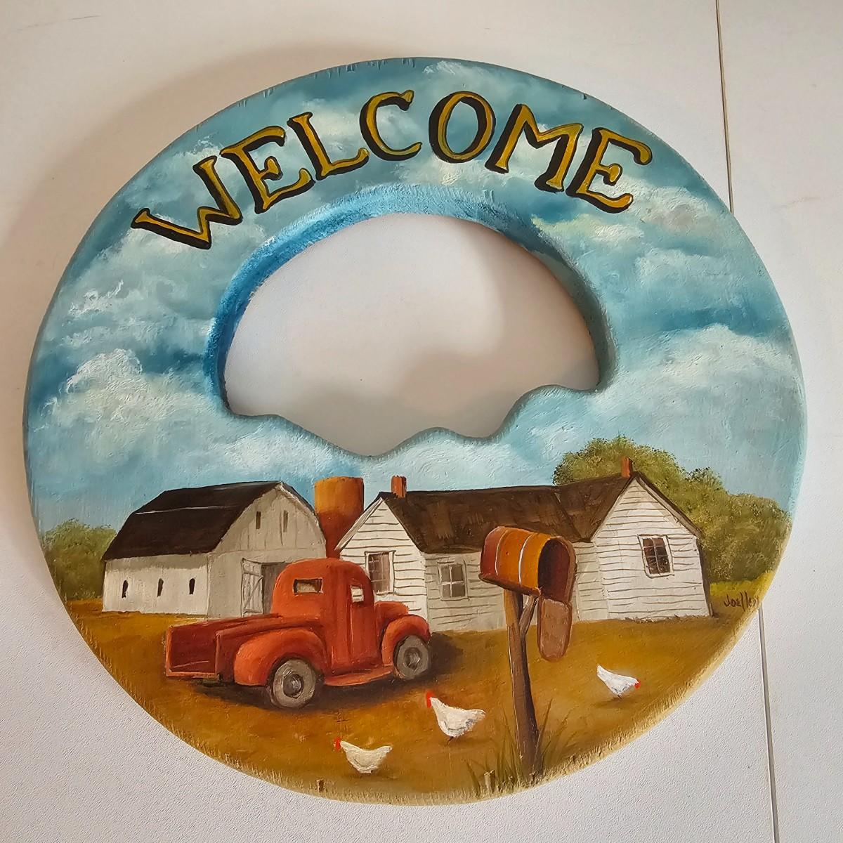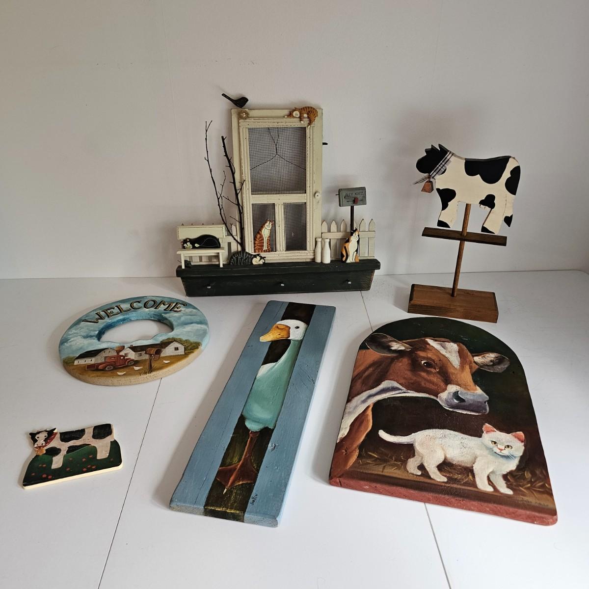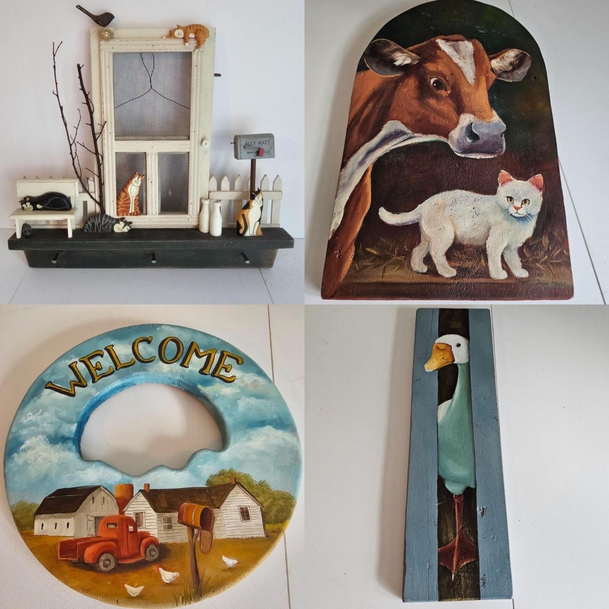 Delightful images of barn animals and more on hangable plaques. Cats w/screen door is coat or key hanger, measures 18" x 17"H. Goose is hand painted on barn wood, measures 6" x 21"H. Cow and cat are also hand painted, measure 11" x 18"H. See photos for details. Shipping available. Shipping can be costly. We suggest contacting our preferred local shipping provider, Postage Express, with dimensions and getting an estimate before bidding: (828) 670-5501 or shipping@postageexpressnc.com