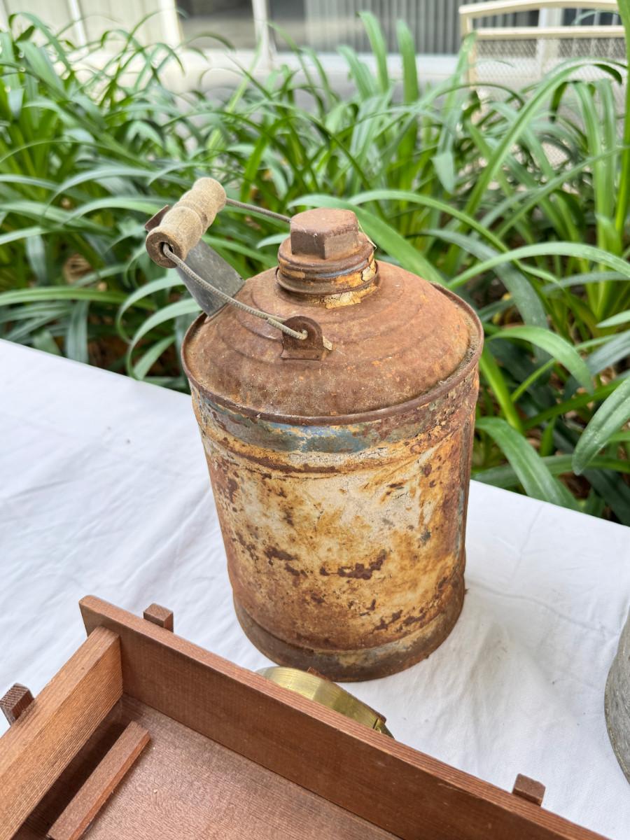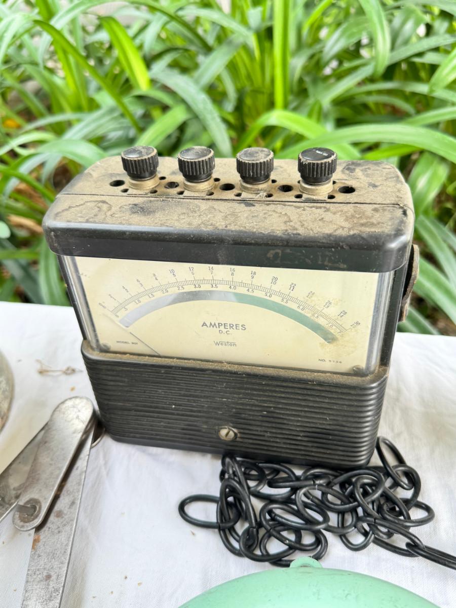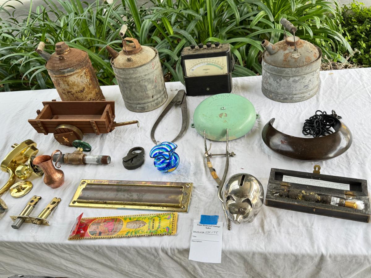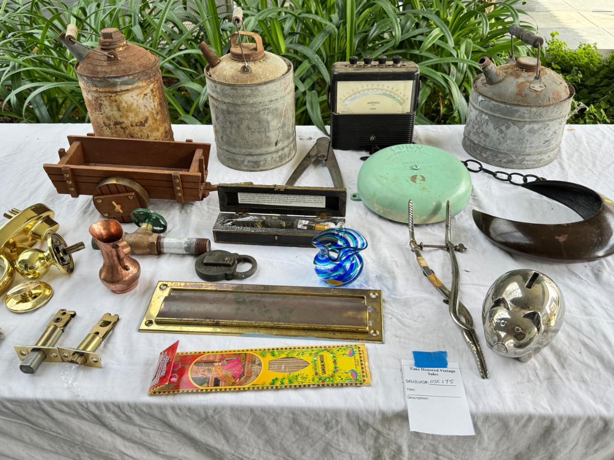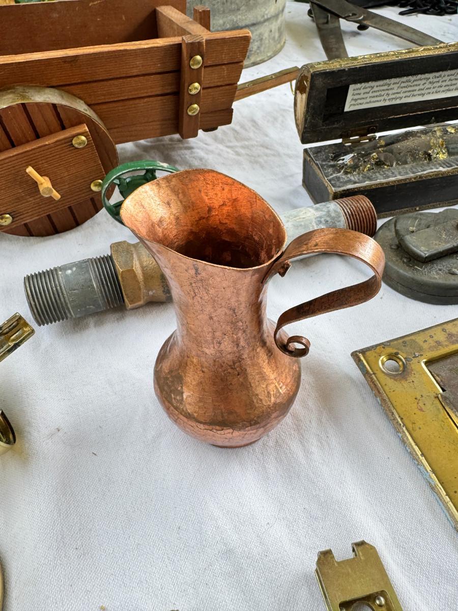 Redwood souvenir wagon, rustic farm cans, 2 calipers, Ampermeter, Untested, Los Angeles drive over bell ( not working) Incense, Hanging half moon candle holder with chain ( some rust) Small copper pitcher, blue white glass pitcher small crack. No Shipping