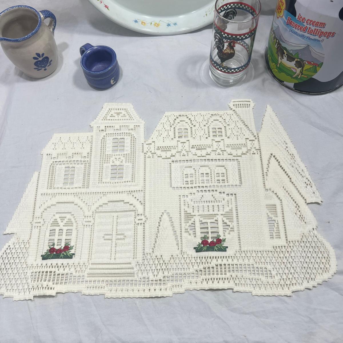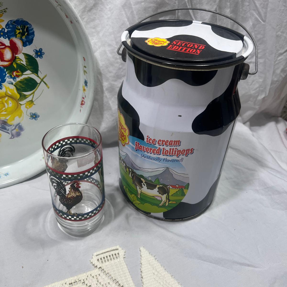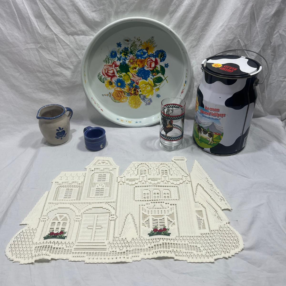 Farm style Miscellaneous Household/ Kitchen goods; church doily, Cow tin, flower baking pan, cream pourer, small cup, rooster glass