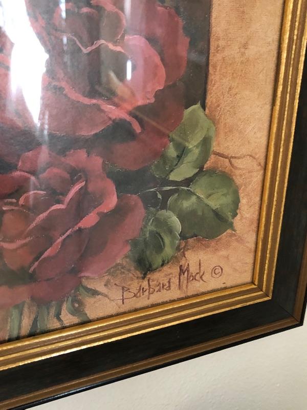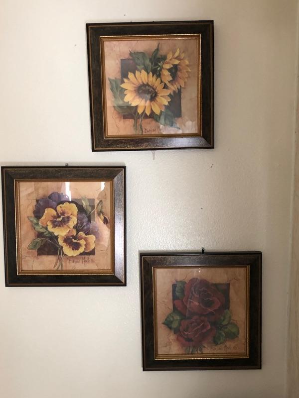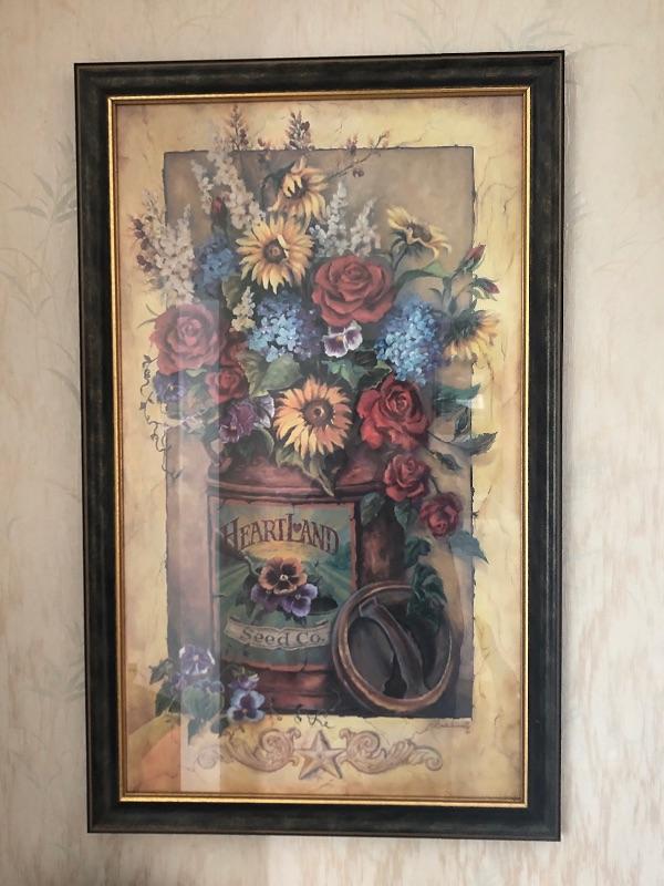 Country farmhouse style floral bouquet print with 3 smaller matching prints. Larger print has a colorful bouquet in a milk can. Smaller prints are of sunflowers, pansys, and roses. They are similar but the larger is a different artist then the smaller 3 prints.