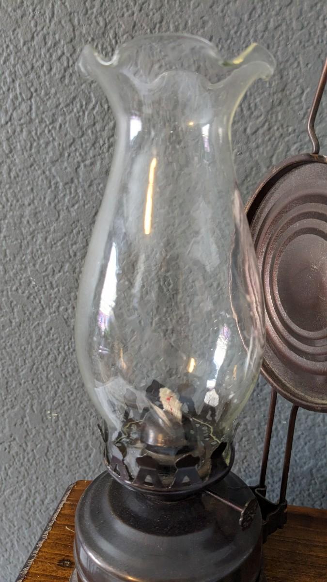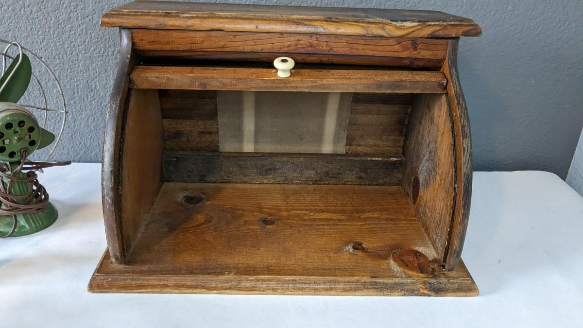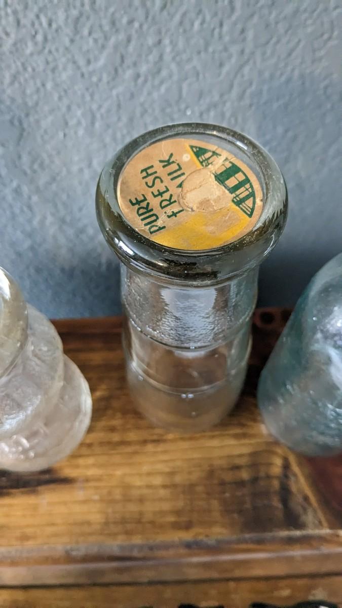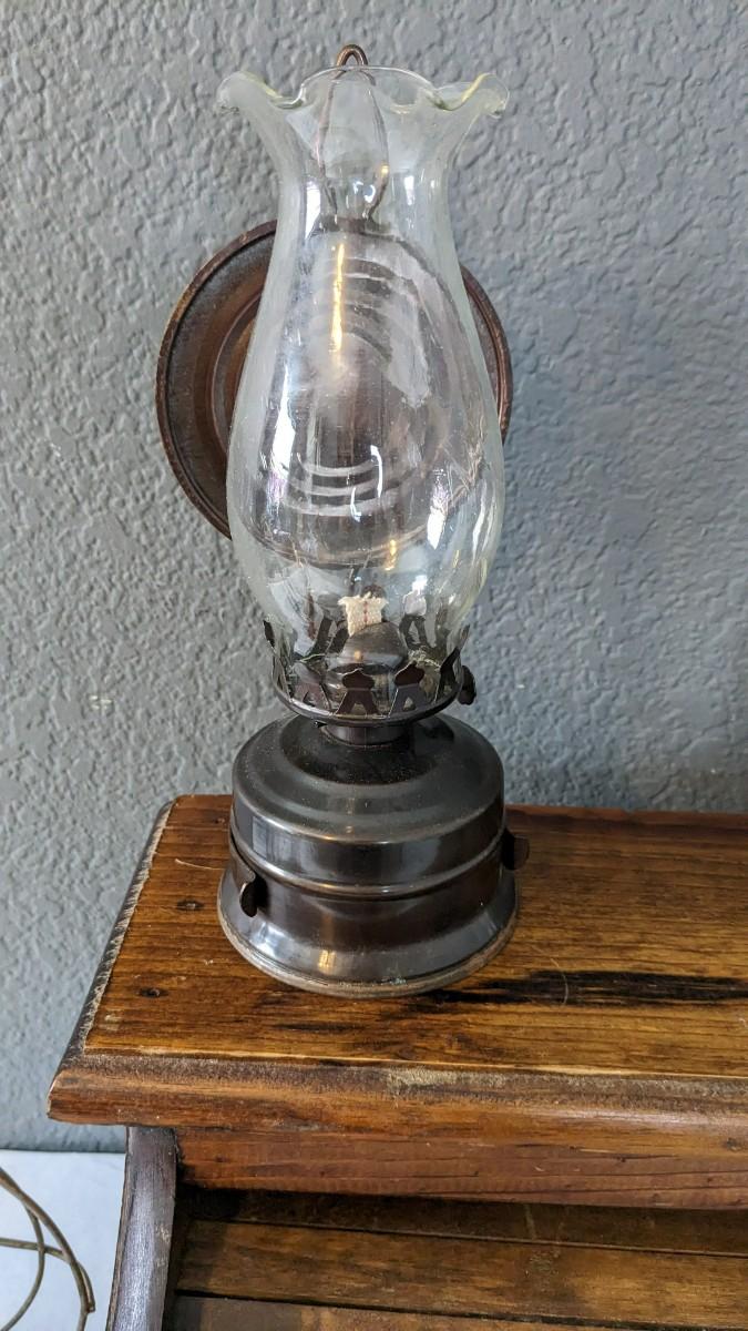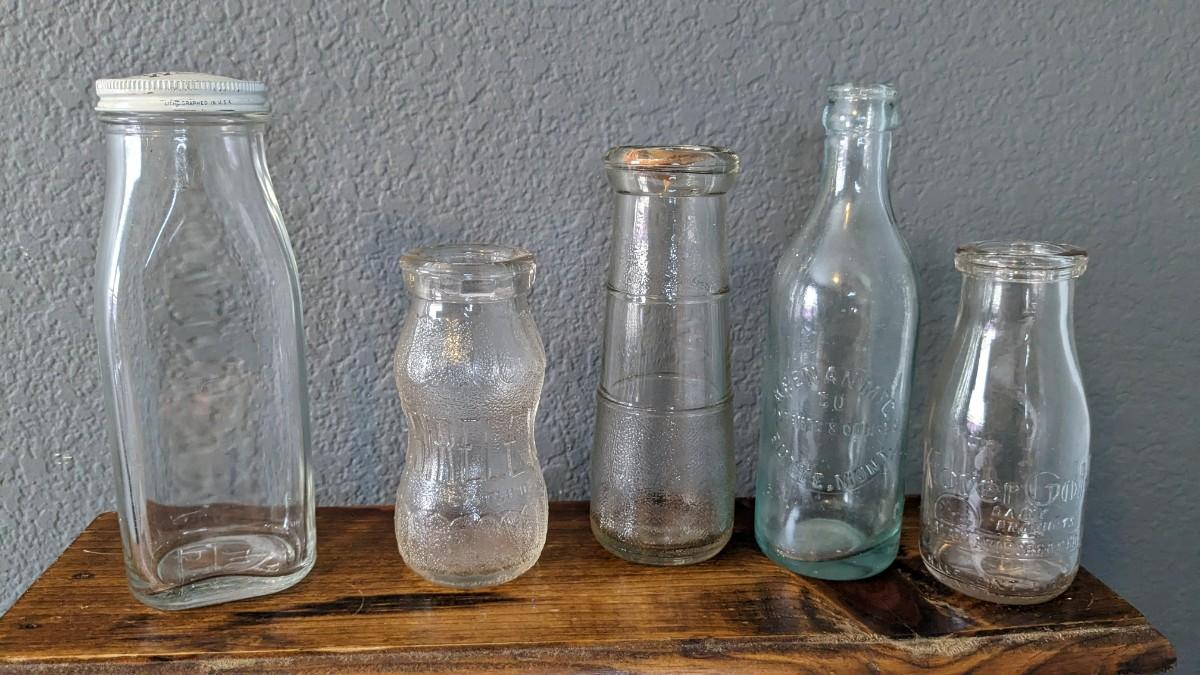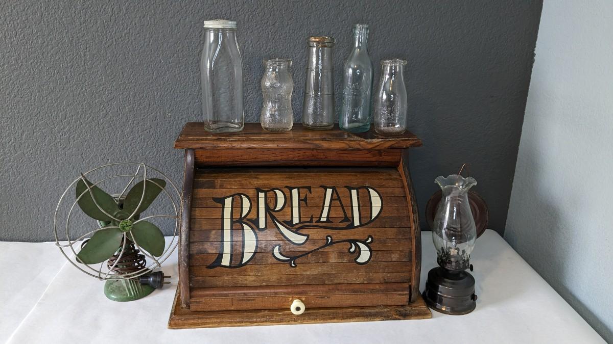 3 milk bottles, 2 varied bottles, non-functioning small wire fan, reproduction wall hanging oil lamp thats functioning, and wood roll top bread box. No shipping