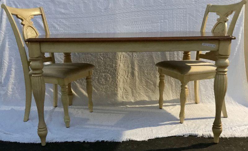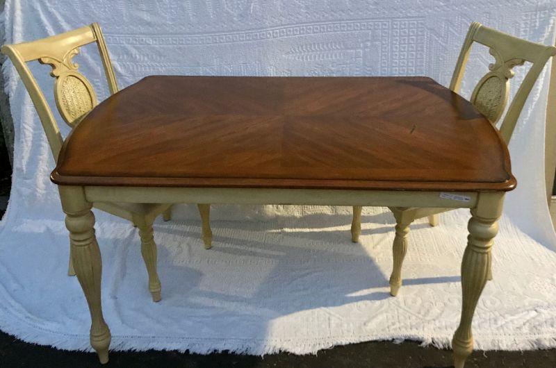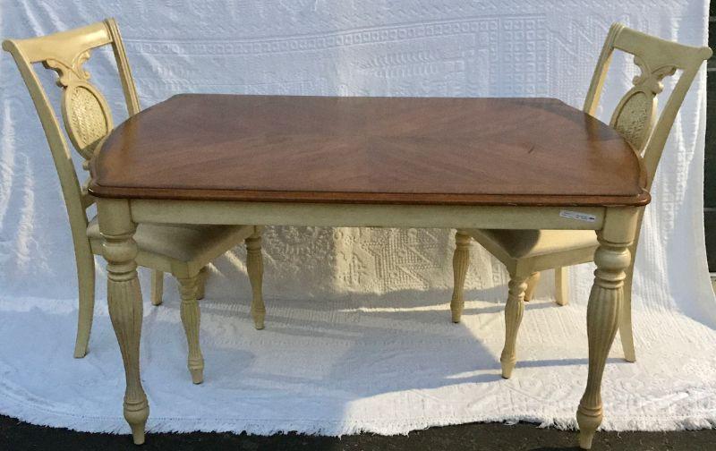 Farmhouse French Country Style dining table with two chairs. Off white with wood top. Padded seats. One piece table.