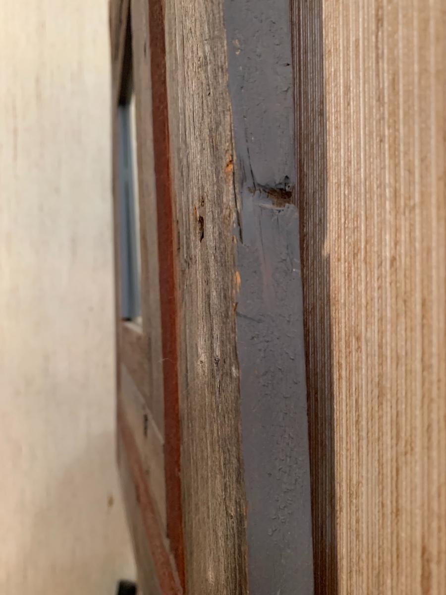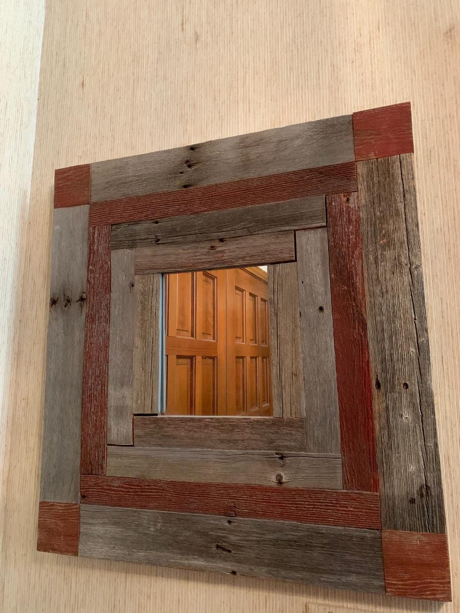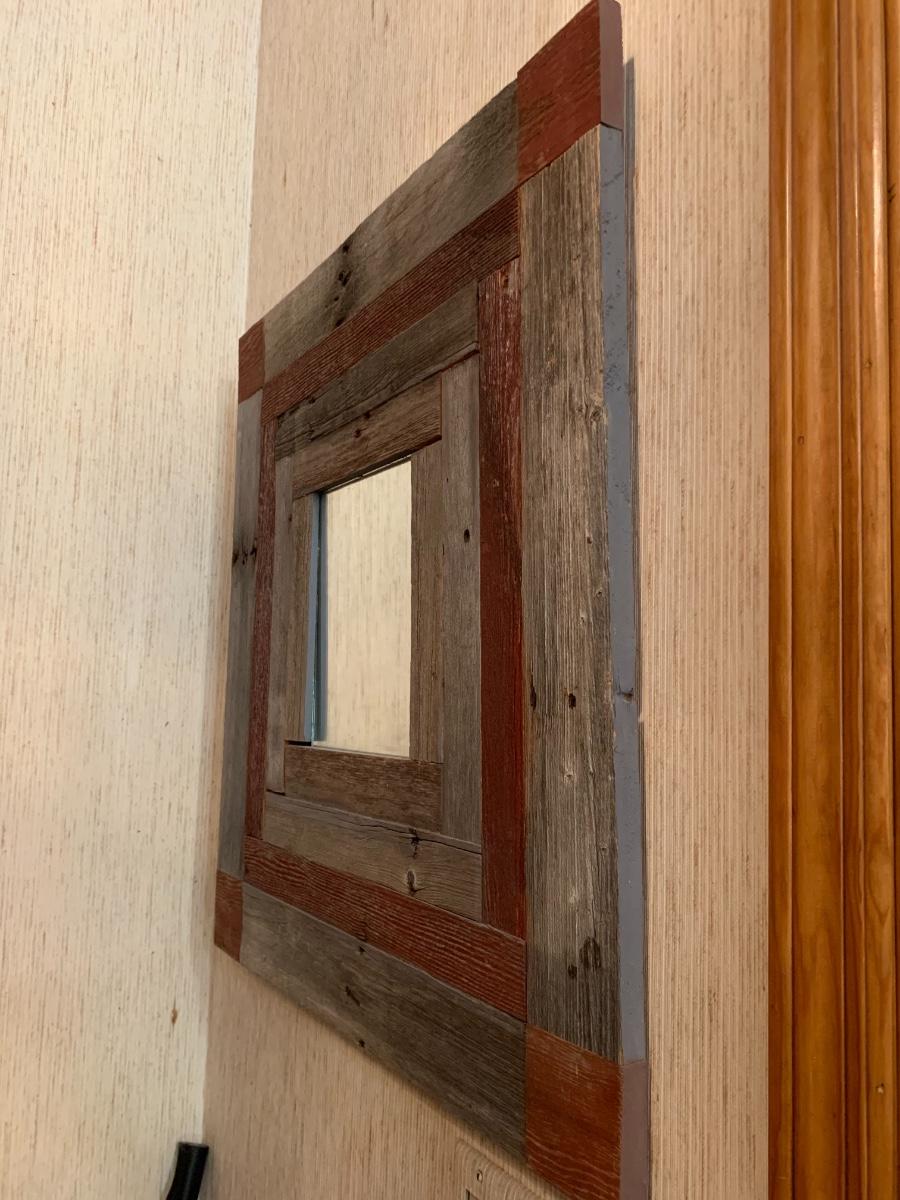 Rustic farmhouse wooden framed mirror (26 inches X 28 inches) (mirror itself is 8 inches X 10 inches) in fair condition