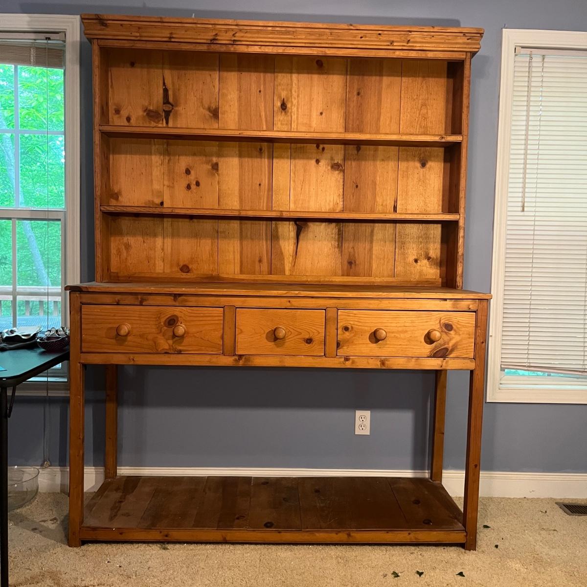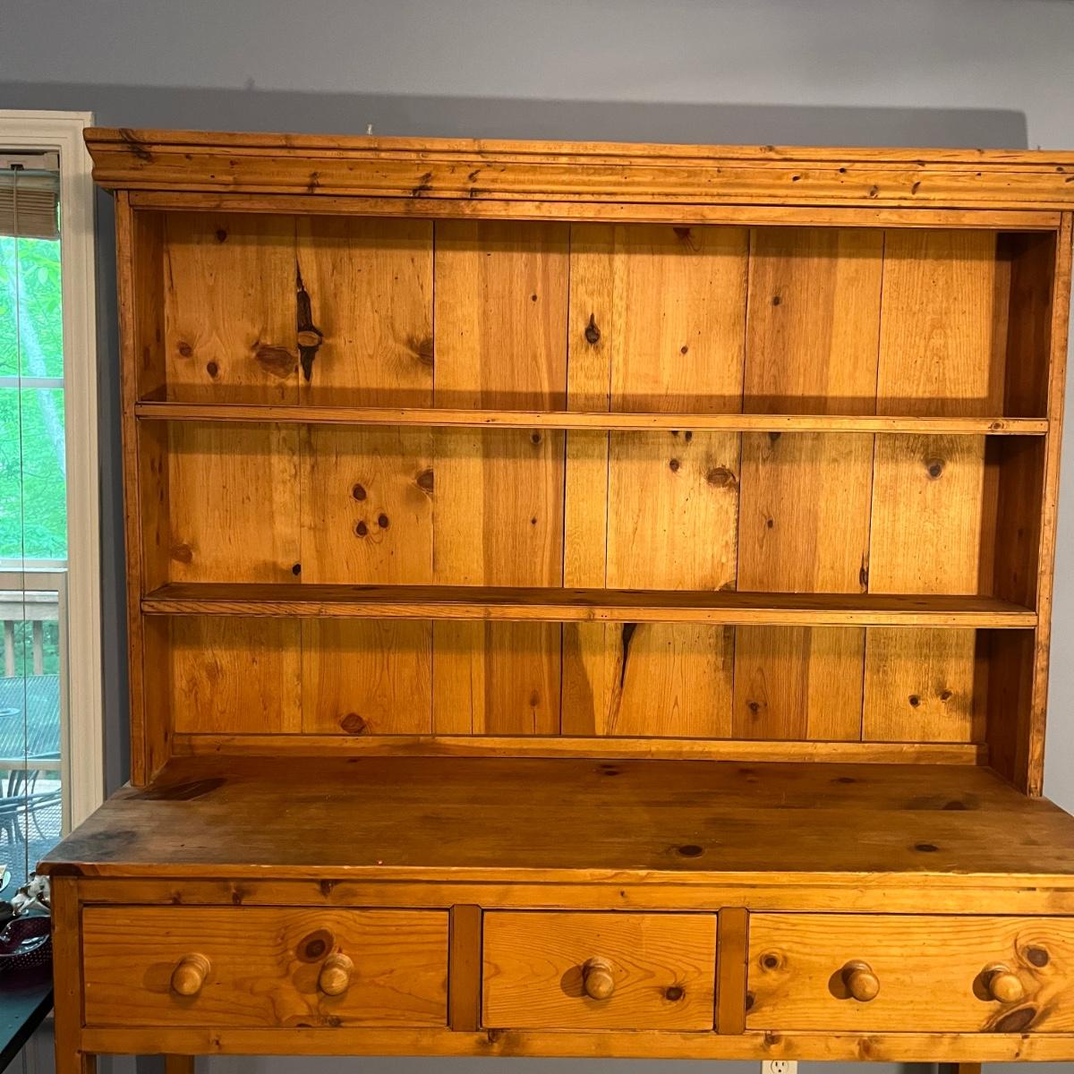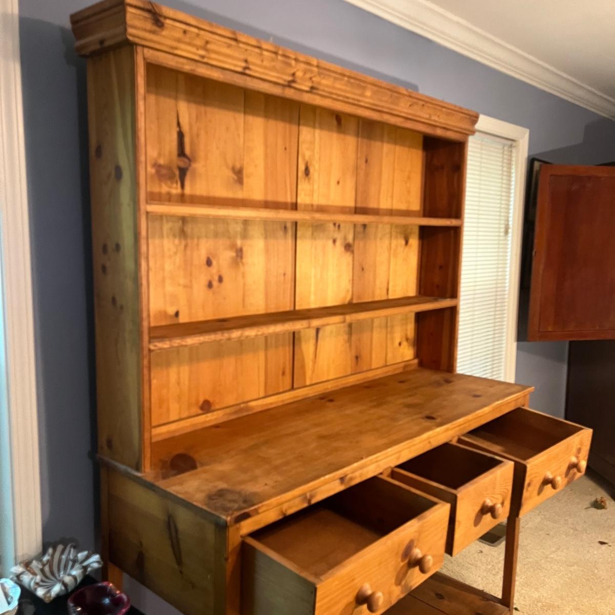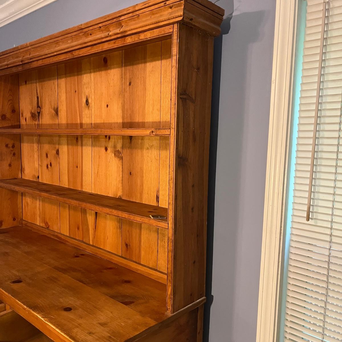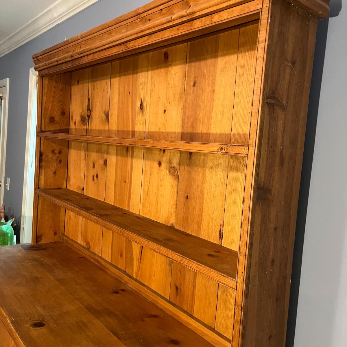 Lot includes a pine wood farmhouse open top hutch with a kitchen dresser. This item comes in two pieces for easier transport. Dresser measures 60” x 19” x 38”H and hutch 59” x 7.5” x 41”H.