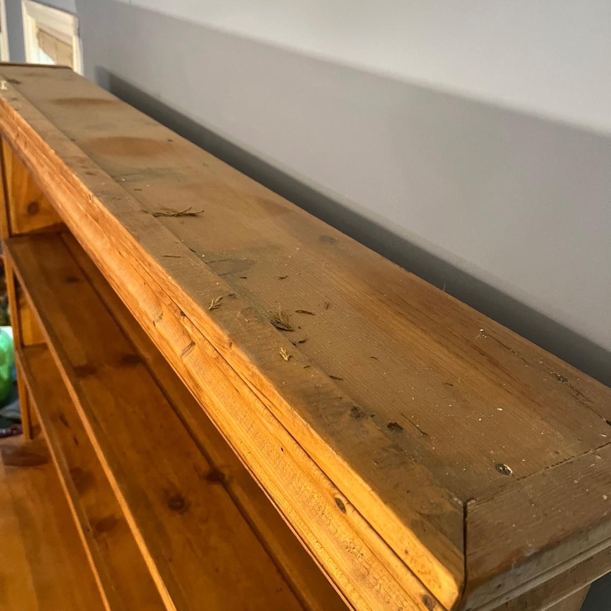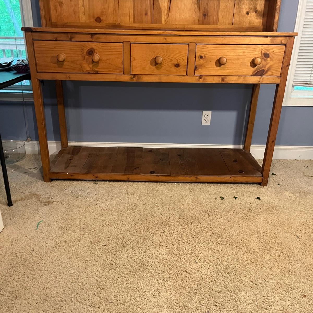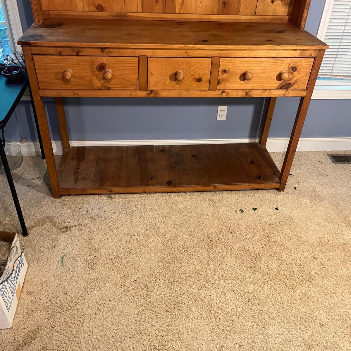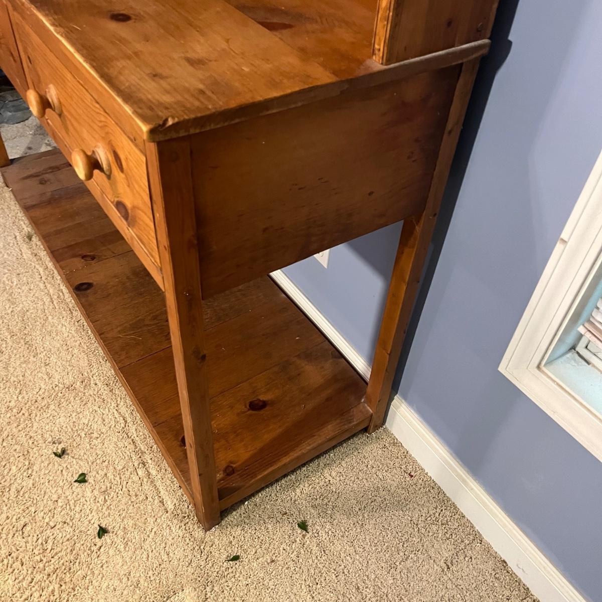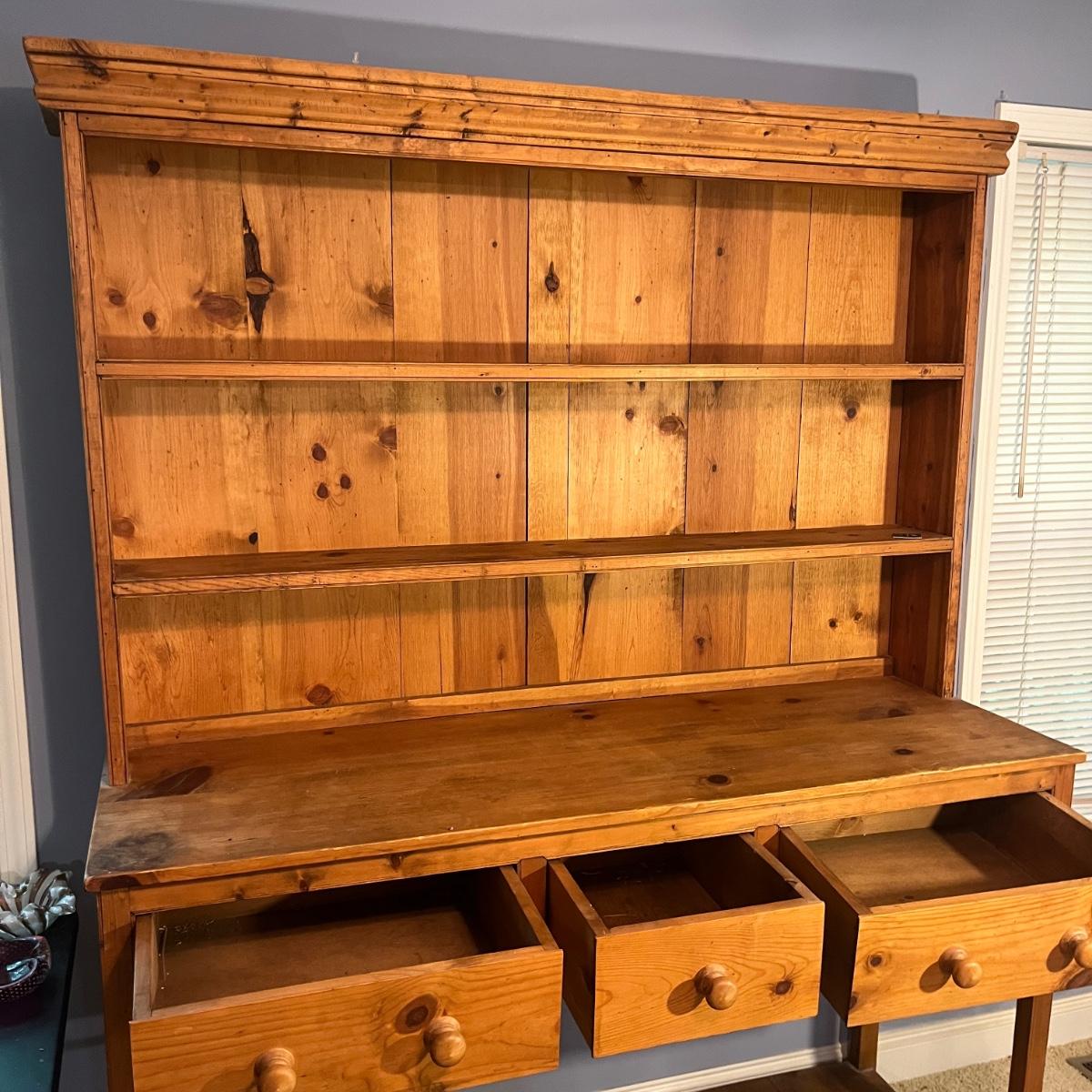 Lot includes a pine wood farmhouse open top hutch with a kitchen dresser. This item comes in two pieces for easier transport. Dresser measures 60” x 19” x 38”H and hutch 59” x 7.5” x 41”H.