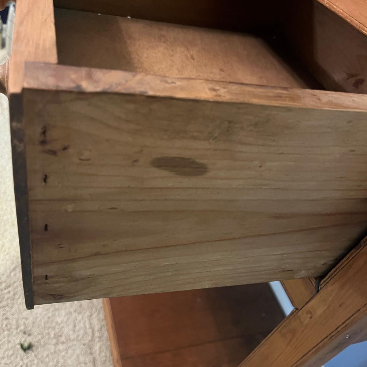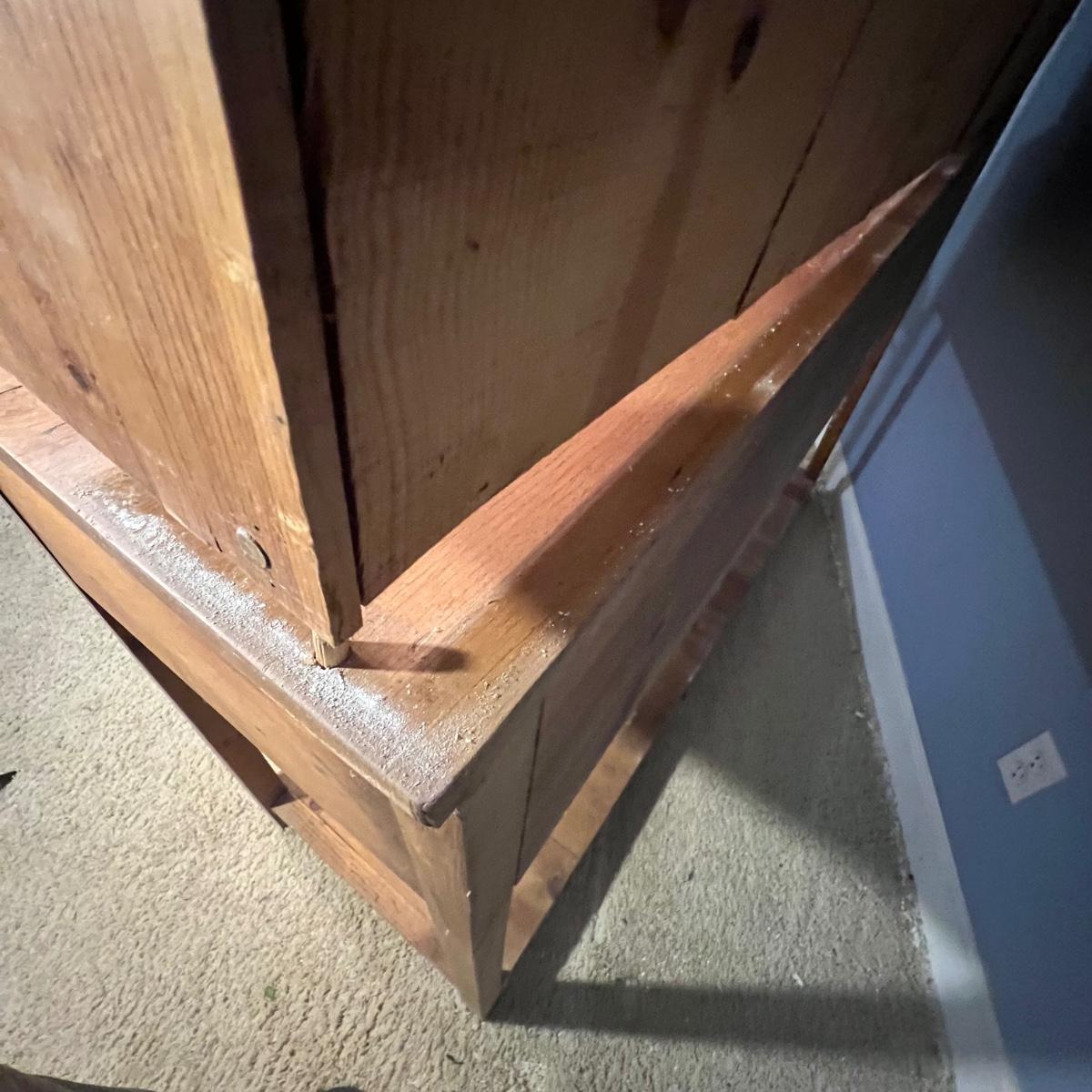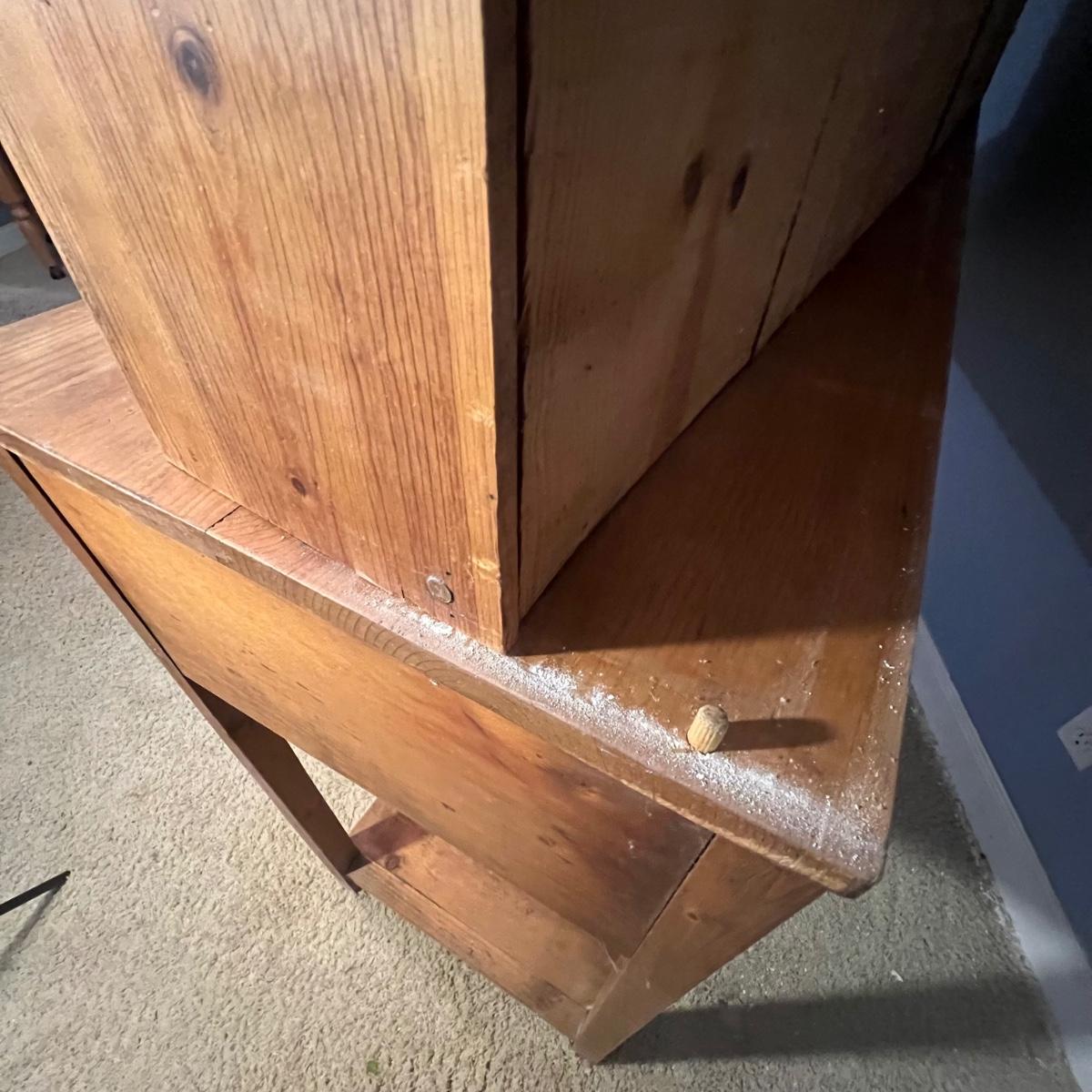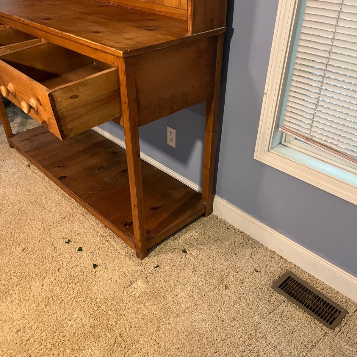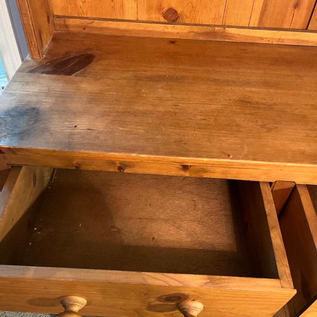 Lot includes a pine wood farmhouse open top hutch with a kitchen dresser. This item comes in two pieces for easier transport. Dresser measures 60” x 19” x 38”H and hutch 59” x 7.5” x 41”H.