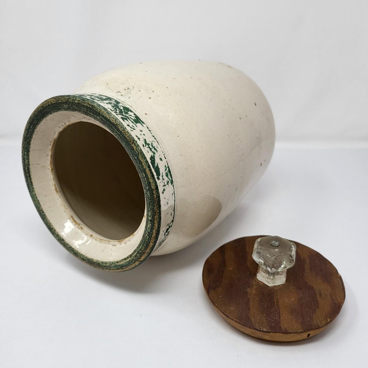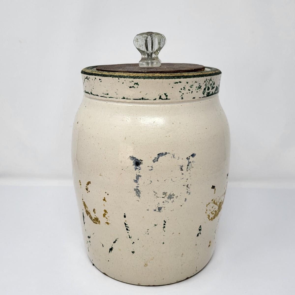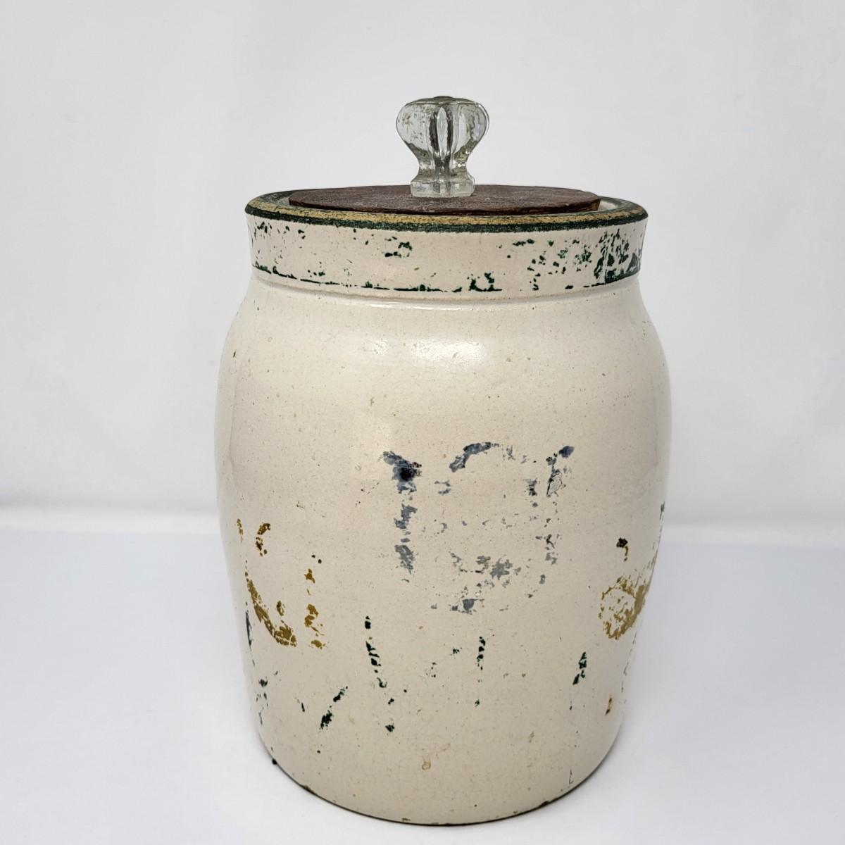 Rustic farmhouse pottery crock 12" tall. Stenciling has worn off, overall good condition. DIY lid has been added.