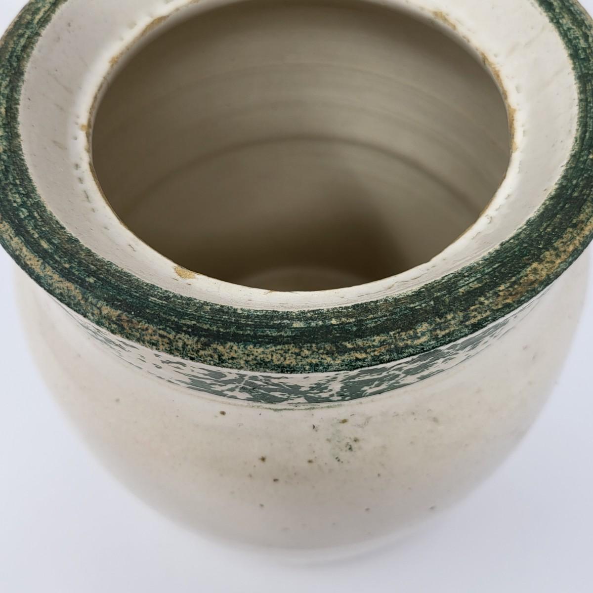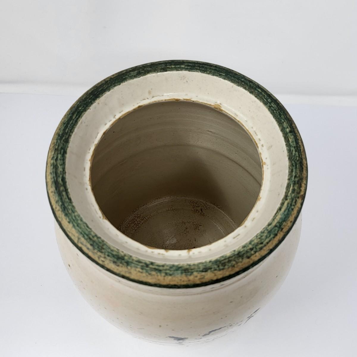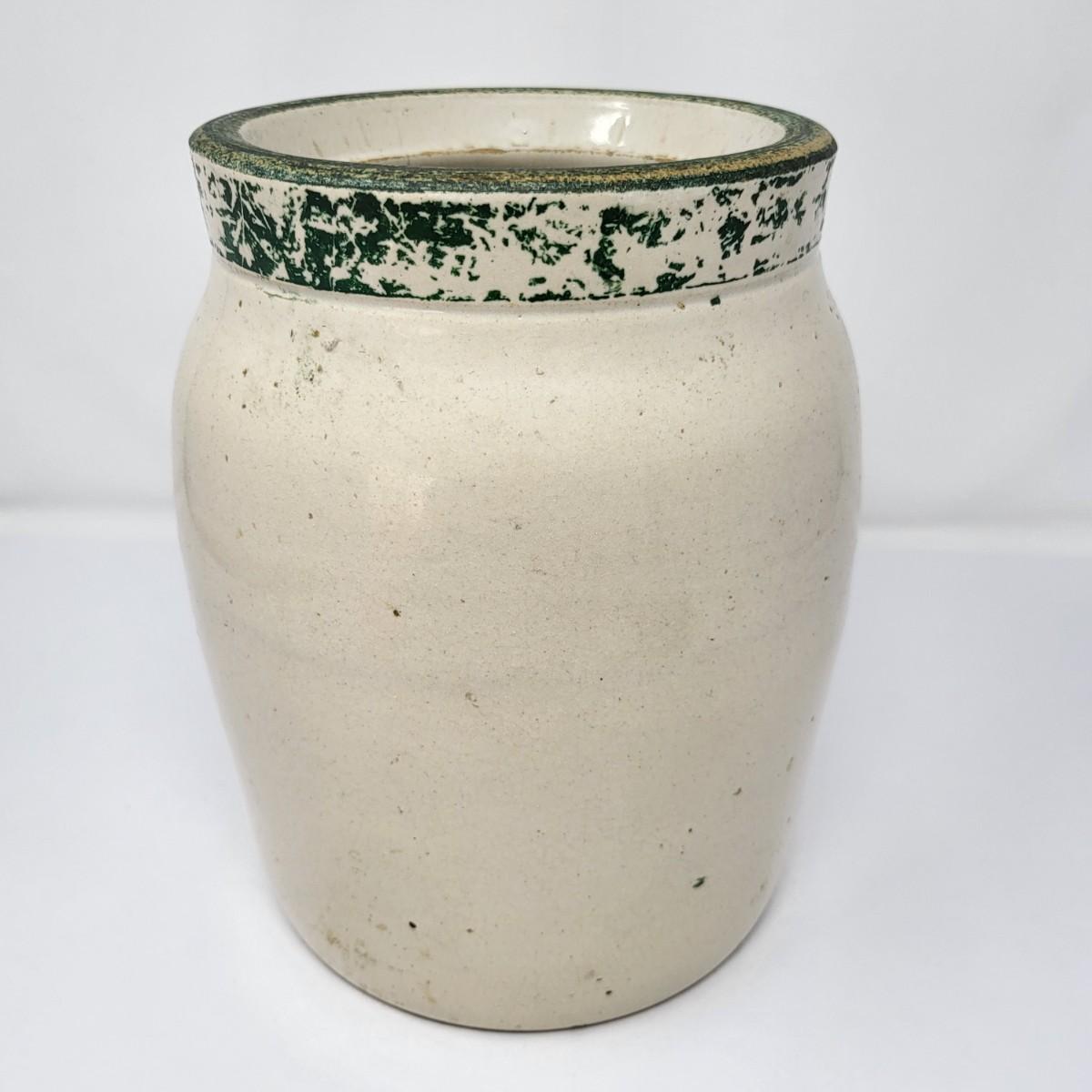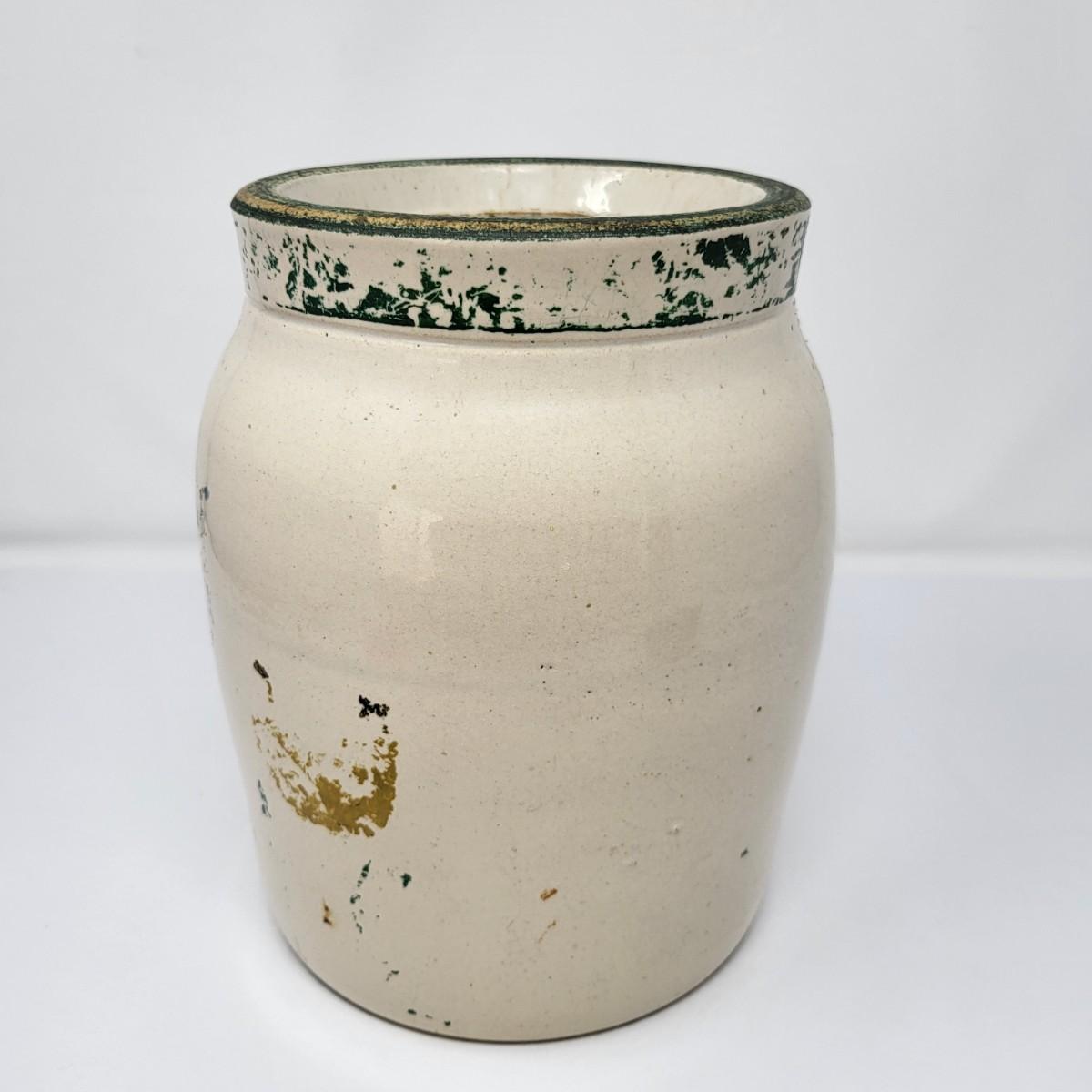 Rustic farmhouse pottery crock 12" tall. Stenciling has worn off, overall good condition. DIY lid has been added.