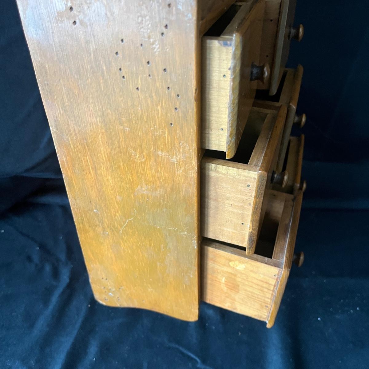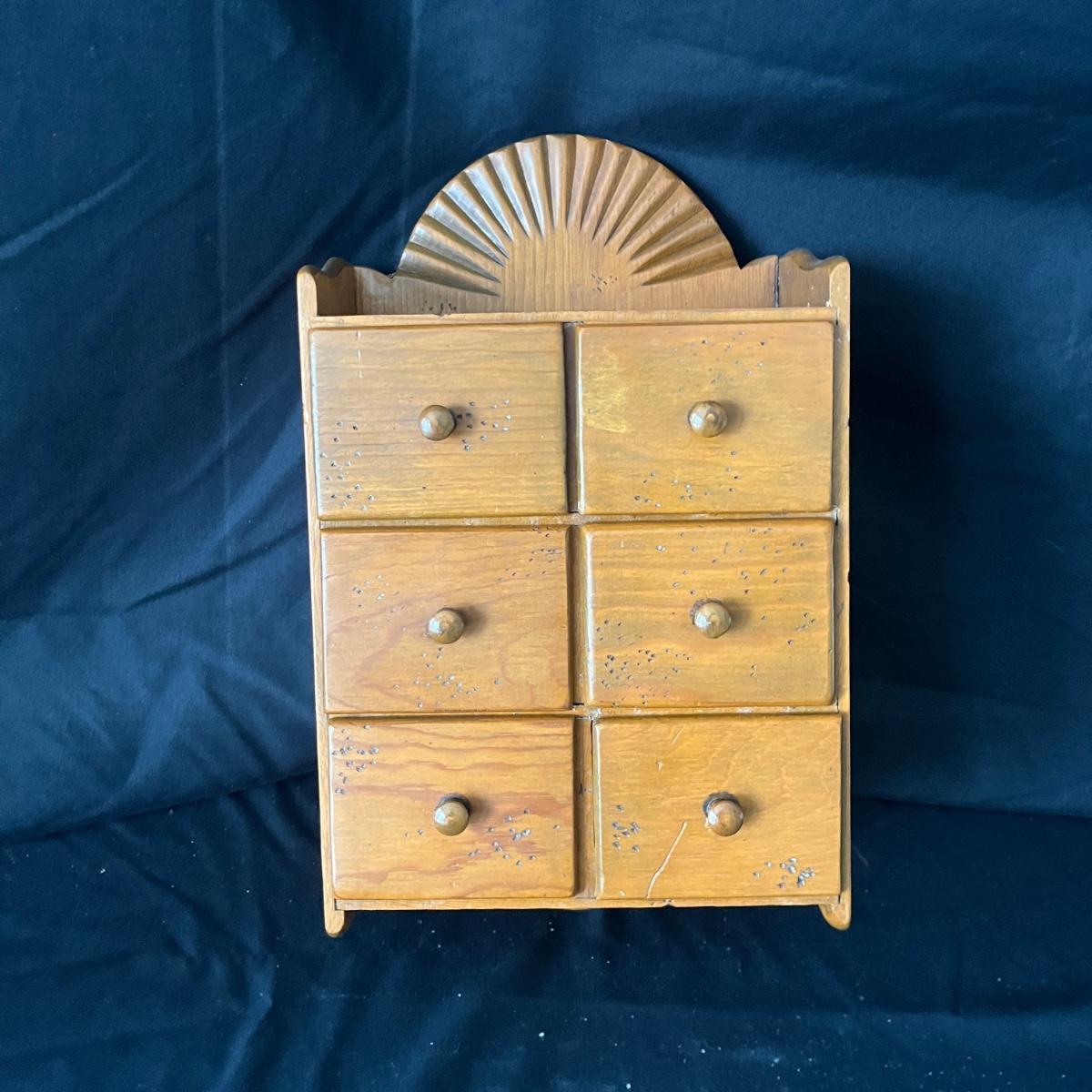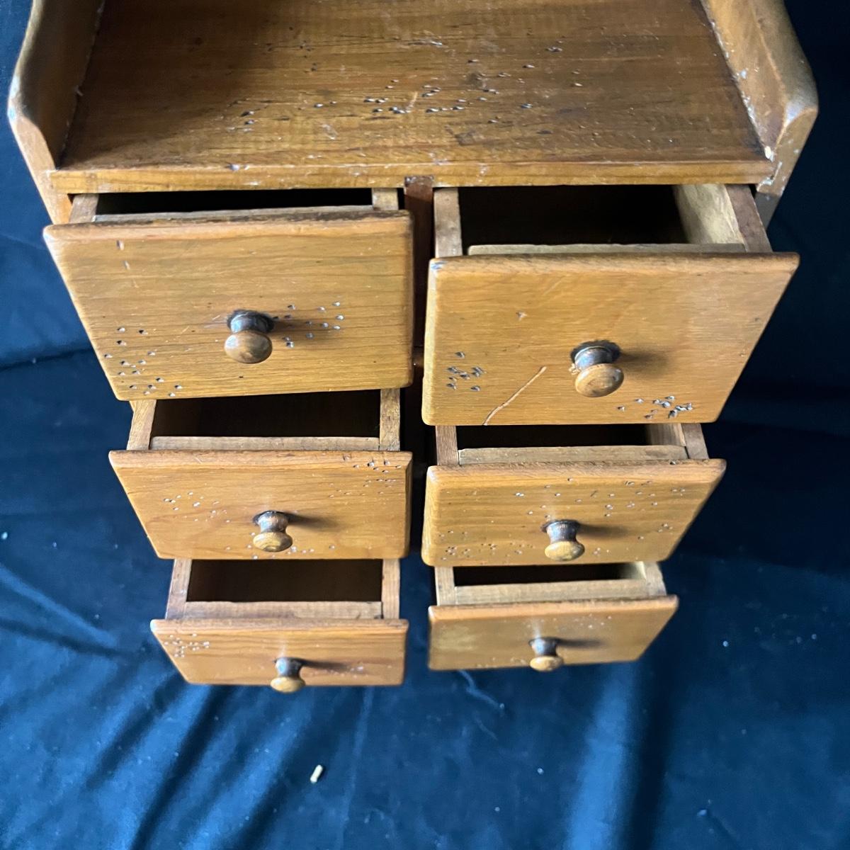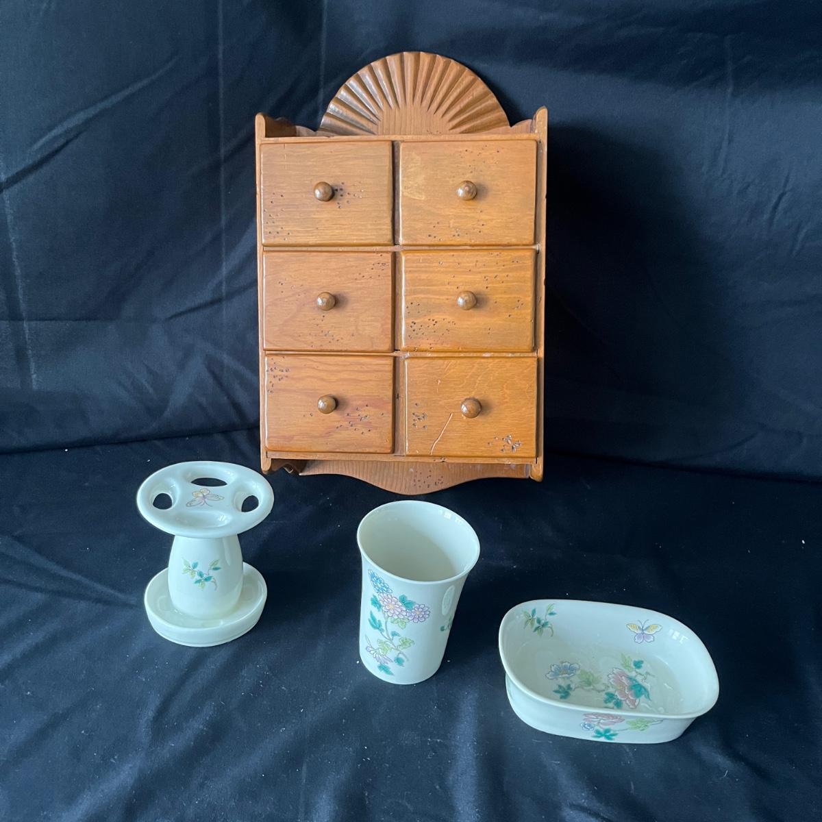Lot contains a farmhouse small wooden shelf with six drawers and a soap dish, cup and toothbrush holder by Cho Cho Takahashi. Shelf measures 8” x 4” x 13”H.