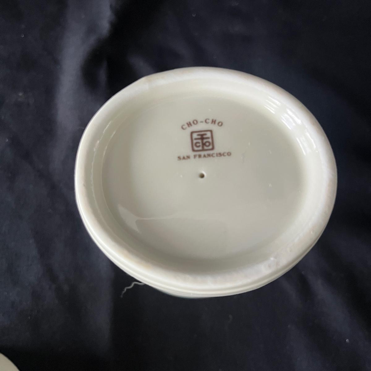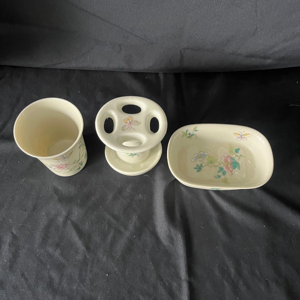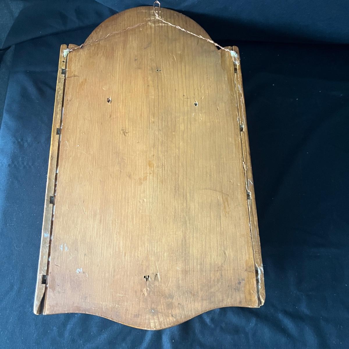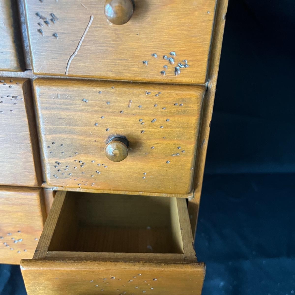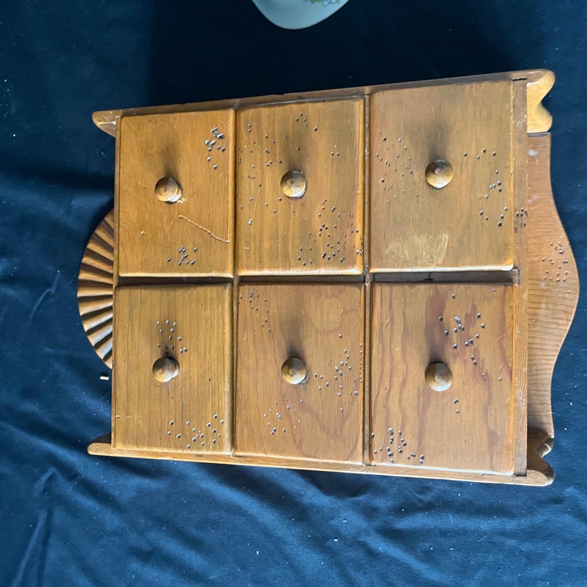 Lot contains a farmhouse small wooden shelf with six drawers and a soap dish, cup and toothbrush holder by Cho Cho Takahashi. Shelf measures 8” x 4” x 13”H.