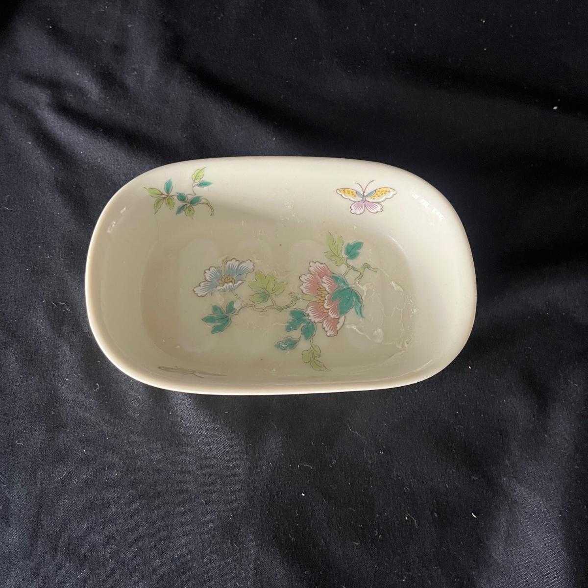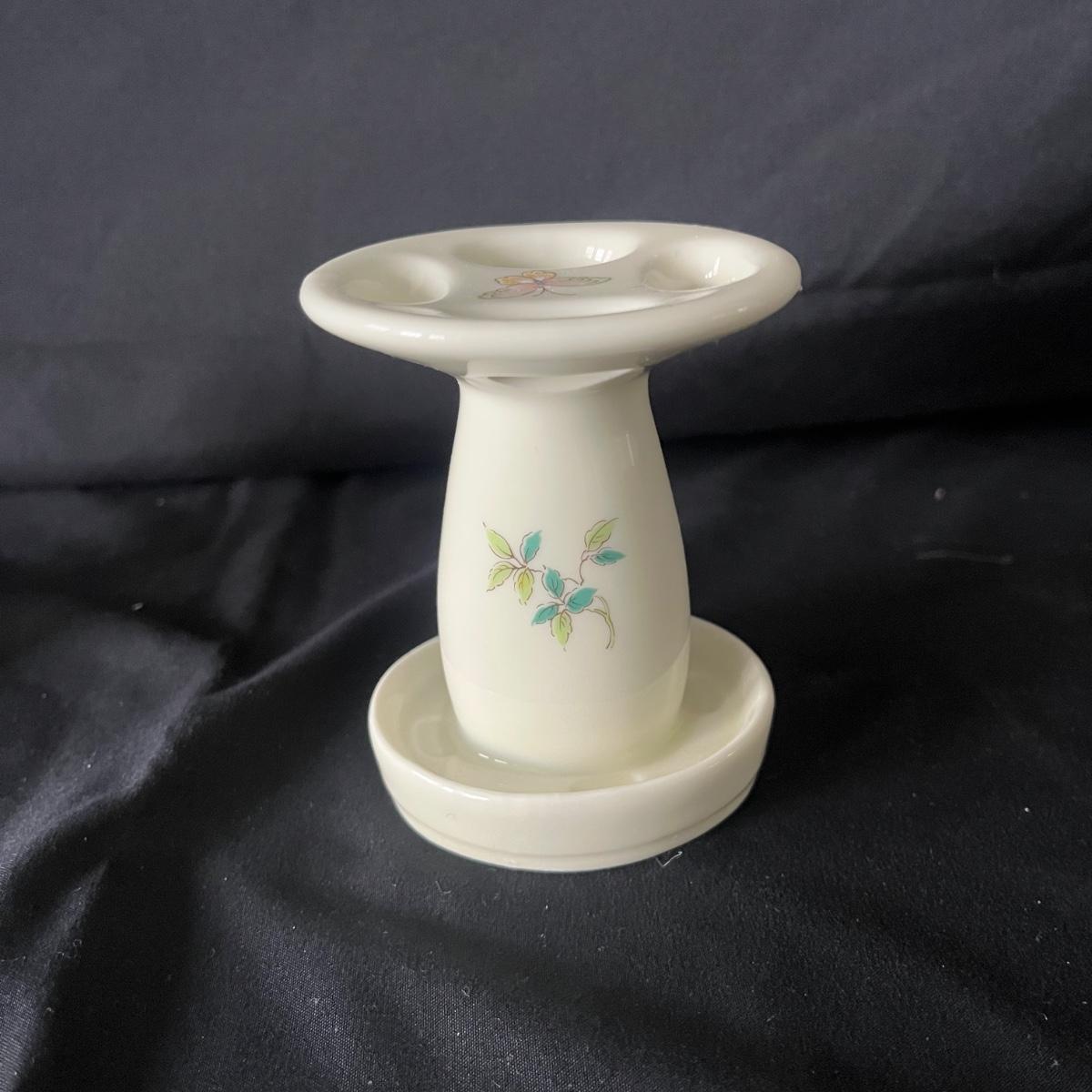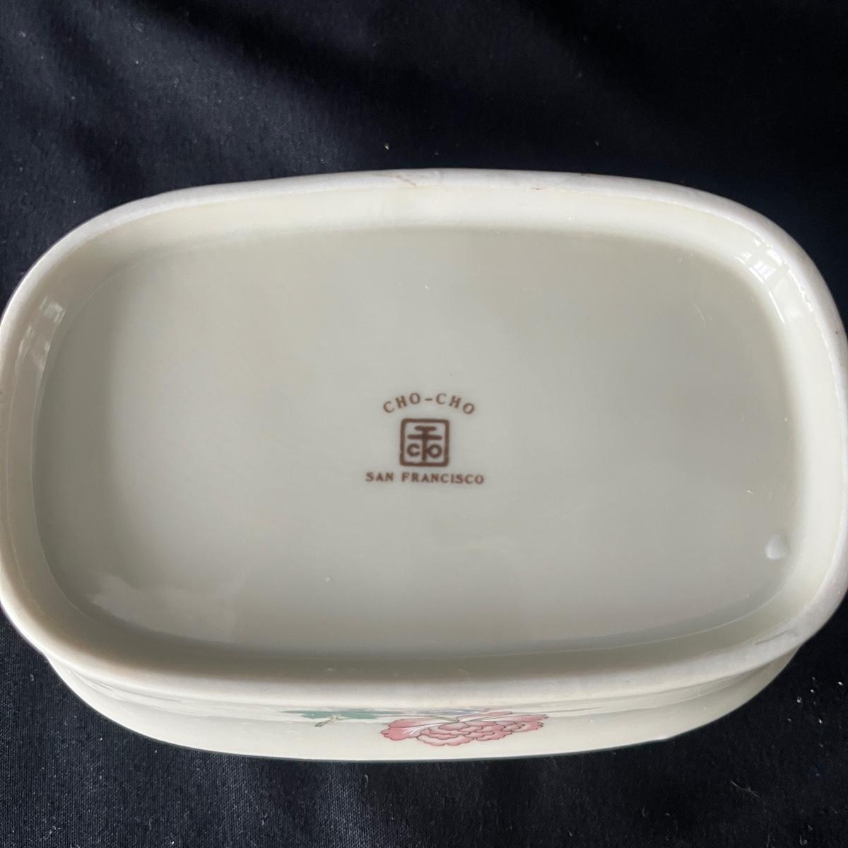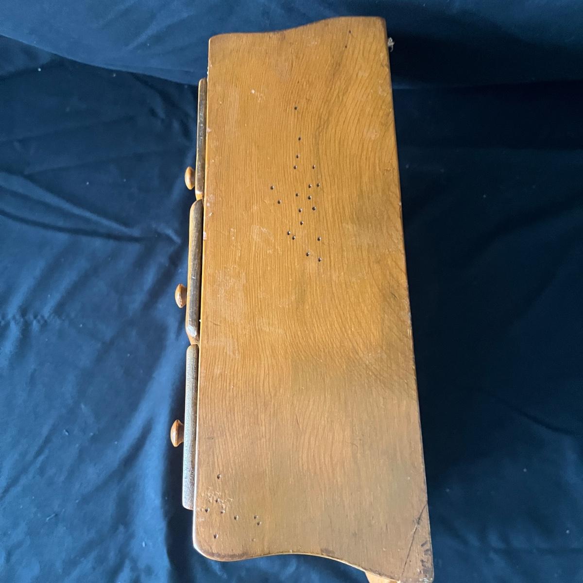 Lot contains a farmhouse small wooden shelf with six drawers and a soap dish, cup and toothbrush holder by Cho Cho Takahashi. Shelf measures 8” x 4” x 13”H.