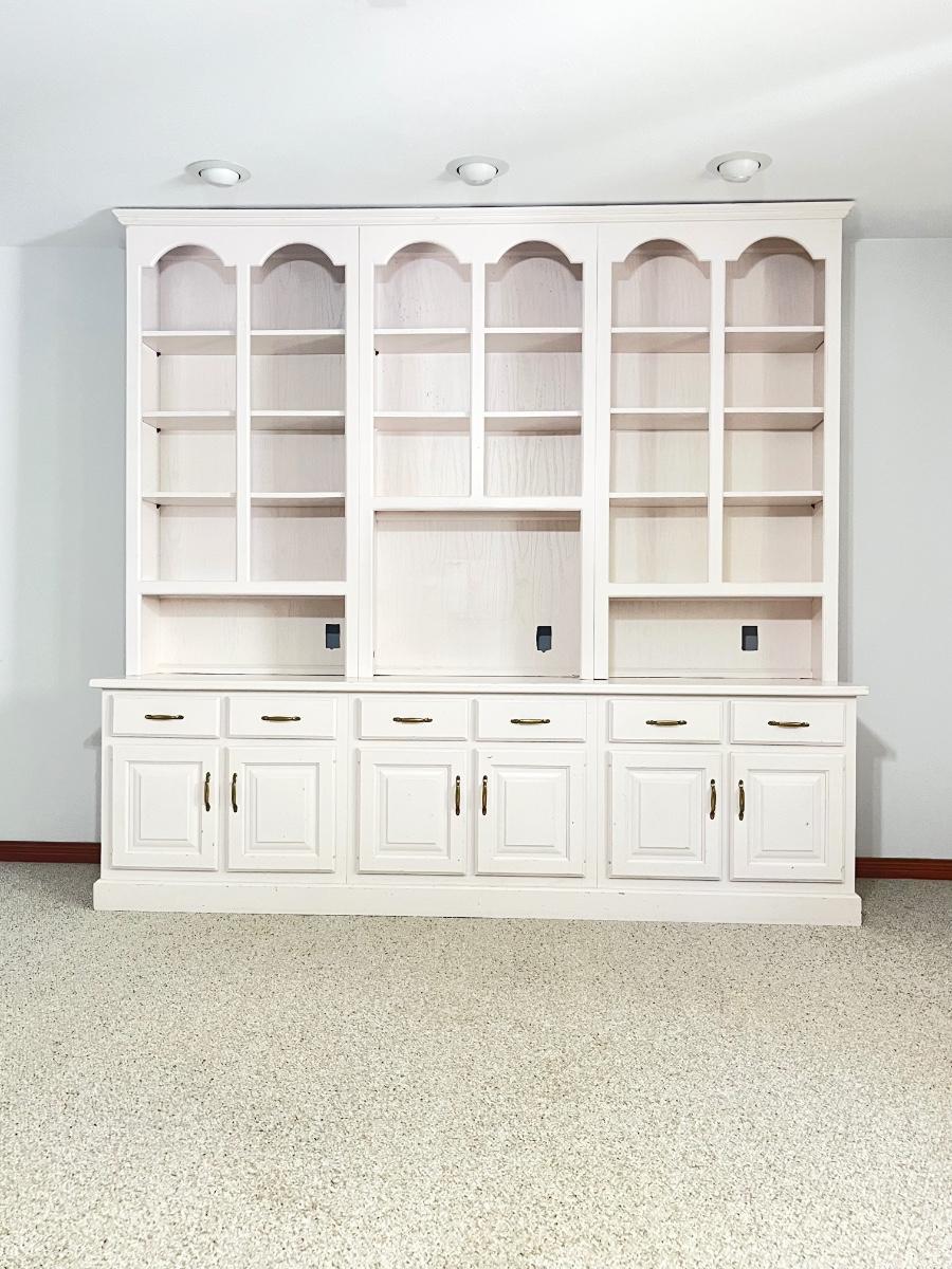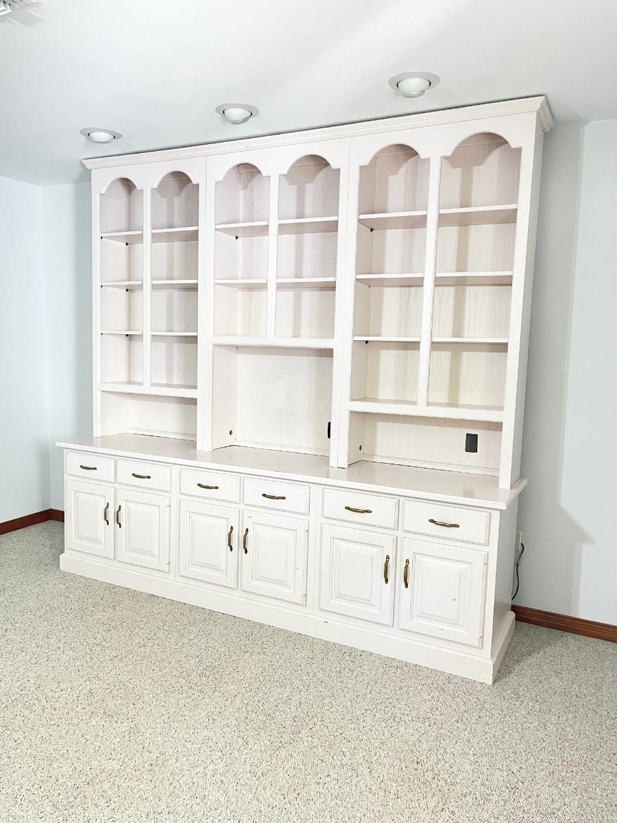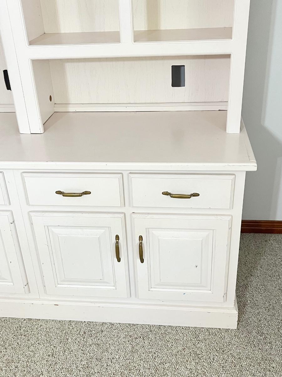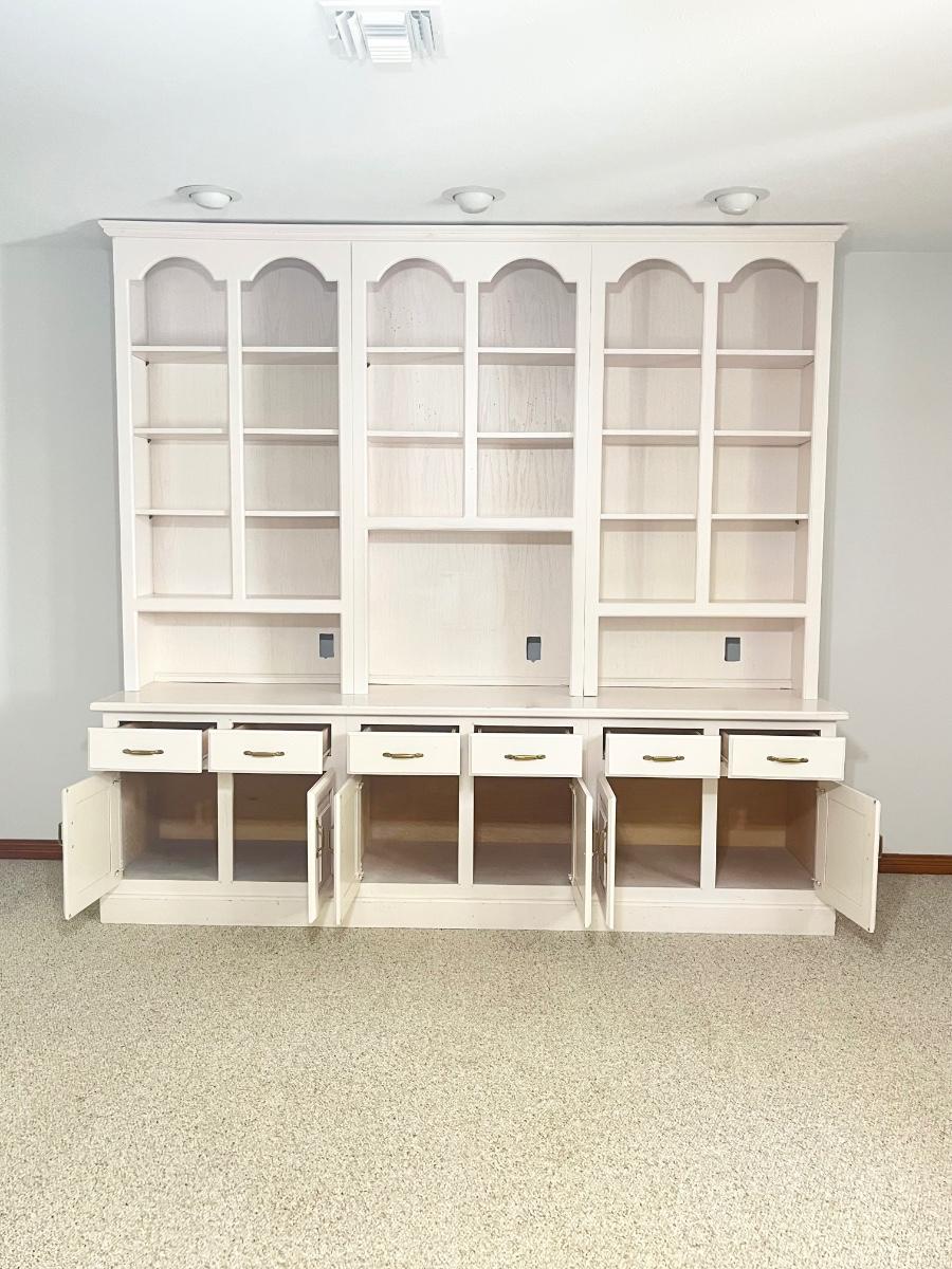 The color of this piece is not painted white. It is a very pale pink ~ This piece is custom built with 6 pieces ~ Pieces have been put together to make this large unit ~ It has a molding that joins them together at the top ~ This Unit will be dismantled into 6 sections at pickup. The molding on the top will be removed and it will be up to the new owner to either use it separately or re-assemble.~ Unit as shown is 96” H x 101” W x 23” D ~ Top 65” H x 99” W x 12” D ~ Bottom 31” H x 101” W x 23” D ~ Custom Built ~ Drawers slide easily & shelves are adjustable ~ Well used and could use new paint or hit with a sander to be distressed. Inside measurements where the tv would sit is 31 x 23