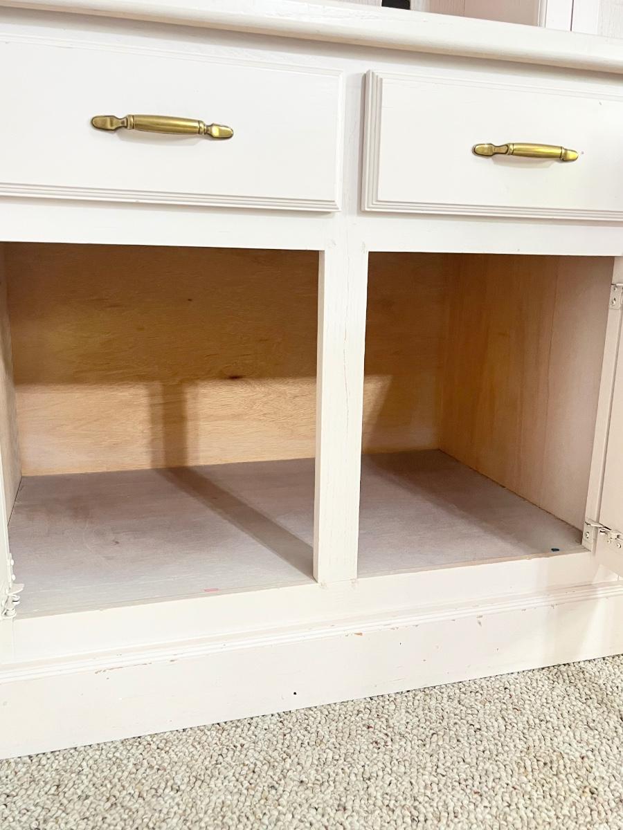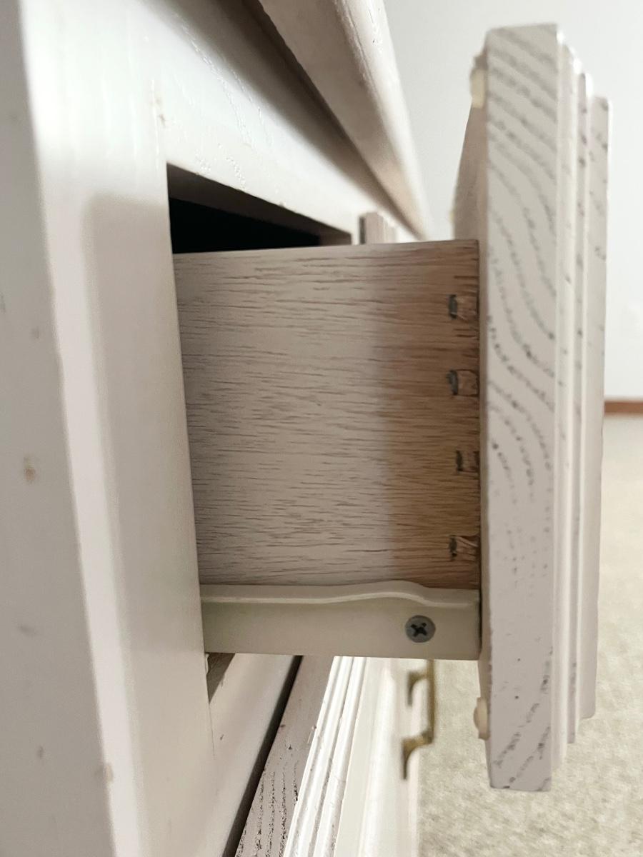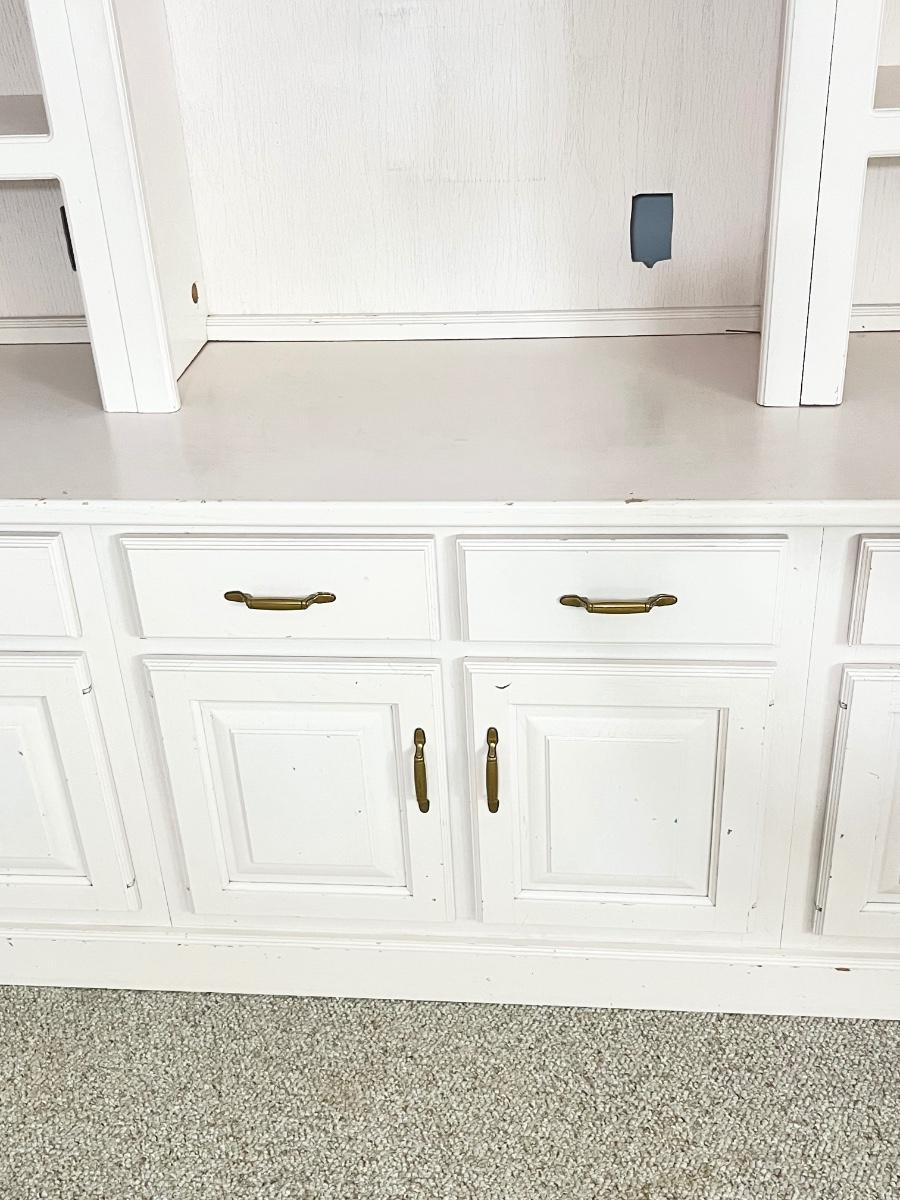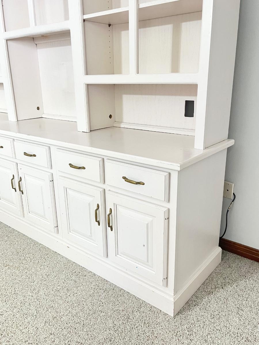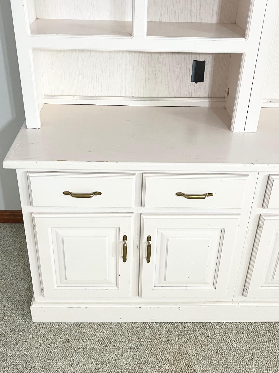 The color of this piece is not painted white. It is a very pale pink ~ This piece is custom built with 6 pieces ~ Pieces have been put together to make this large unit ~ It has a molding that joins them together at the top ~ This Unit will be dismantled into 6 sections at pickup. The molding on the top will be removed and it will be up to the new owner to either use it separately or re-assemble.~ Unit as shown is 96” H x 101” W x 23” D ~ Top 65” H x 99” W x 12” D ~ Bottom 31” H x 101” W x 23” D ~ Custom Built ~ Drawers slide easily & shelves are adjustable ~ Well used and could use new paint or hit with a sander to be distressed. Inside measurements where the tv would sit is 31 x 23