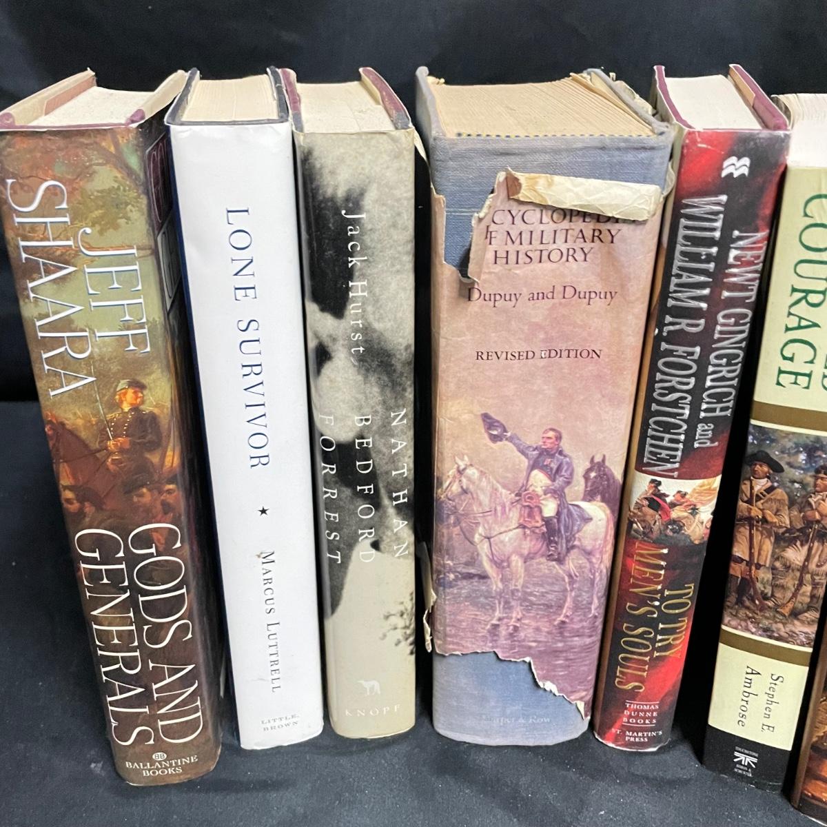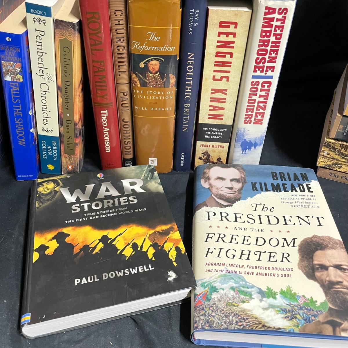 A large array of historical fiction and nonfiction ranging from the founding of the United States to Great Britain’s royalty to Abraham Lincoln and Genghis Khan. Both paperback and hardcover can be found in this lot. Lot also includes a vintage paper portrait of FDR that measures 12” x 16”. See images for lot titles. Shipping available.