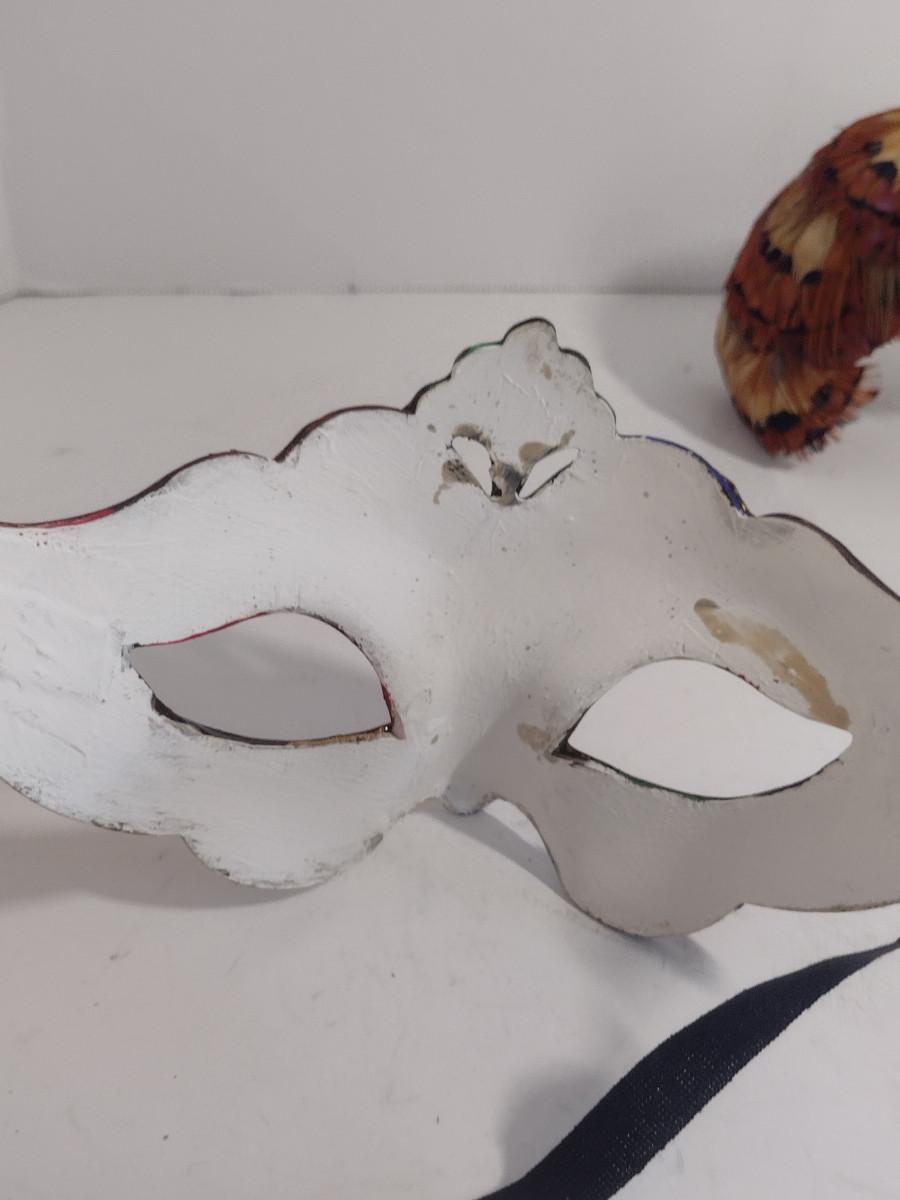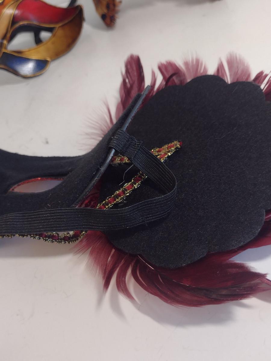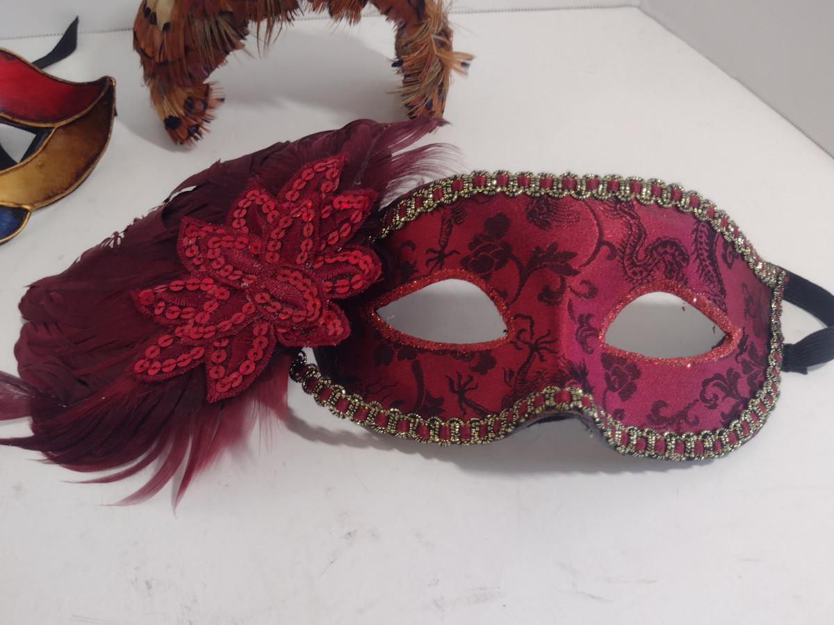 Fashion Accessories- Two Mardi Gras Masks and Vintage Pheasant Feather Hat. Red mask needs feather and edging glued back on.