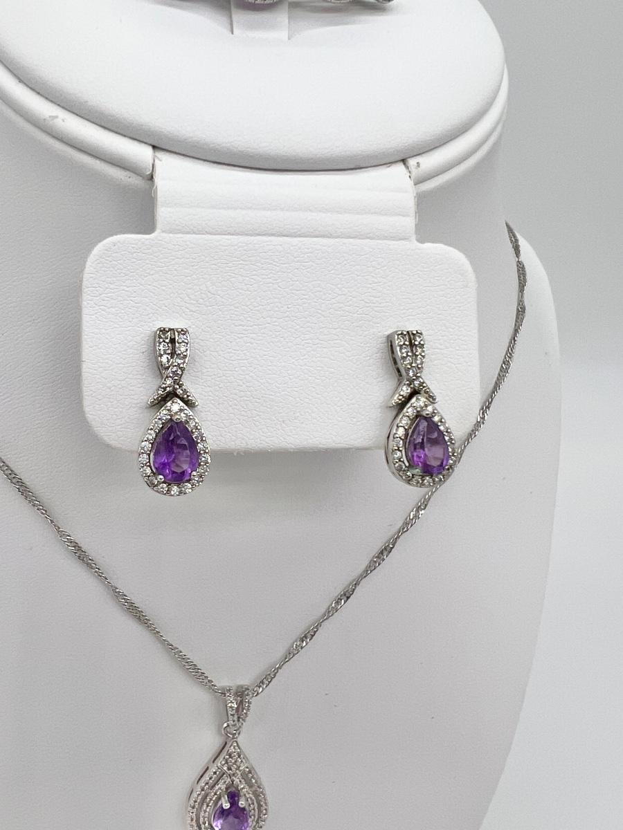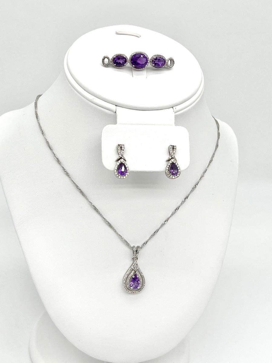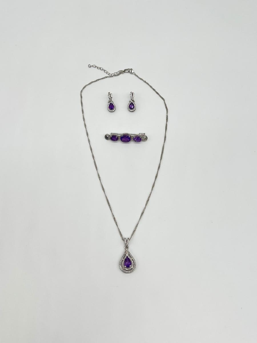 925 / FASHION ~ Amethyst Earring, 18" Necklace & Brooch Set