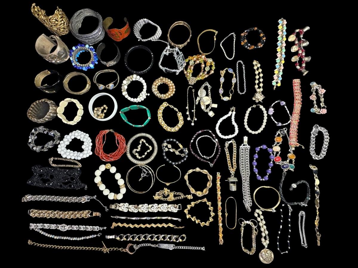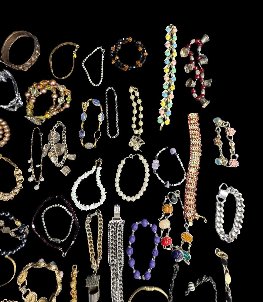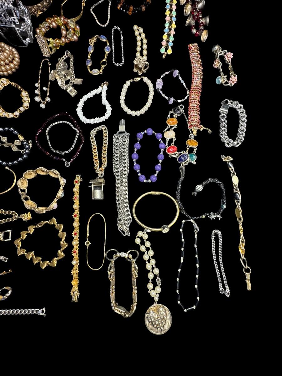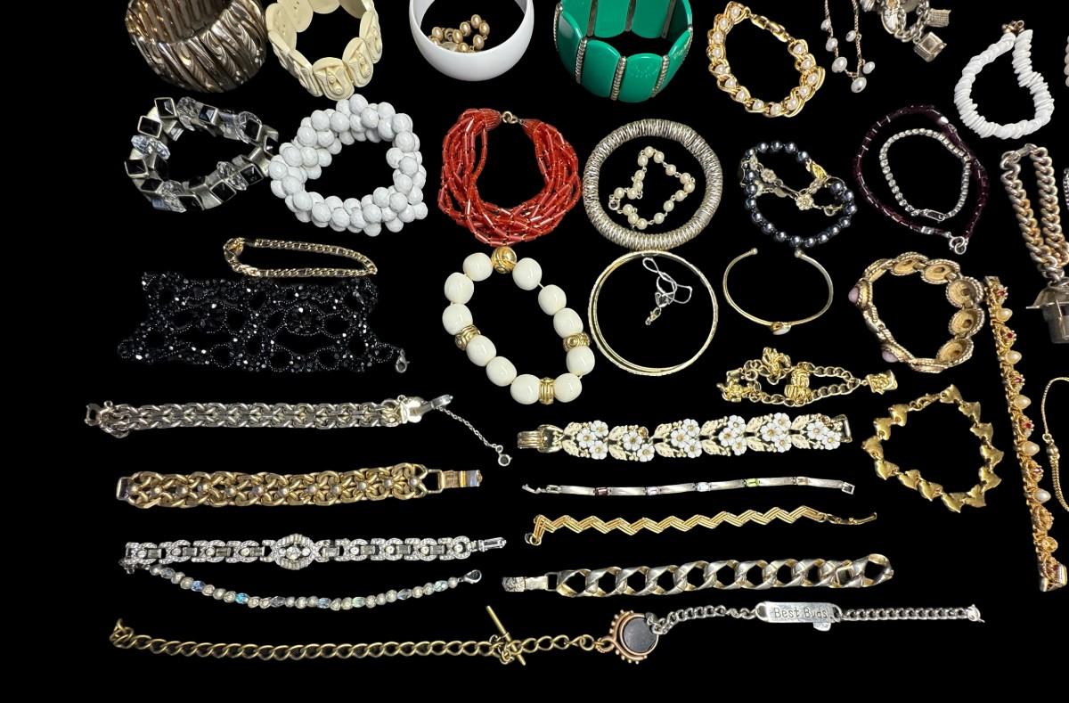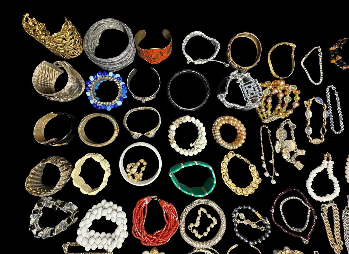 Includes gold tone, silver tone, beads, stones, faux pearls, and more. Styles include cuff, bangle, chain, and others. Total of 40+ pieces. [BK]