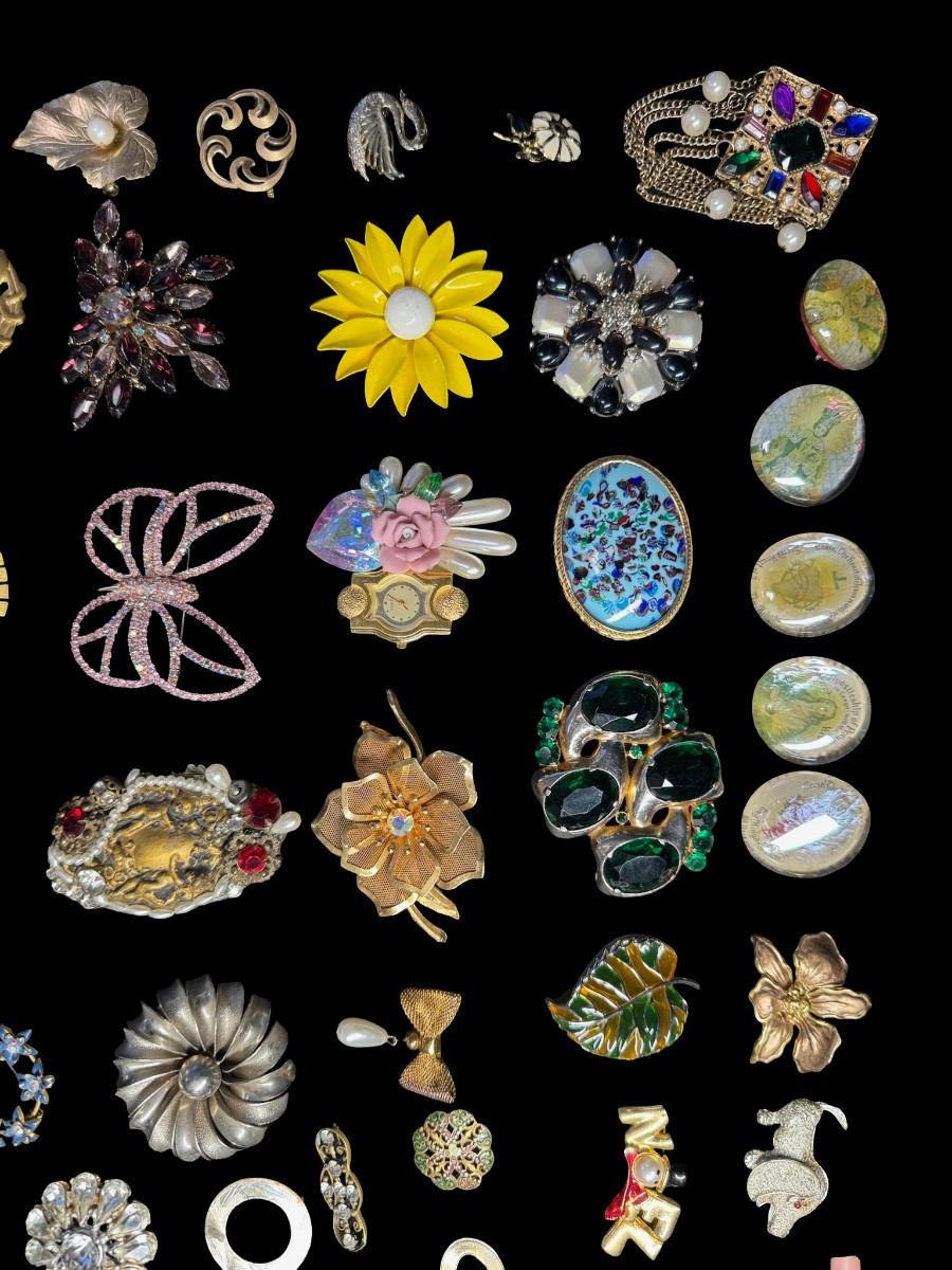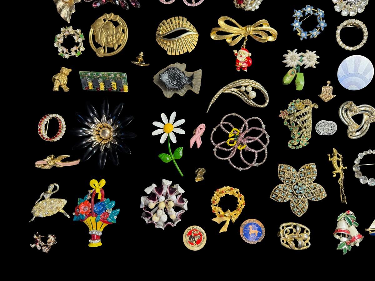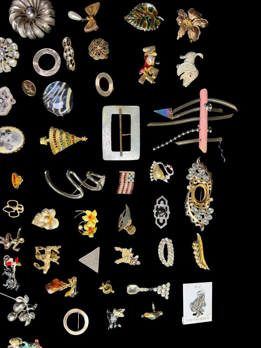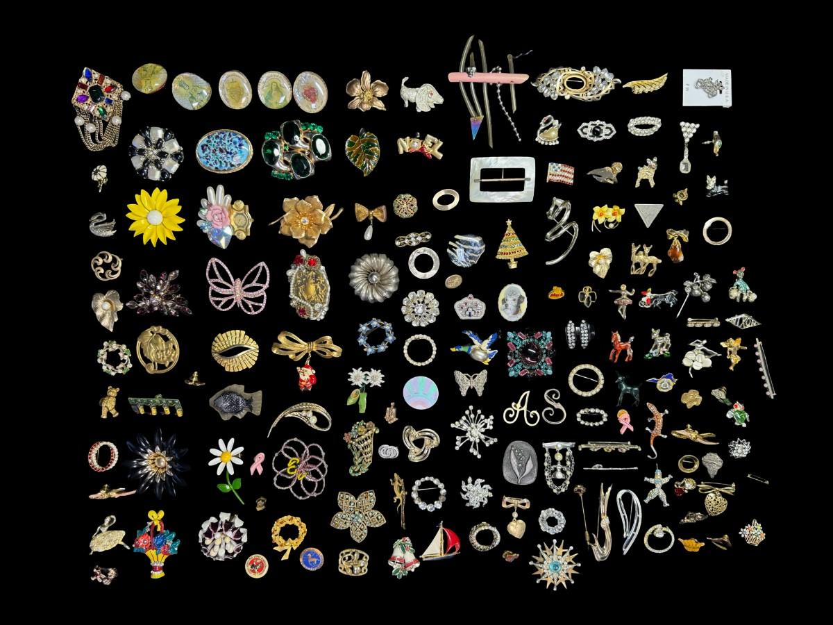 Includes gold tone, silver tone, beads, stones, religious, patriotic, seasonal, and more. Total of 100+ pieces. [BK]